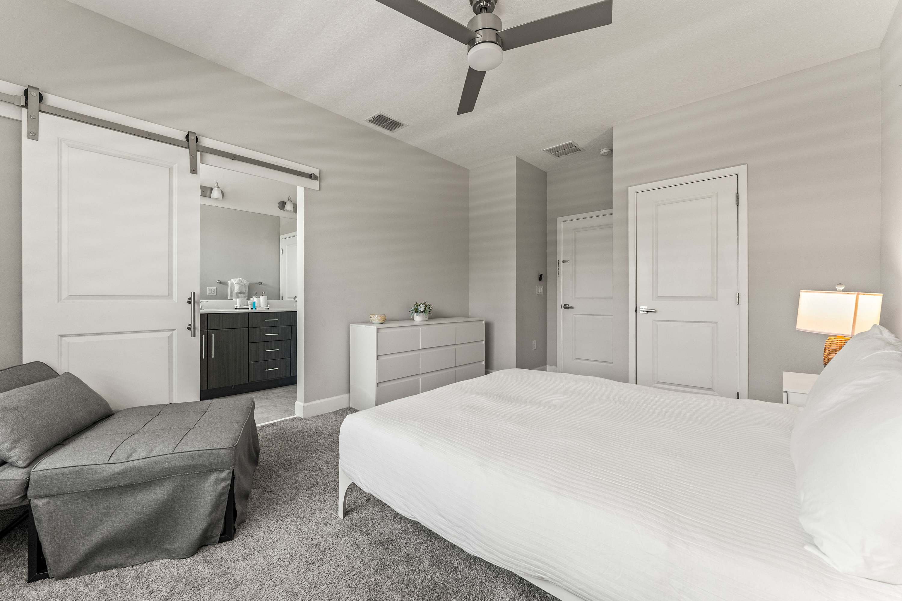Bedroom #2 includes a queen size bed, a smart TV, a reclining ottoman, and an ensuite bathroom with a dual vanity and a walk-in shower.