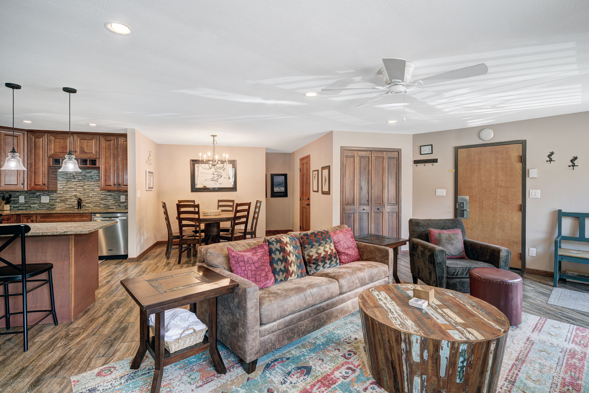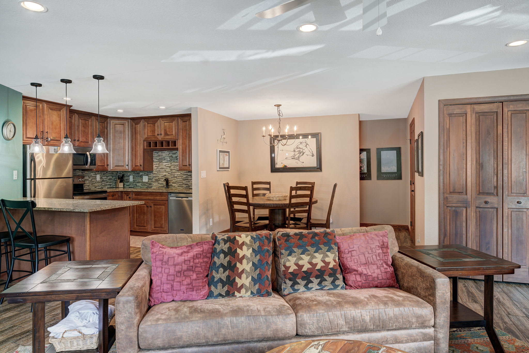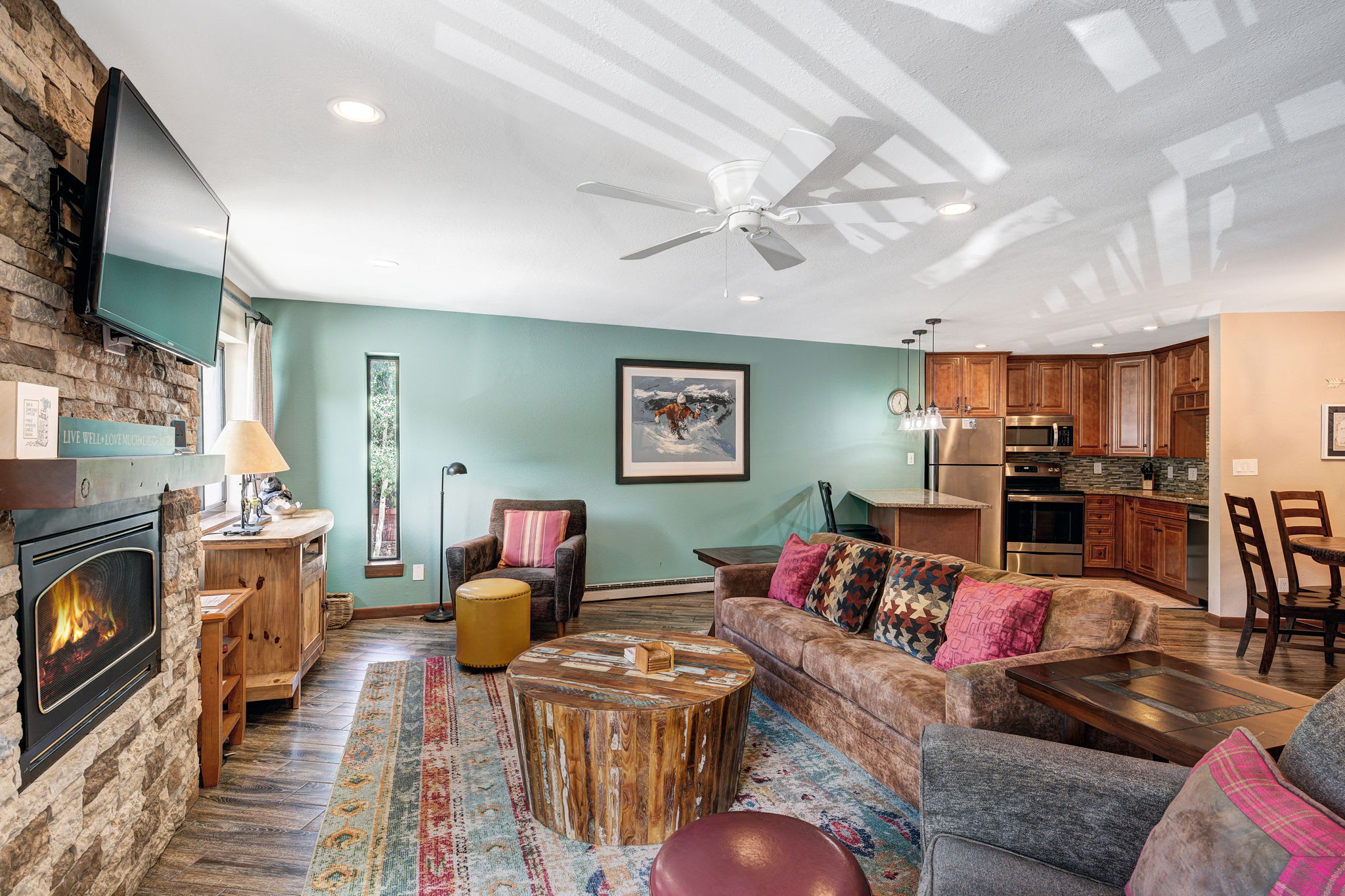 Settle into a comfortable 1,200 sq ft, 2nd-floor condo designed for easy mountain days and relaxed evenings. The living area offers a cozy gas fireplace, Smart TV, and a sleeper sofa for extra guests. A full kitchen with granite countertops and stainless-steel appliances makes meals simple between runs or hikes, and an in-unit washer and dryer help keep gear fresh.