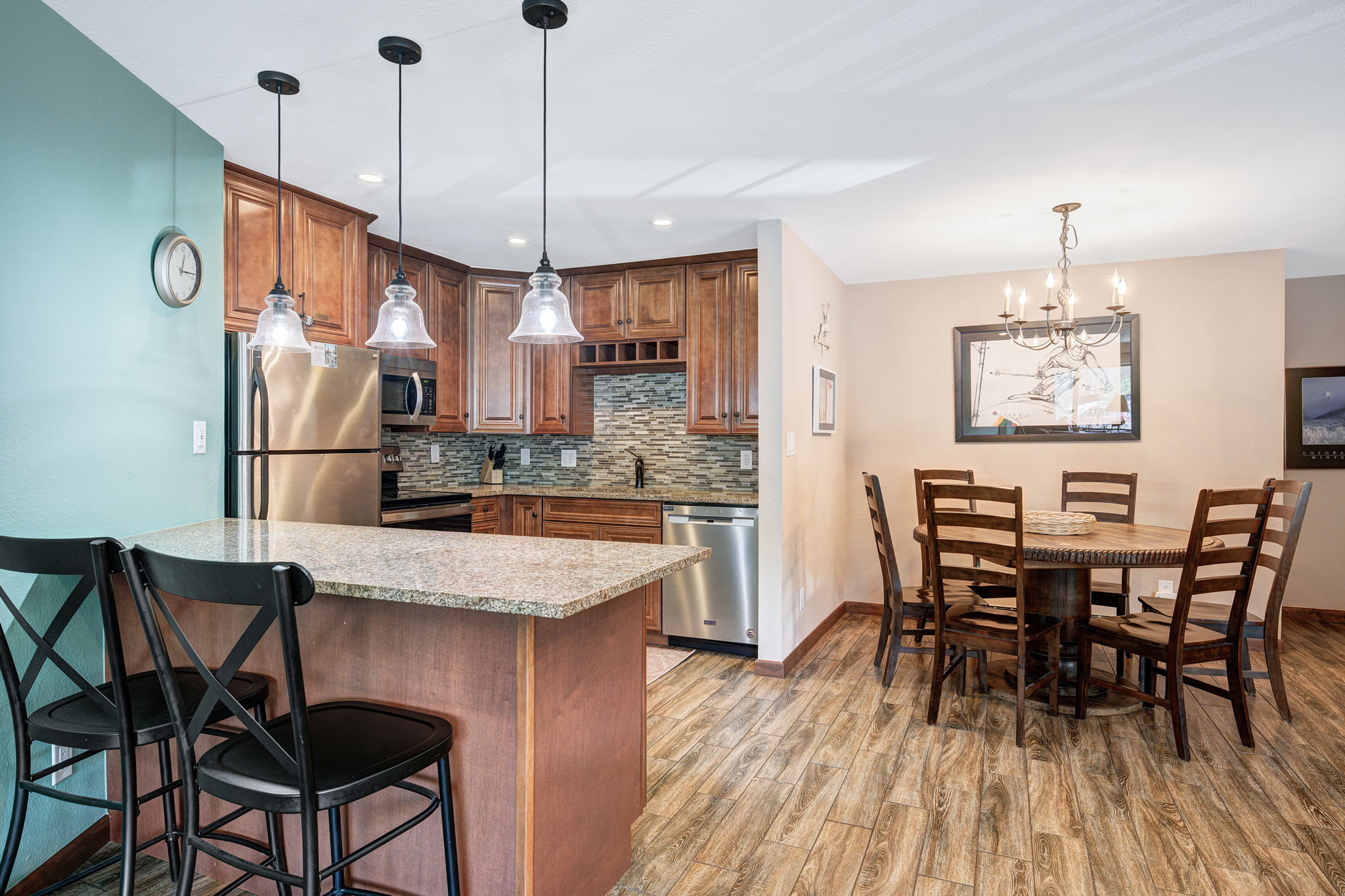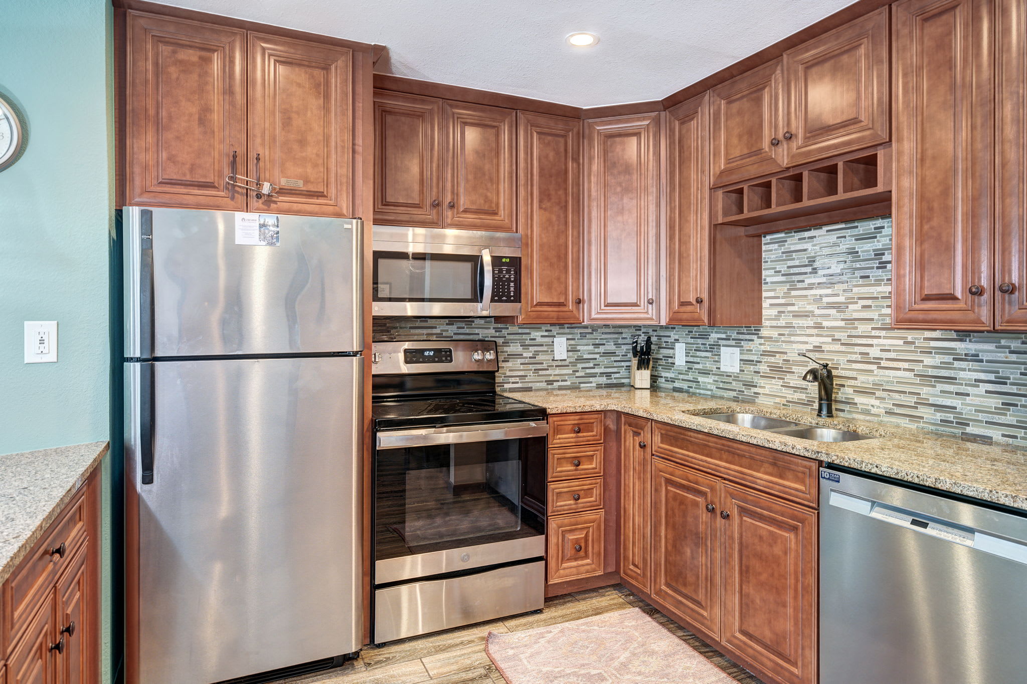 • Full kitchen with granite countertops and stainless-steel appliances.