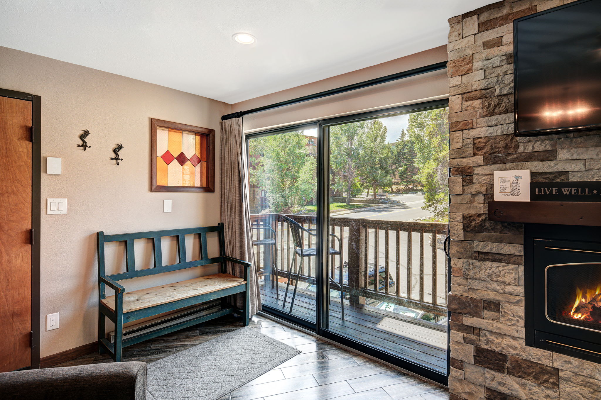 • Living Room: Sleeper sofa (sleeps 2), gas fireplace, Smart TV.