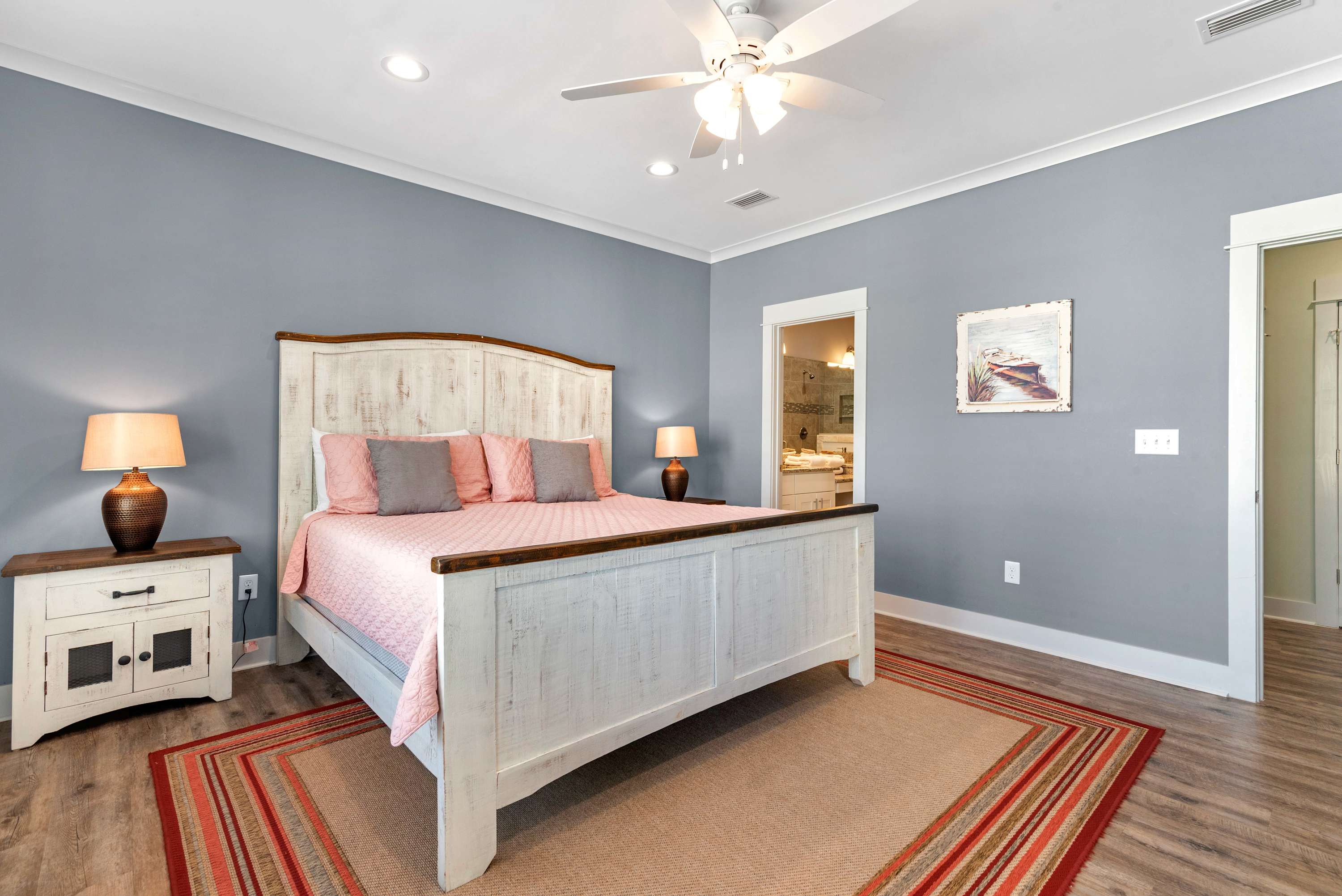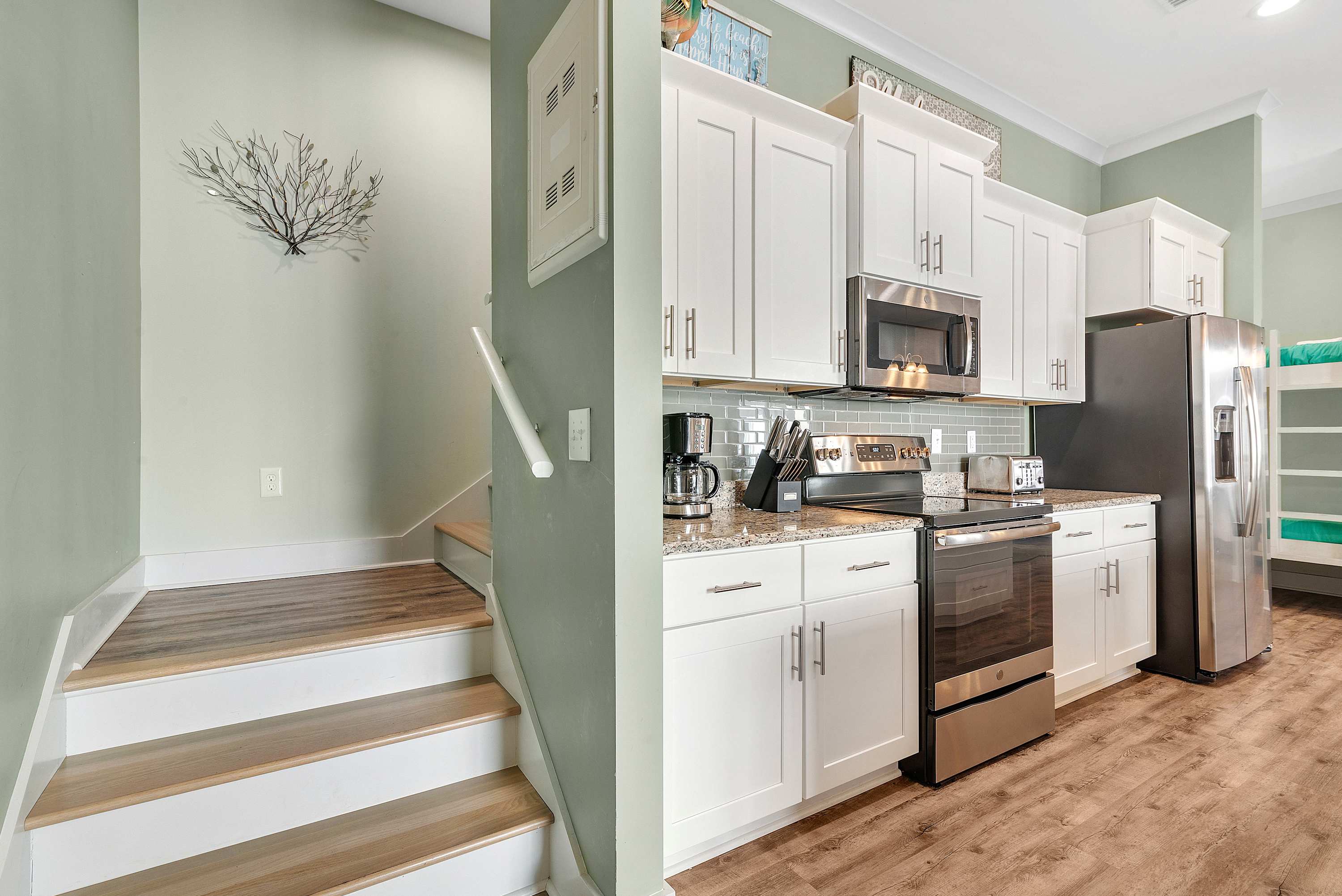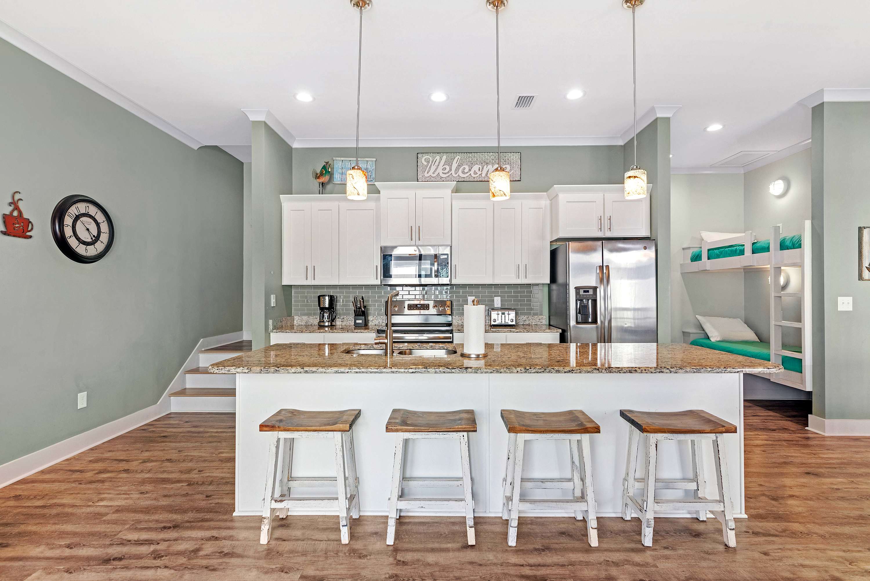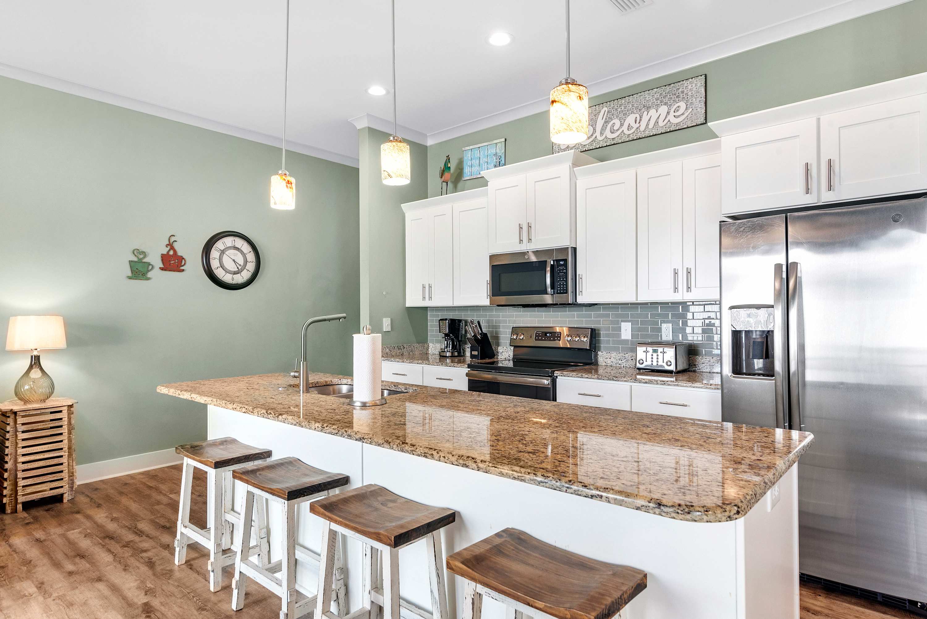Step inside Little Lagoon Cottage to an open, airy living space where a plush couch, two armchairs, and a smart TV invite you to relax after a day in the sun. Surrounded by luxury coastal décor, the fully equipped kitchen features sleek stainless steel appliances, generous counter seating for four, and an easy flow into the dining area with seating for four more. Whether you’re sipping coffee while the sun rises over the Gulf or winding down on the balcony with ocean breezes, every corner of this home is made for memorable moments.