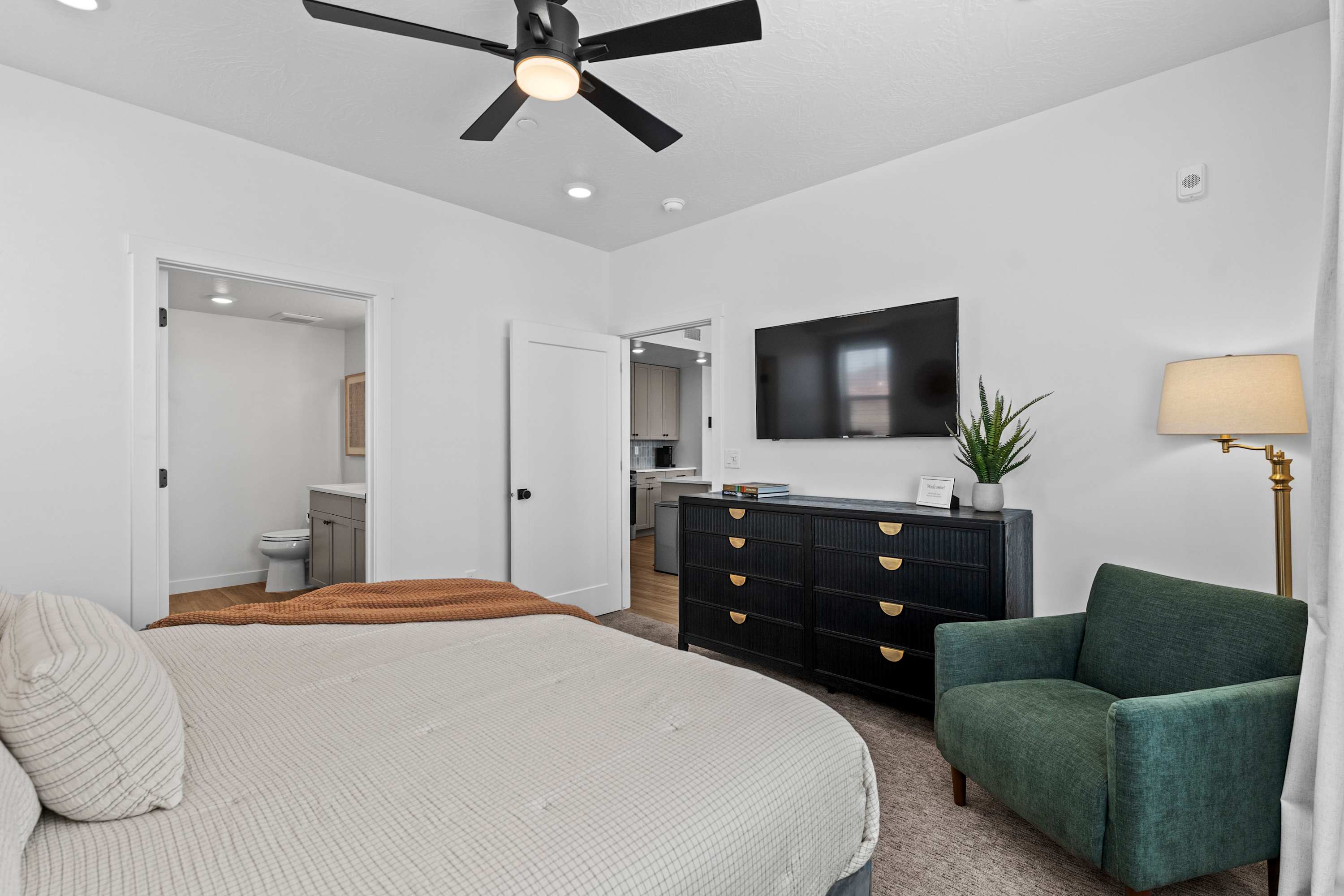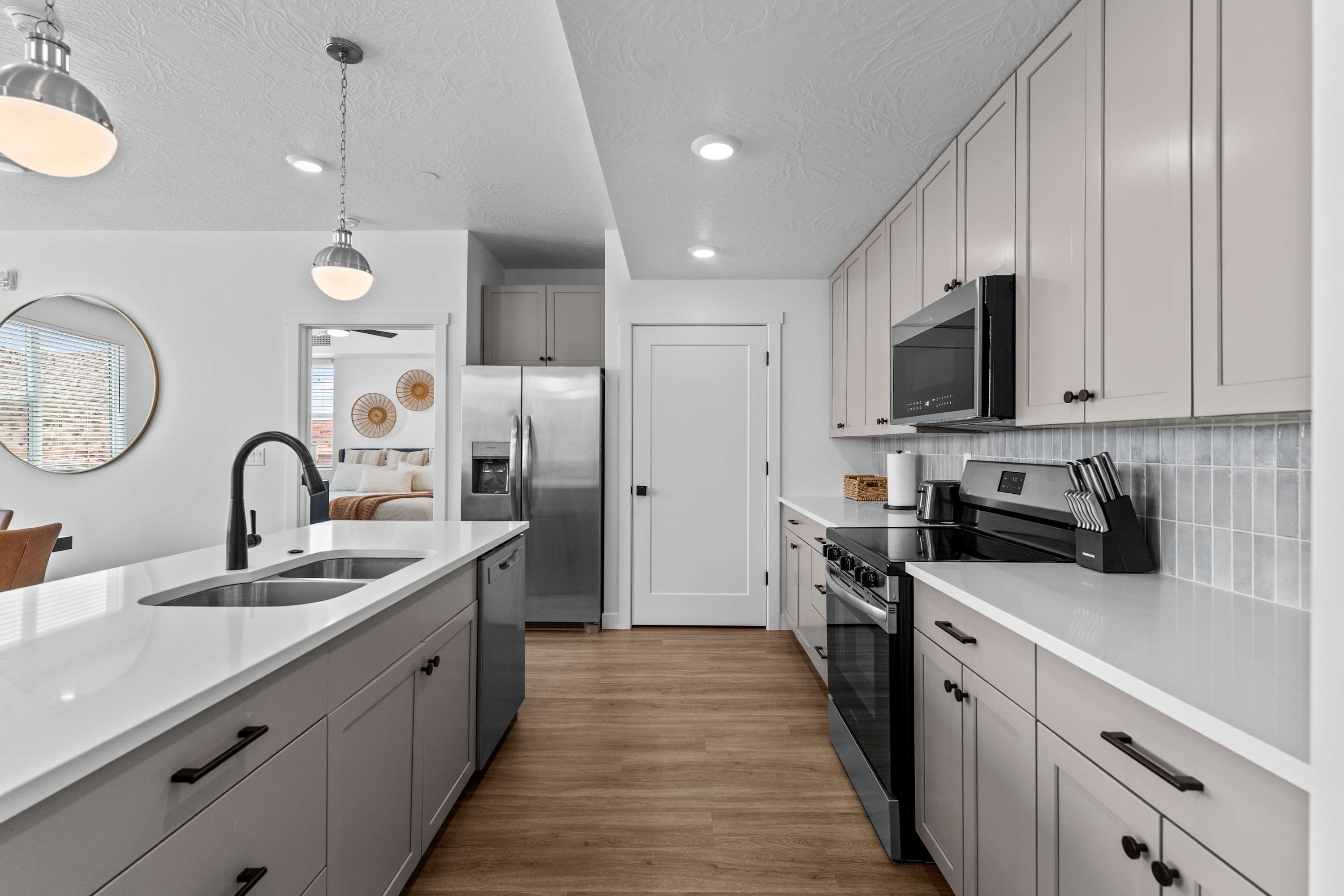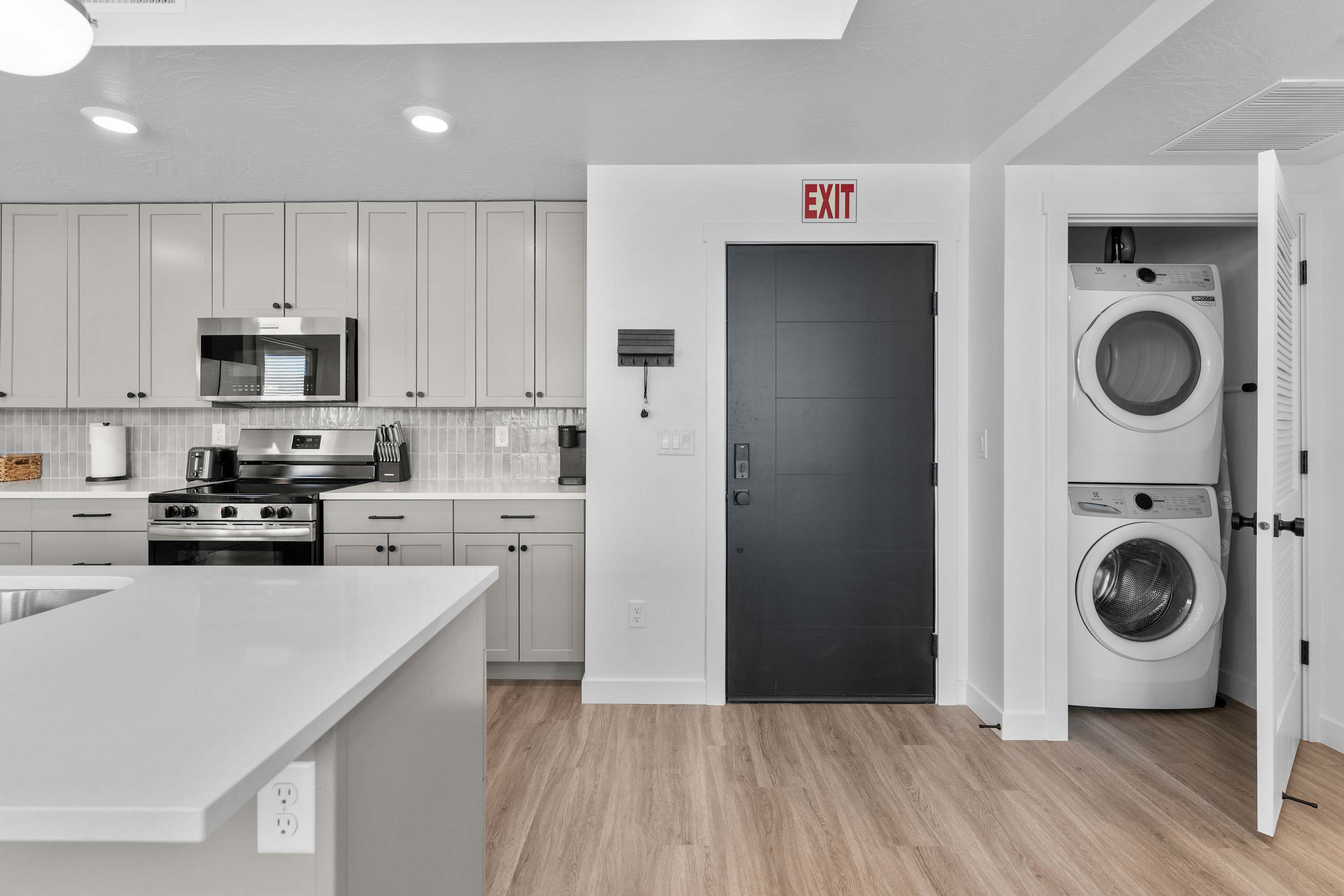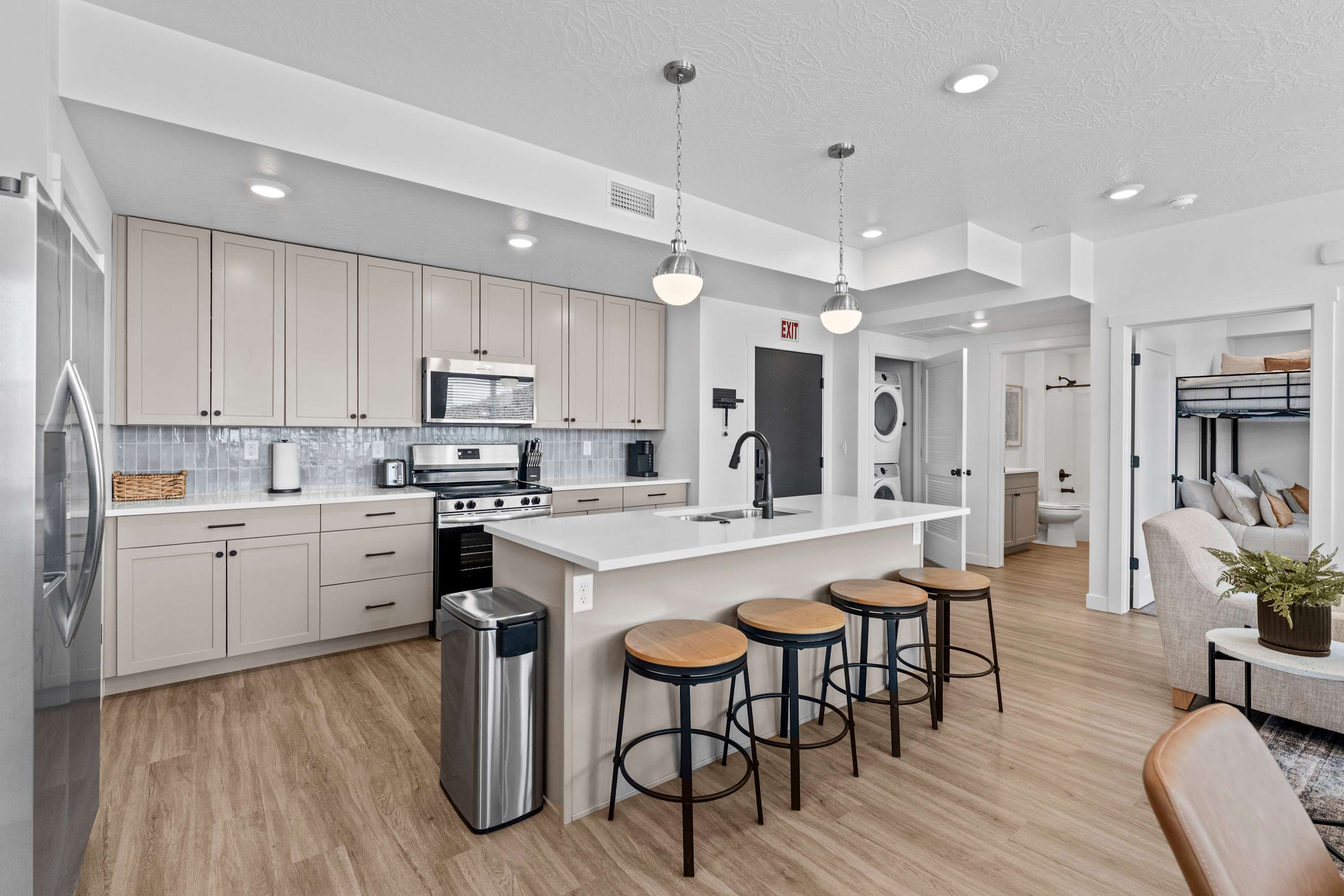 Inside Terra Vista, a bright and open space welcomes you with modern design and comfortable touches. The living room invites you to sink into the cozy sectional or armchair while streaming your favorite shows on the smart TV. Just steps away, the kitchen with stainless steel appliances and a Keurig coffee maker makes meal prep easy, complete with counter seating for four for casual mornings. When it’s time to dine, the table for four is perfect for shared meals. After a day of adventure, retreat to the bedrooms where room-darkening shades ensure a peaceful night’s sleep.