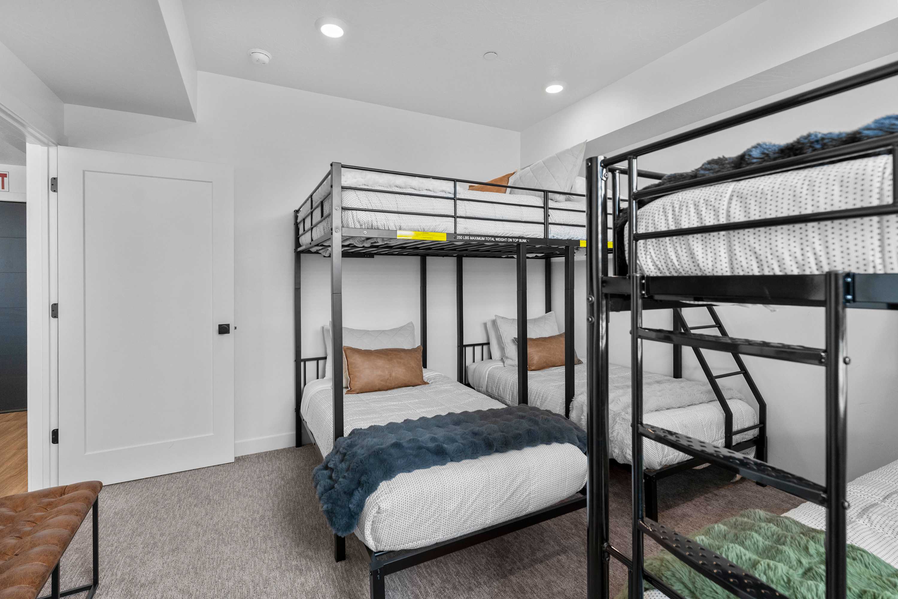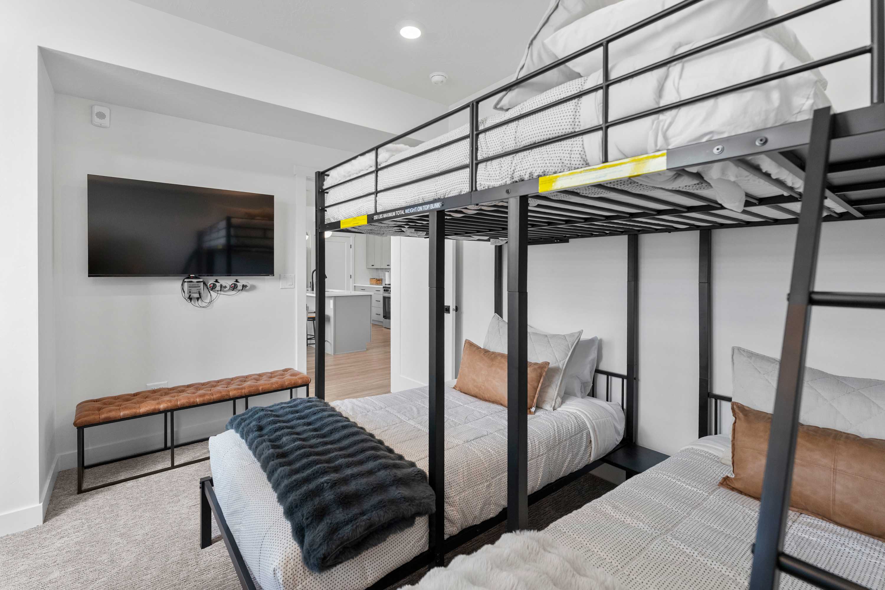 Bedroom #2 includes full-over-twin bunk beds (full size bed over 2 twin beds side-by-side), twin-over-twin bunk beds, and a smart TV.