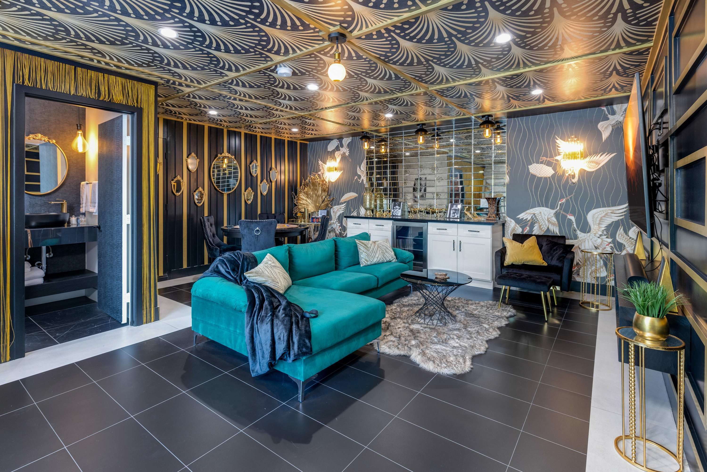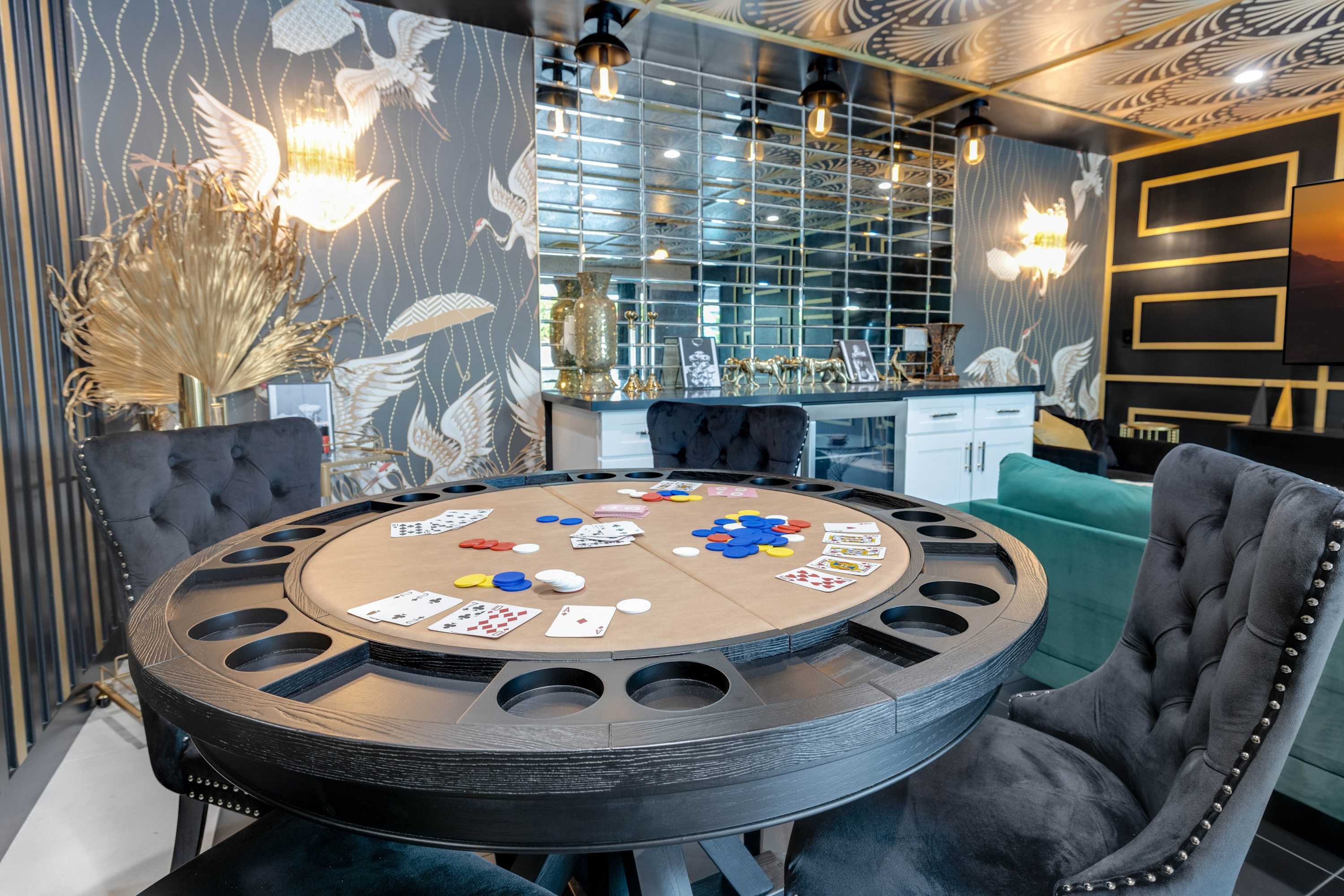 Step into a serene entryway that sets the tone for the entire space—chic, modern, and designed for comfort. The living room invites you to sink into a plush sectional or one of two armchairs while streaming your favorite shows on the smart TV. The spacious kitchen is a dream, complete with stainless steel appliances, a Nespresso coffee machine for your morning coffee, and counter seating for four, while the dining table for eight makes mealtimes a stylish affair. For evenings with friends, retreat to the home’s chic speakeasy bar, where you’ll find a poker table, smart TV, music, and even a high-top table for two—perfect for keeping the fun going indoors.