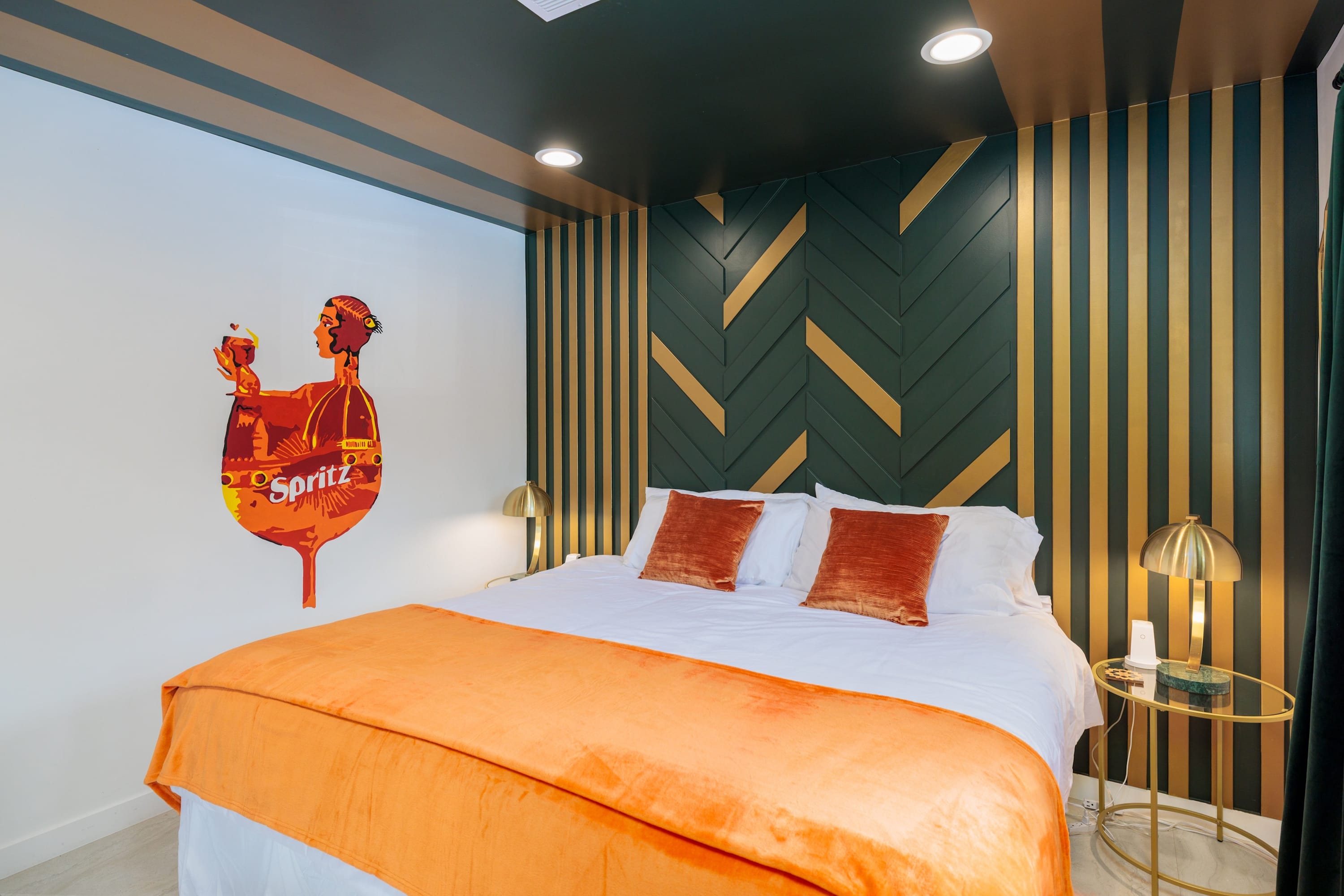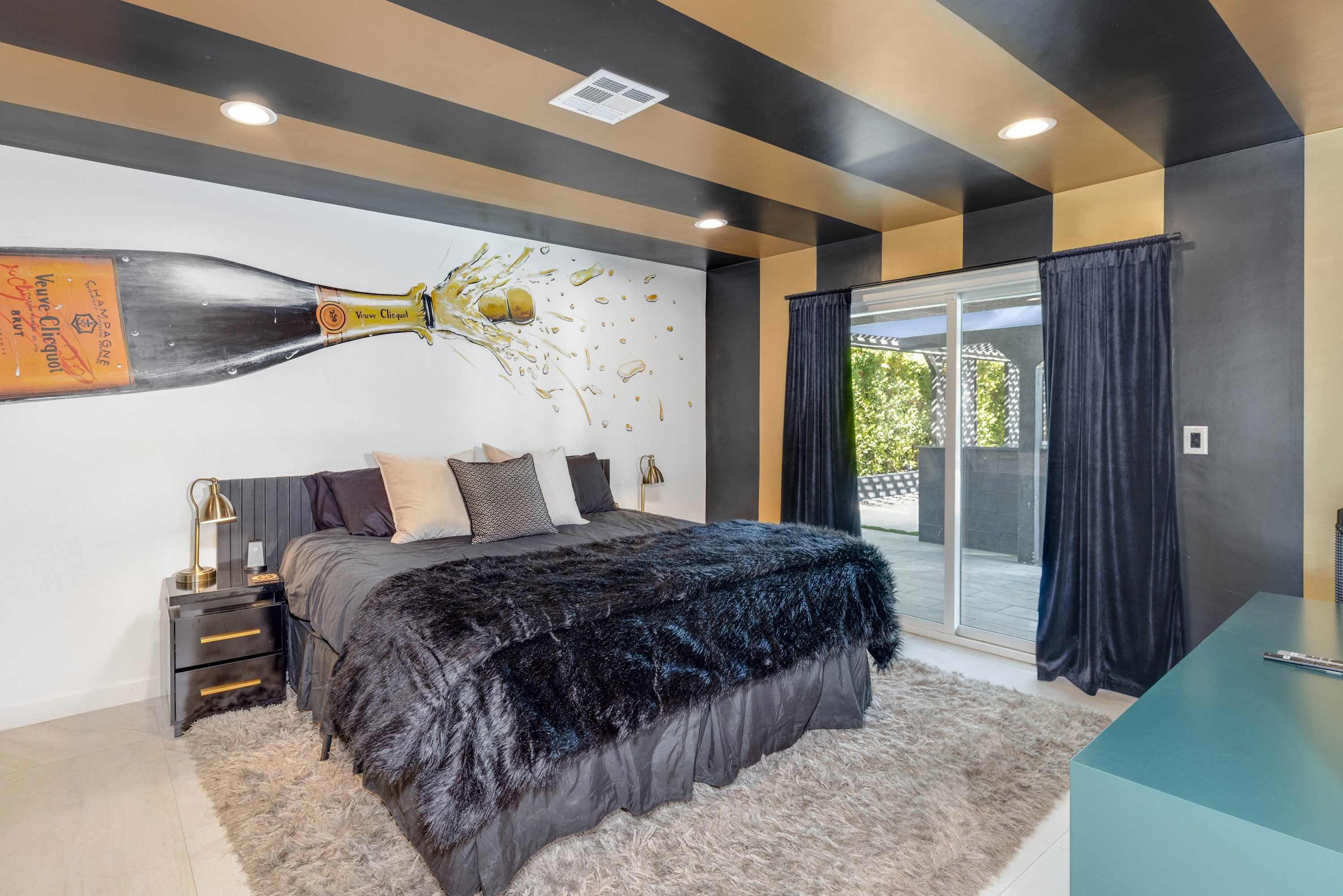Bedroom #1, The Champagne Room, includes a king size bed, a smart TV, patio and pool access, and an ensuite bathroom with a single vanity and a walk-in shower.