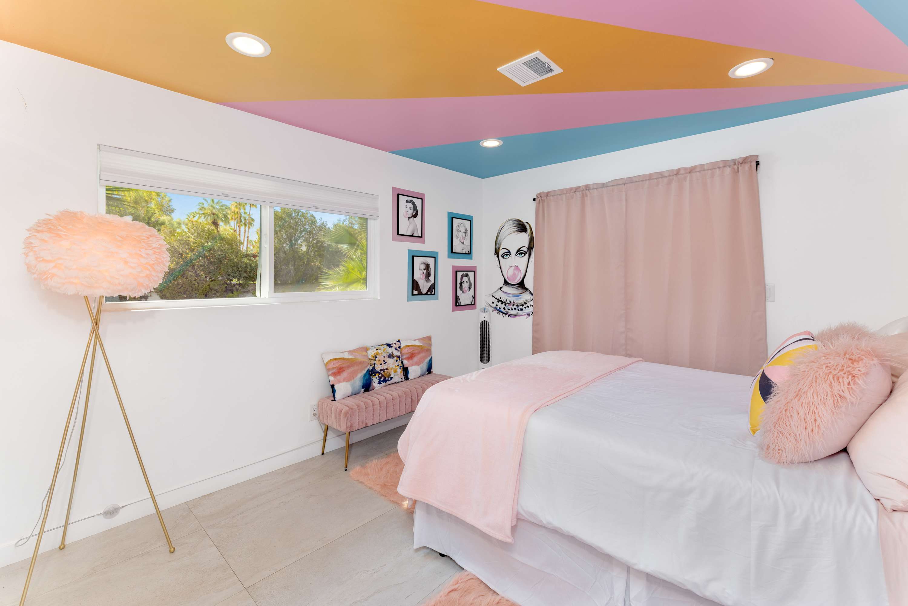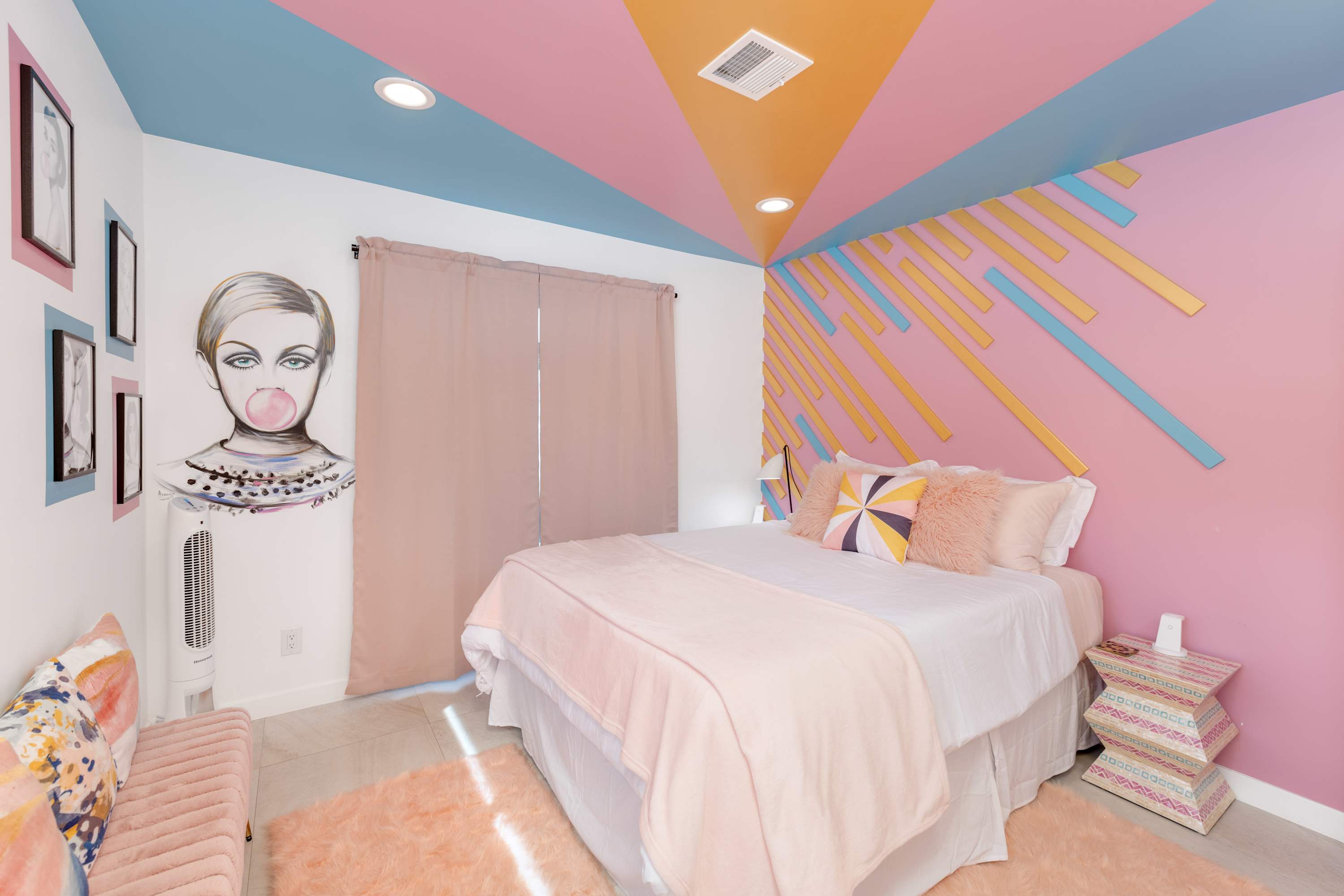 Bedroom #3, The Bubble Gum Room, includes a king size bed and private patio access.