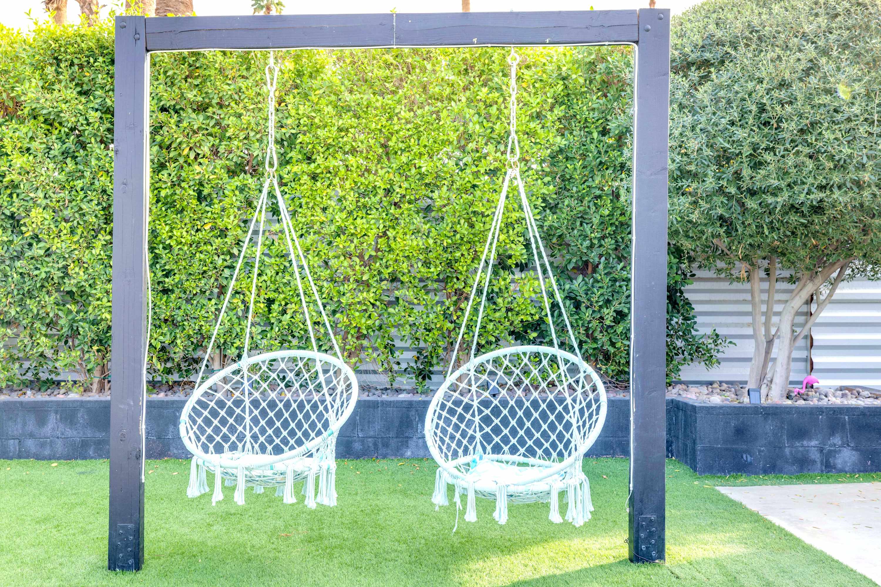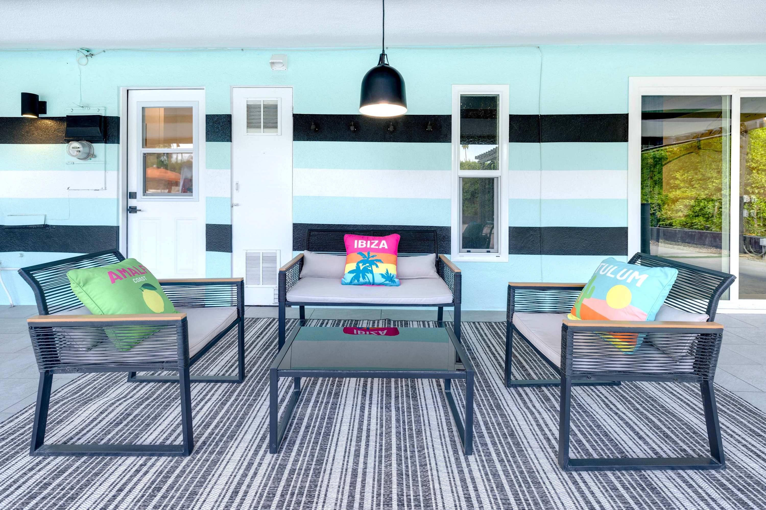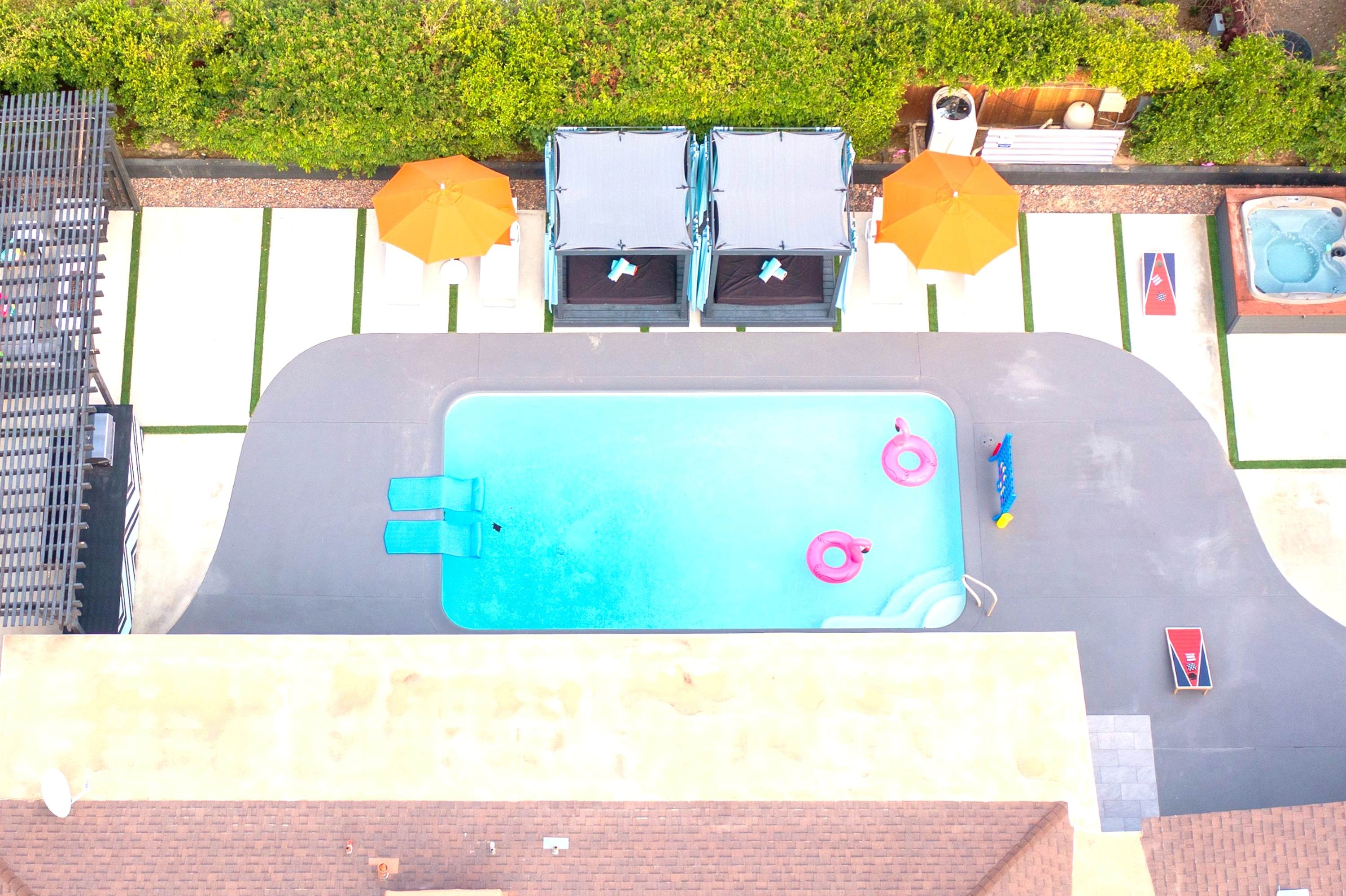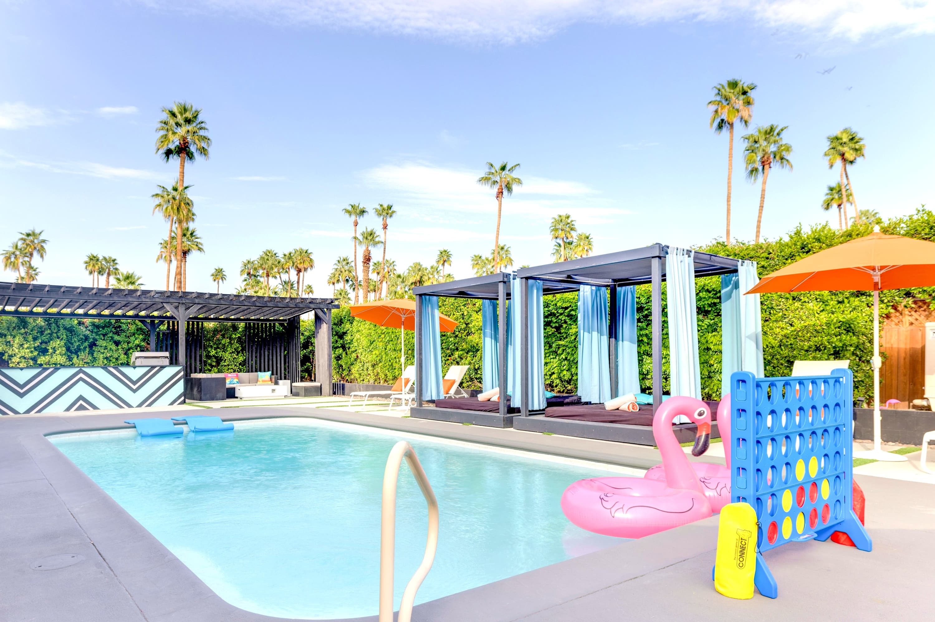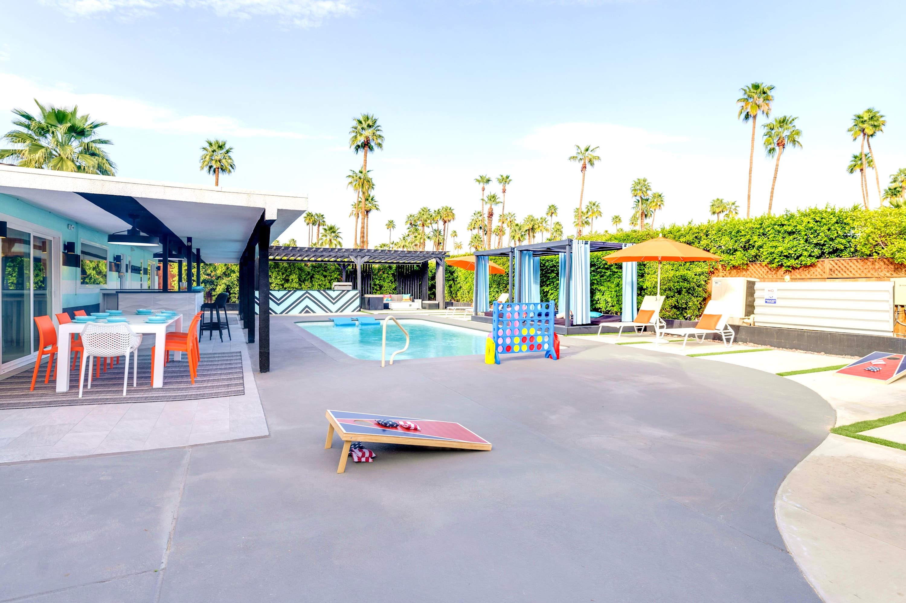 Outside, the home truly shines. The patio transforms into your private resort, featuring an outdoor covered bar with seating, a dining table for eight, and a grill for alfresco meals. Lounge in the cabanas by the pool, rinse off in the outdoor shower, or soak in the hot tub under the desert stars. Comfortable seating surrounds the firepit, while hammock swings, corn hole, and Connect 4 add a playful touch. With room-darkening shades in the bedrooms ensuring restful sleep, every detail of this home has been considered to create a perfect balance of relaxation, style, and fun.