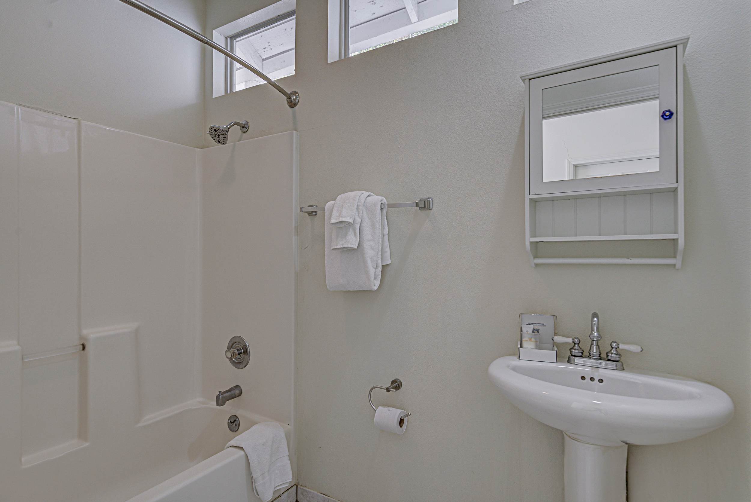 • Bathroom 1 (ensuite to primary): Shower/tub combo, pedestal sink