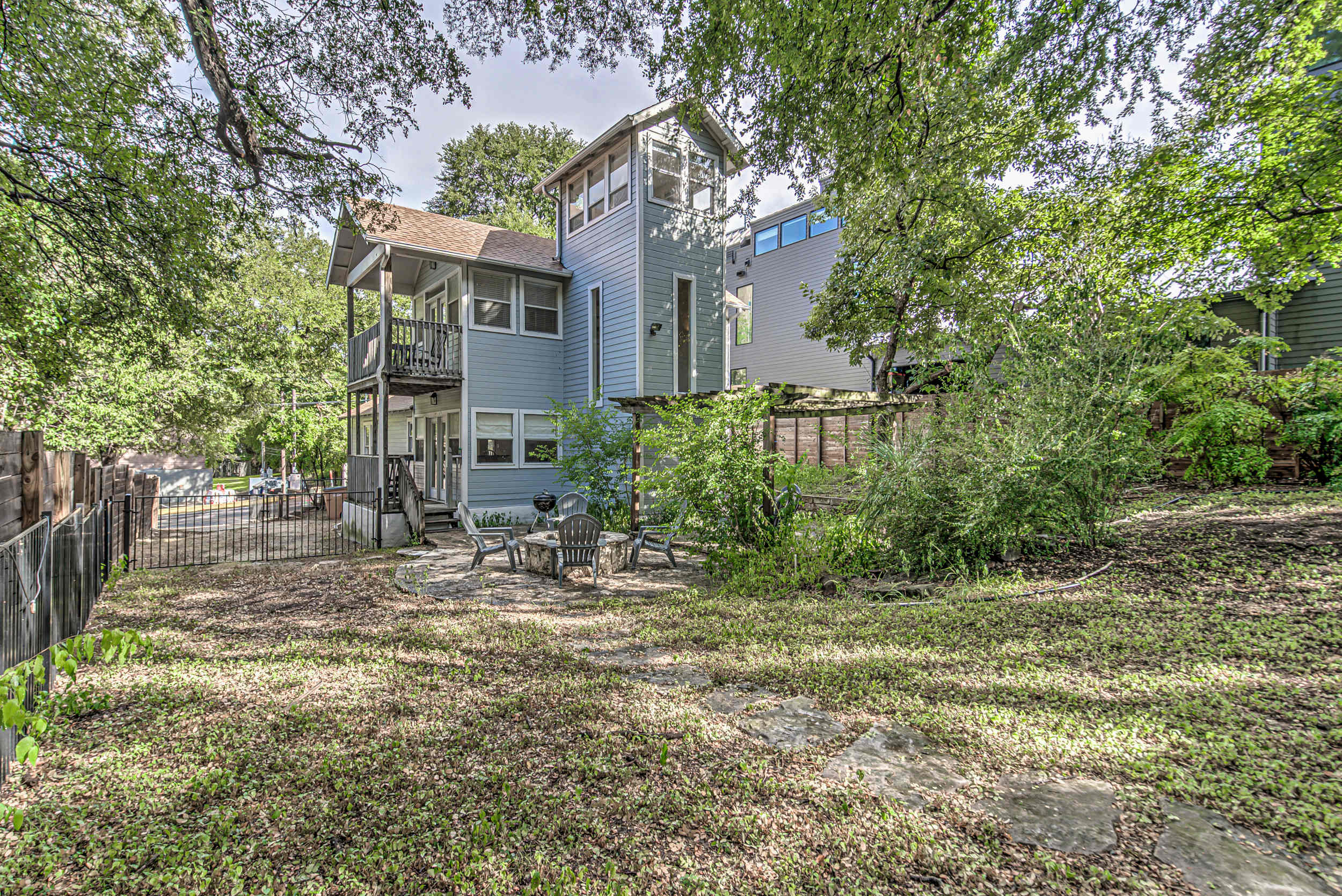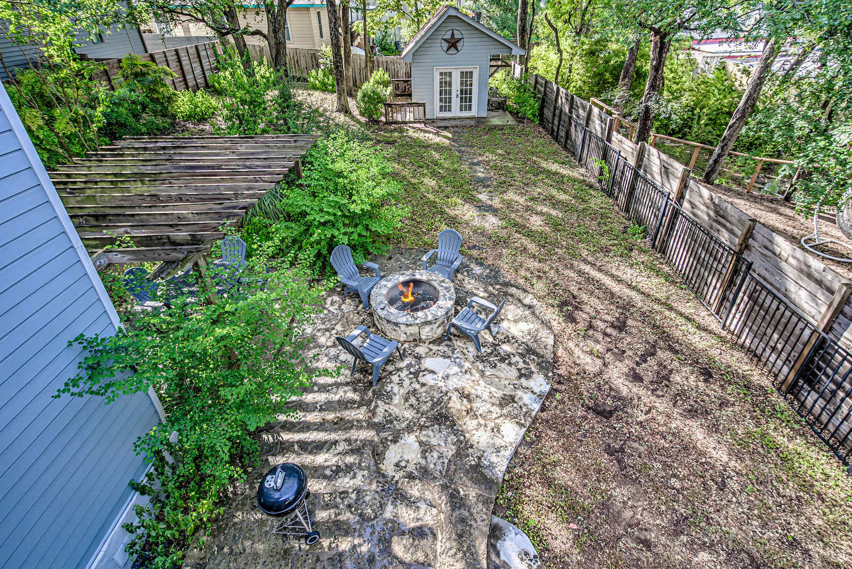 • Private backyard with outdoor seating, BBQ grill, and fire pit