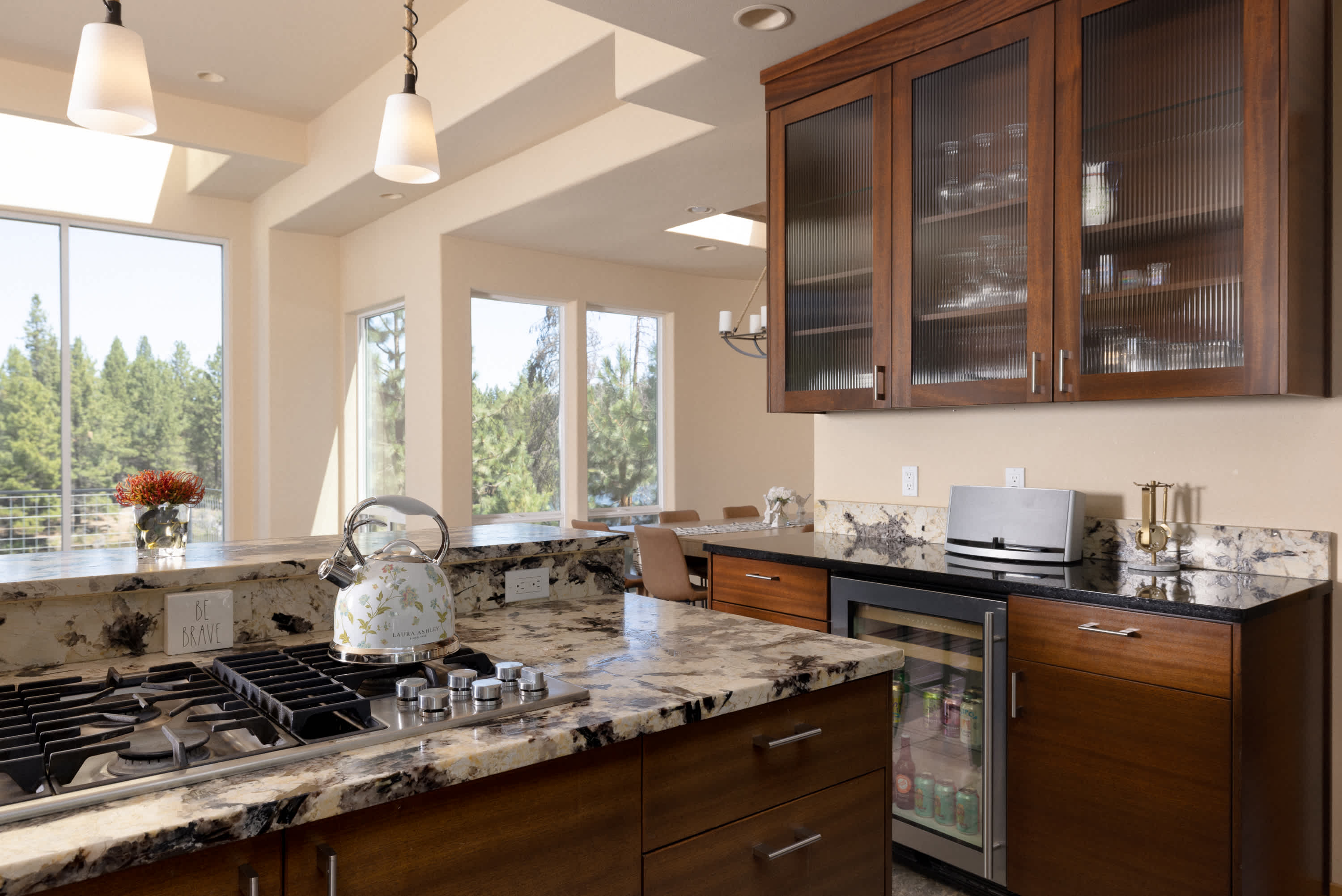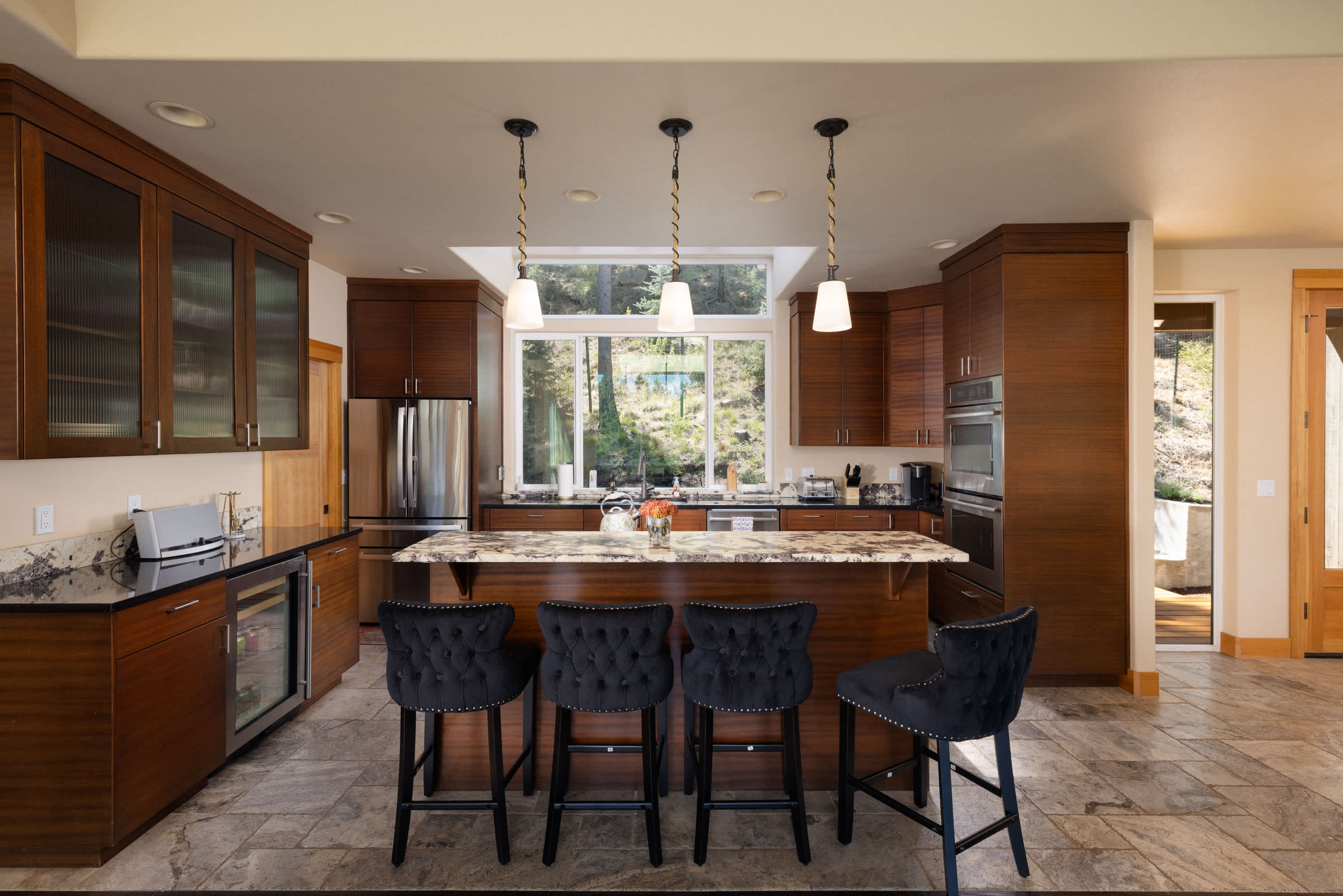 Step inside, and you’ll immediately be captivated by the open-concept design where the living, kitchen, and dining areas flow seamlessly together. The living room, perched on the upper floor, boasts floor-to-ceiling windows that flood the space with natural light and frame incredible views of the river right out back. A smart TV makes it easy to wind down after a day outdoors, while just behind the main living area, a chic sitting space with a couch and chairs gathered around a fireplace creates a cozy nook for conversation. The kitchen is both elegant and functional, featuring stainless steel appliances, a beverage fridge, and both drip and Keurig coffee makers. With counter seating for four and a dining table for six set beside those dramatic windows, every meal comes with a view.