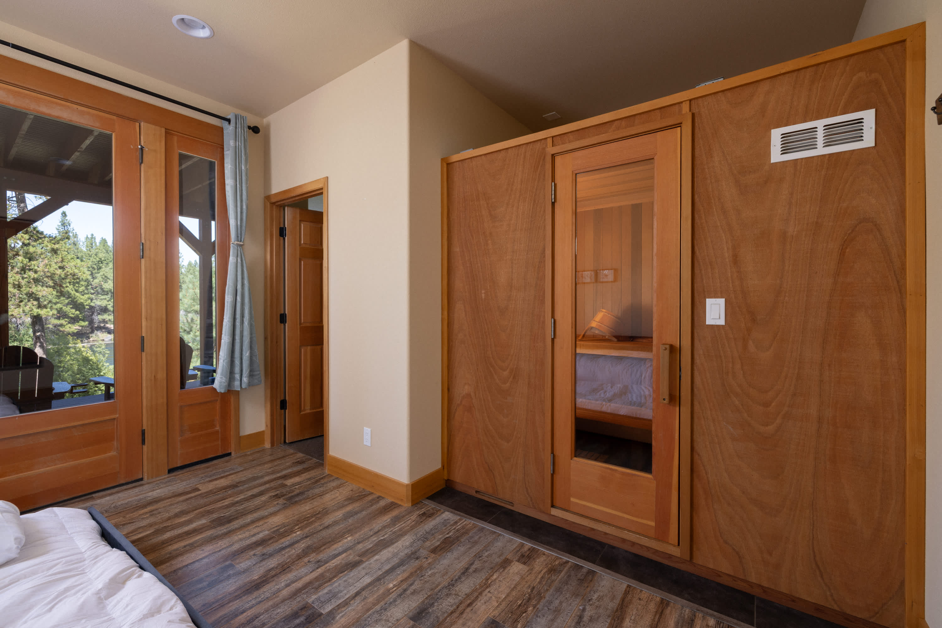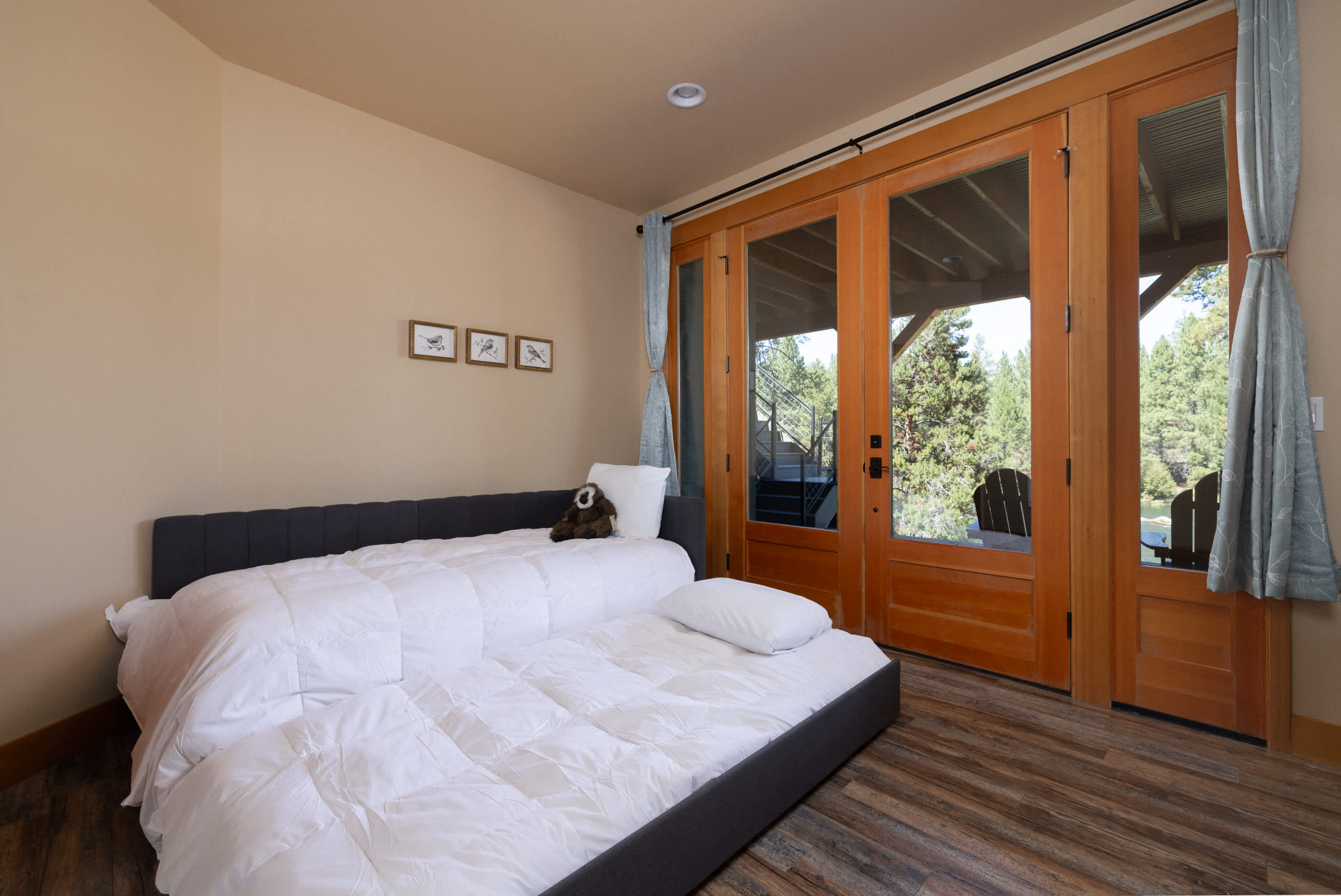 Bedroom #5, also the Sauna Room, includes a trundle with two twin beds and deck access.