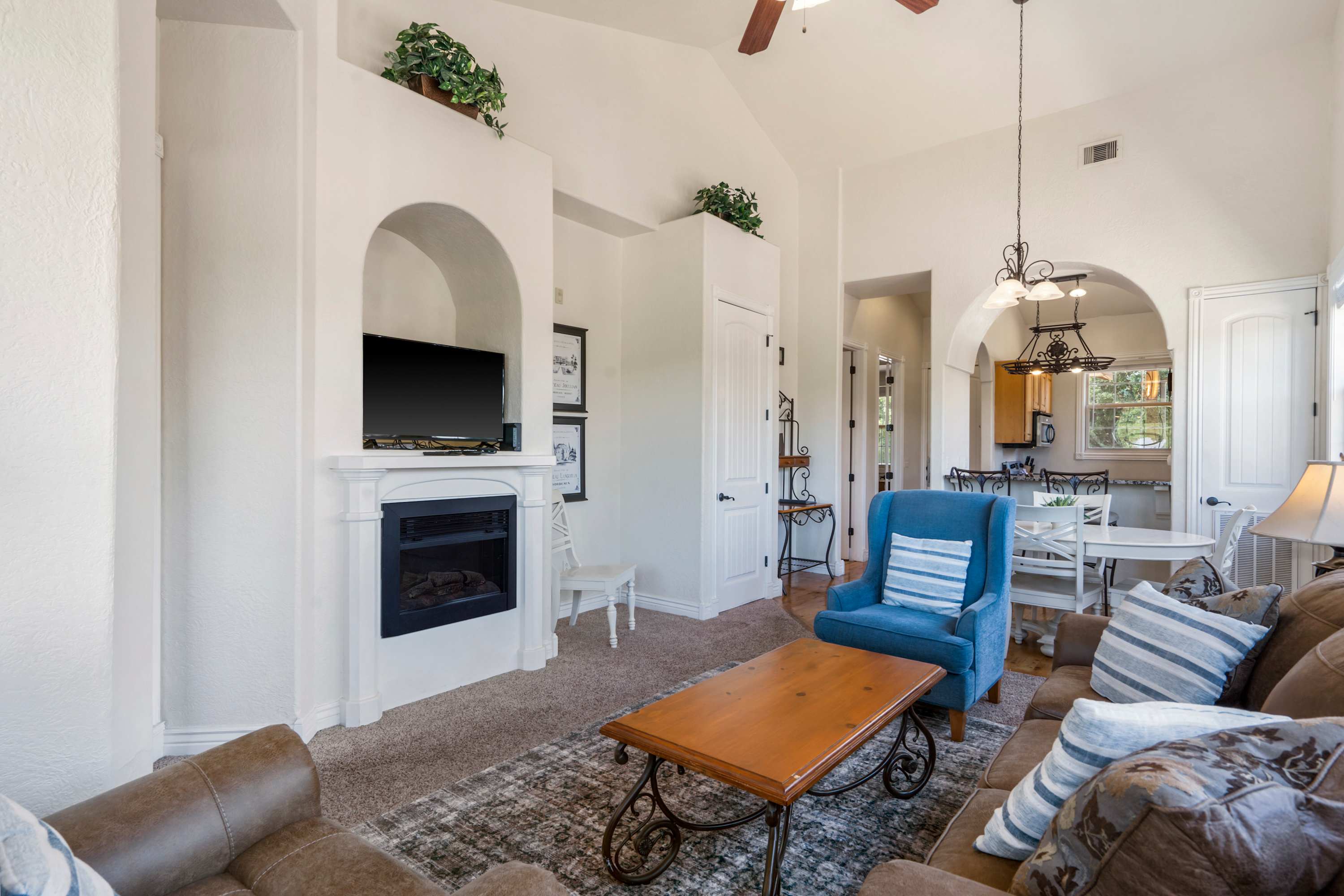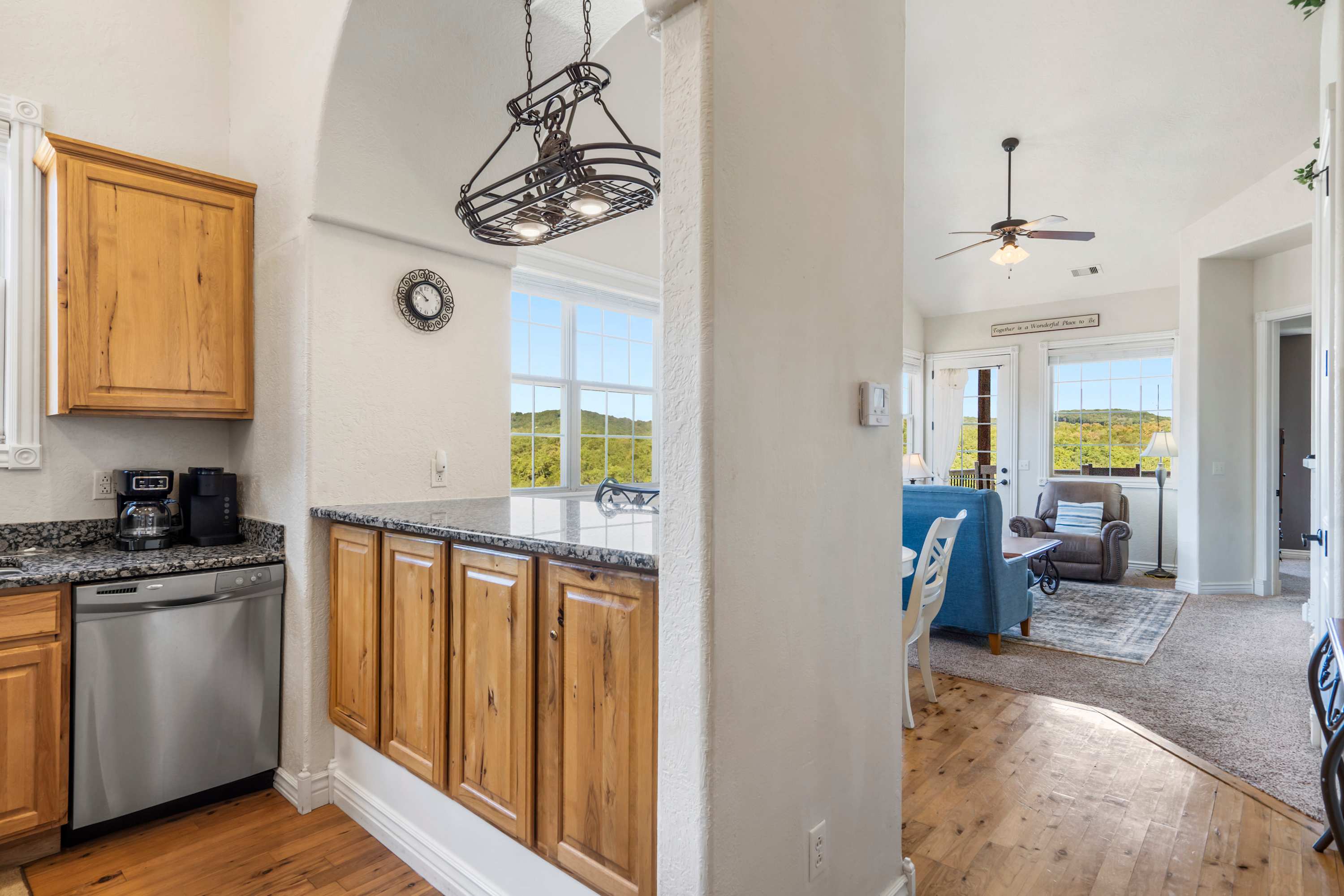 Inside, this inviting home welcomes you with warmth and comfort. The living room is filled with natural light from large windows and offers a cozy couch, two chairs, and TV—ideal for unwinding after a day of exploring. The modern kitchen features stone counters, stainless steel appliances, and both drip and Keurig coffee options, with counter seating for two. Share meals together at the dining table for four, or step outside onto the covered balcony, where comfortable seating and beautiful mountain views make every moment feel special. Whether you’re looking for relaxation, adventure, or a mix of both, this vacation home is the perfect base for your Branson getaway.