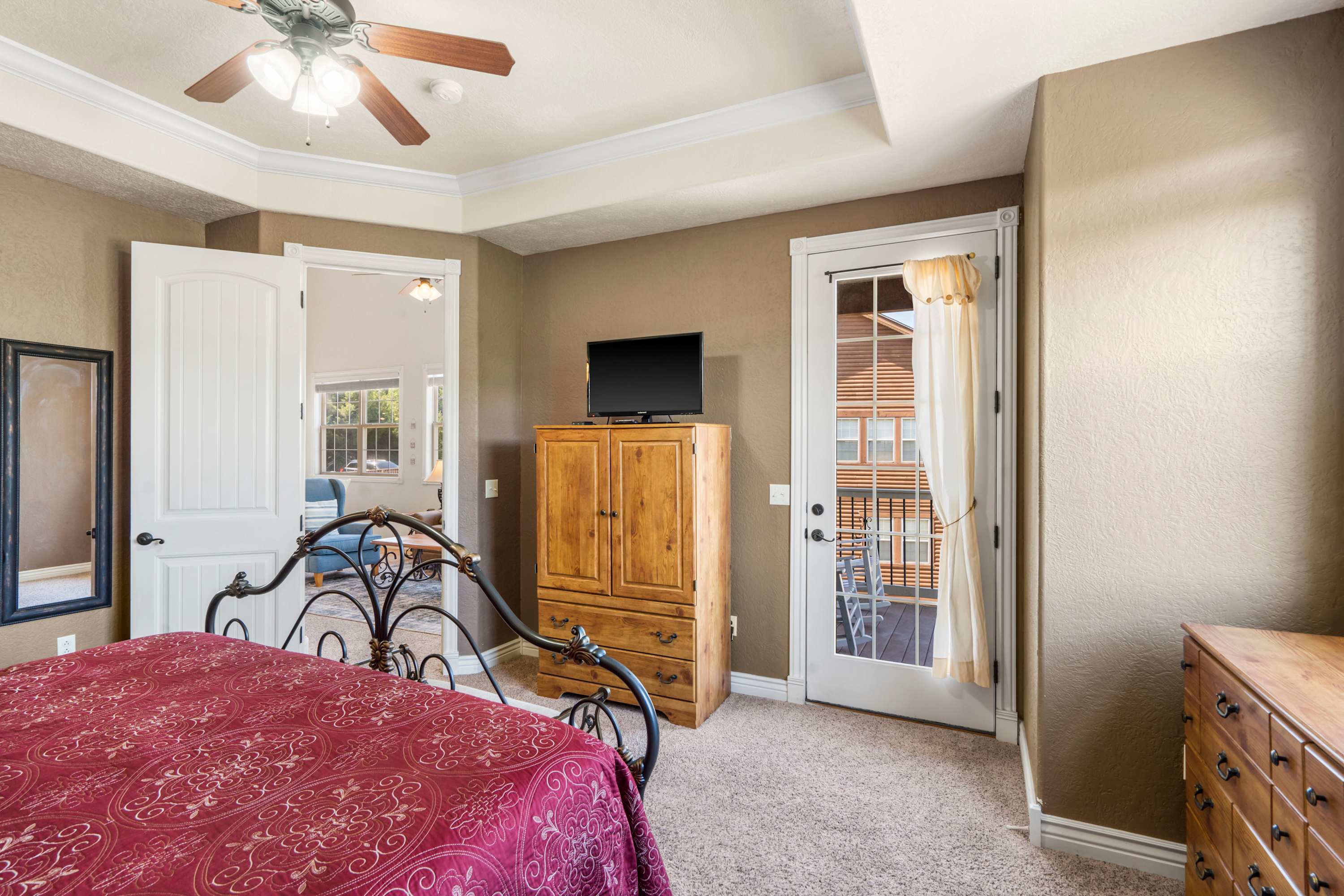 Bedroom #2 includes a king size bed, a cable TV, deck access, and an ensuite bathroom with 2 vanities, a soaking tub, and a walk-in shower.