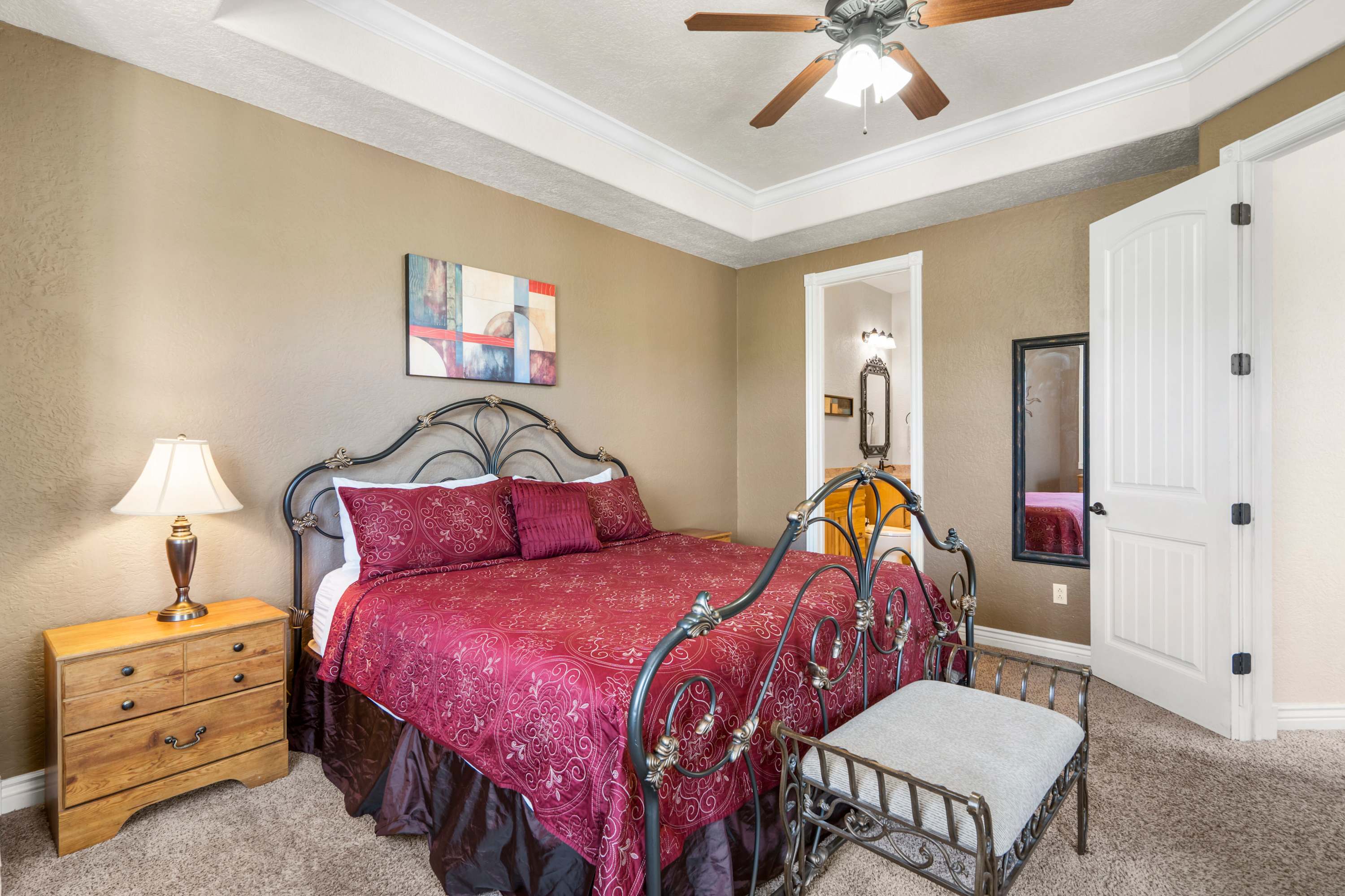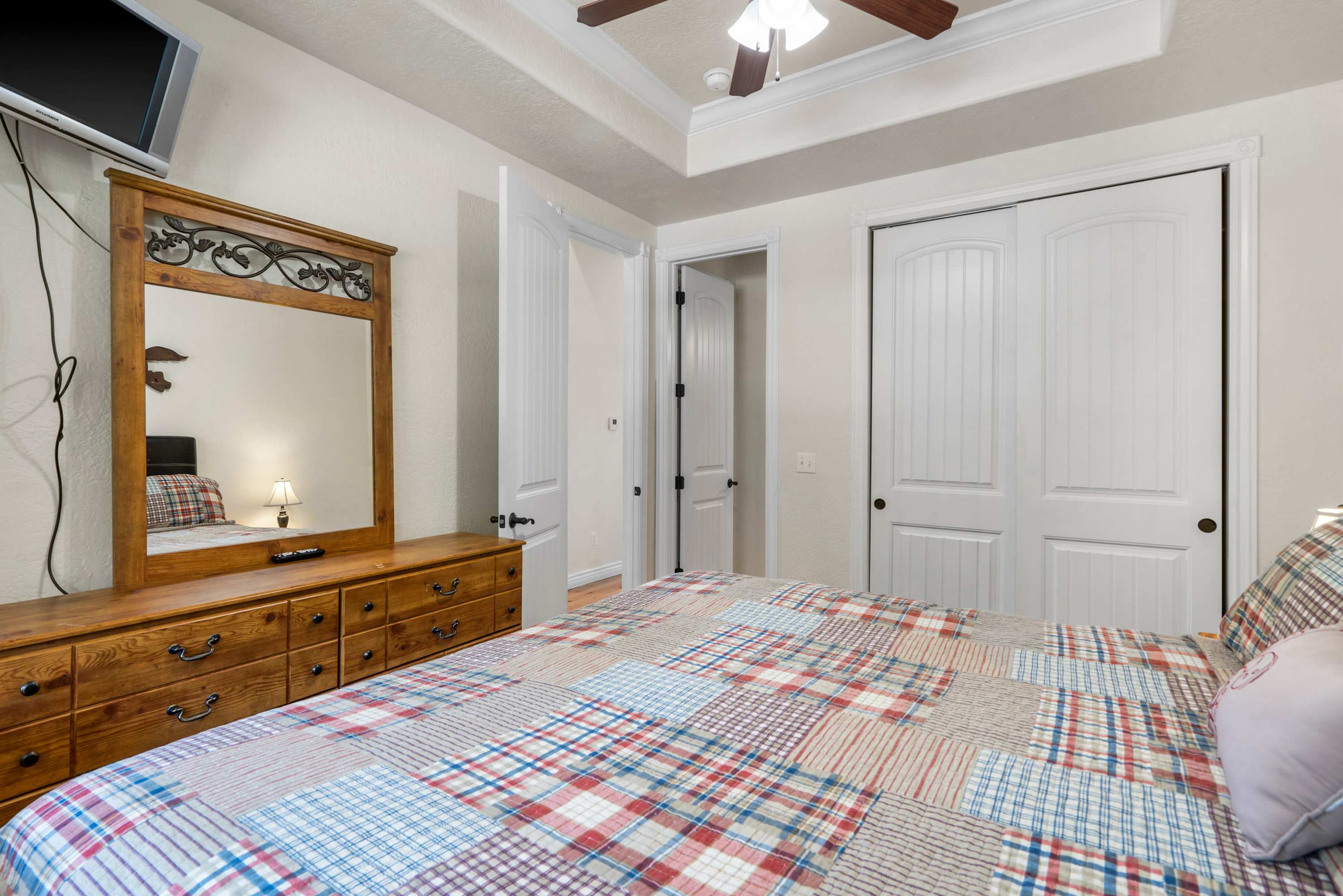 Bedroom #1 includes a king size bed, a cable TV, and an ensuite bathroom with a single vanity and a shower/tub combo.