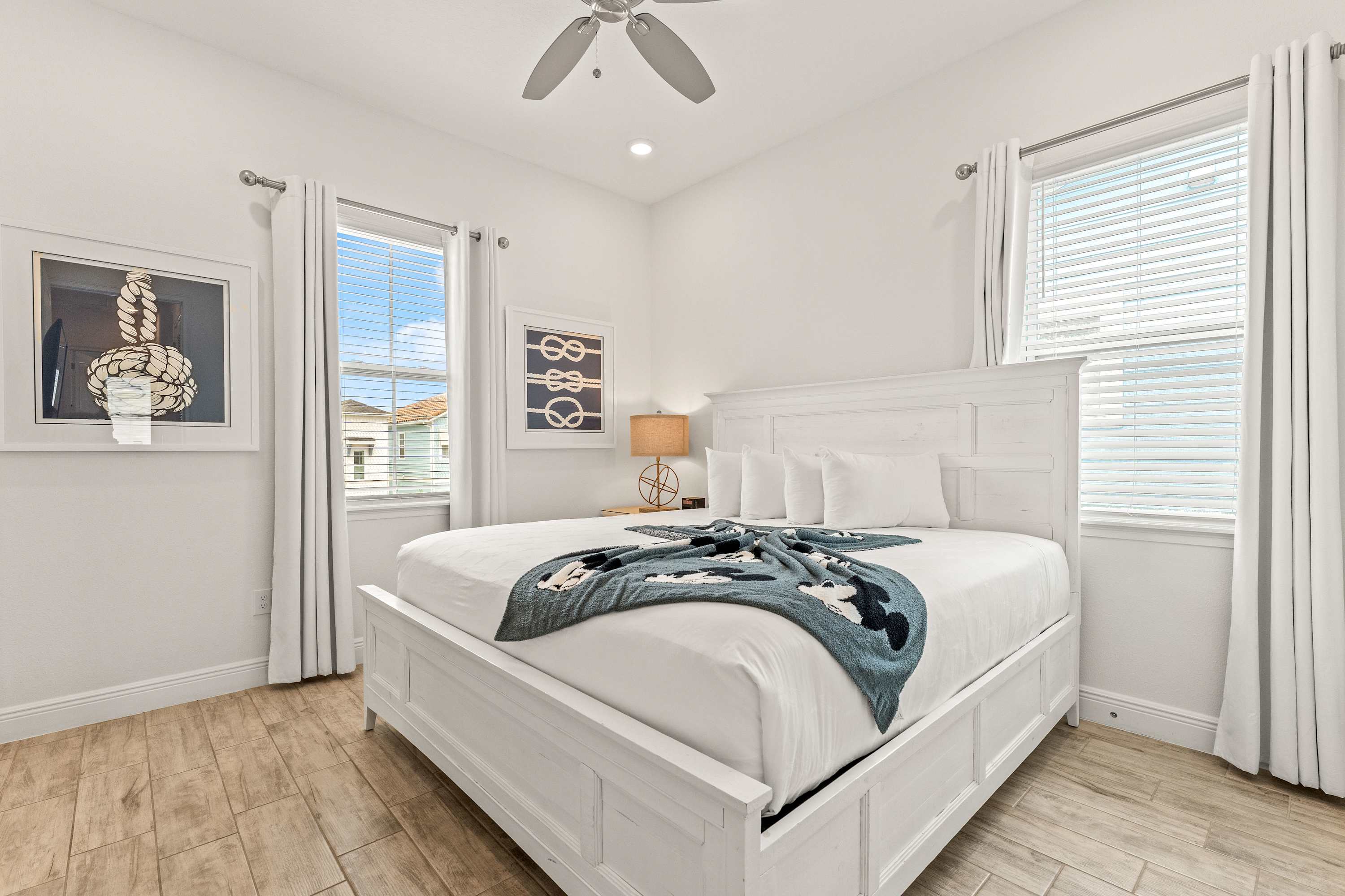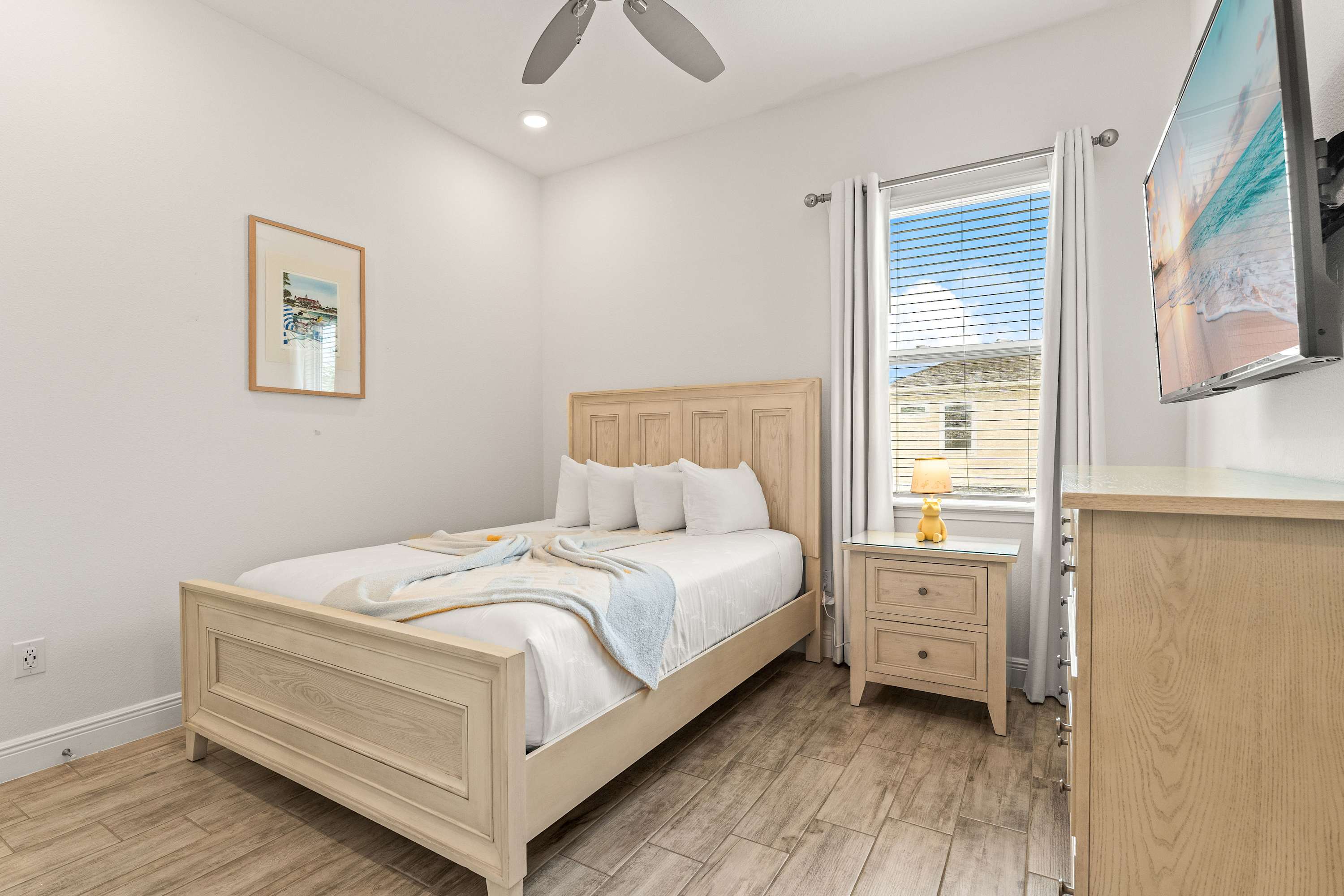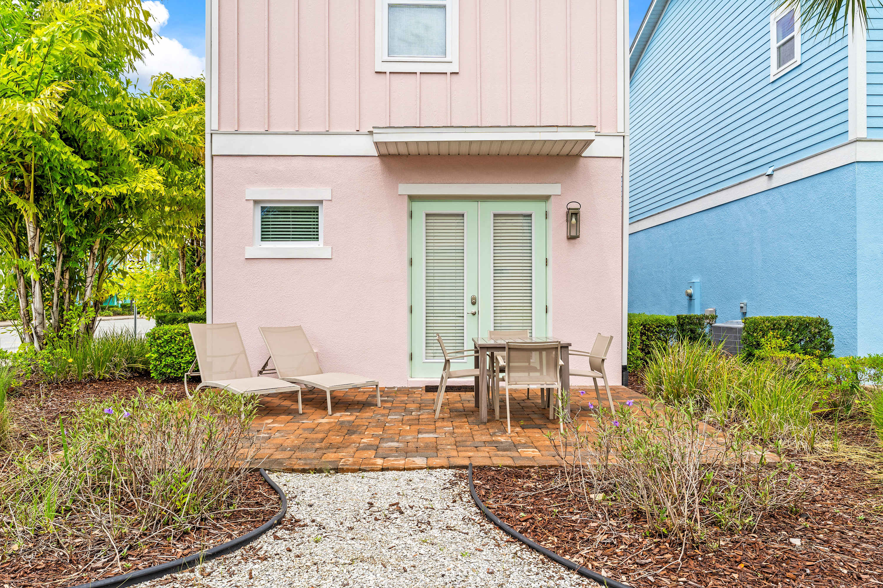 Step inside this corner cottage bathed in natural light, designed with coastal-inspired neutral and nautical décor. Tile floors flow throughout the dual-story layout, creating a crisp, breezy feel. The loft and living room each offer a smart TV with cable access, perfect for movie nights or catching up on shows. In the heart of the home, the kitchen and dining area share an open space, featuring cream cabinetry, white quartz countertops, and stainless steel appliances, with a dining table for six. Outside, a private patio invites you to unwind with two chaise loungers, a dining table for four, and a walkway path for an added touch of charm.