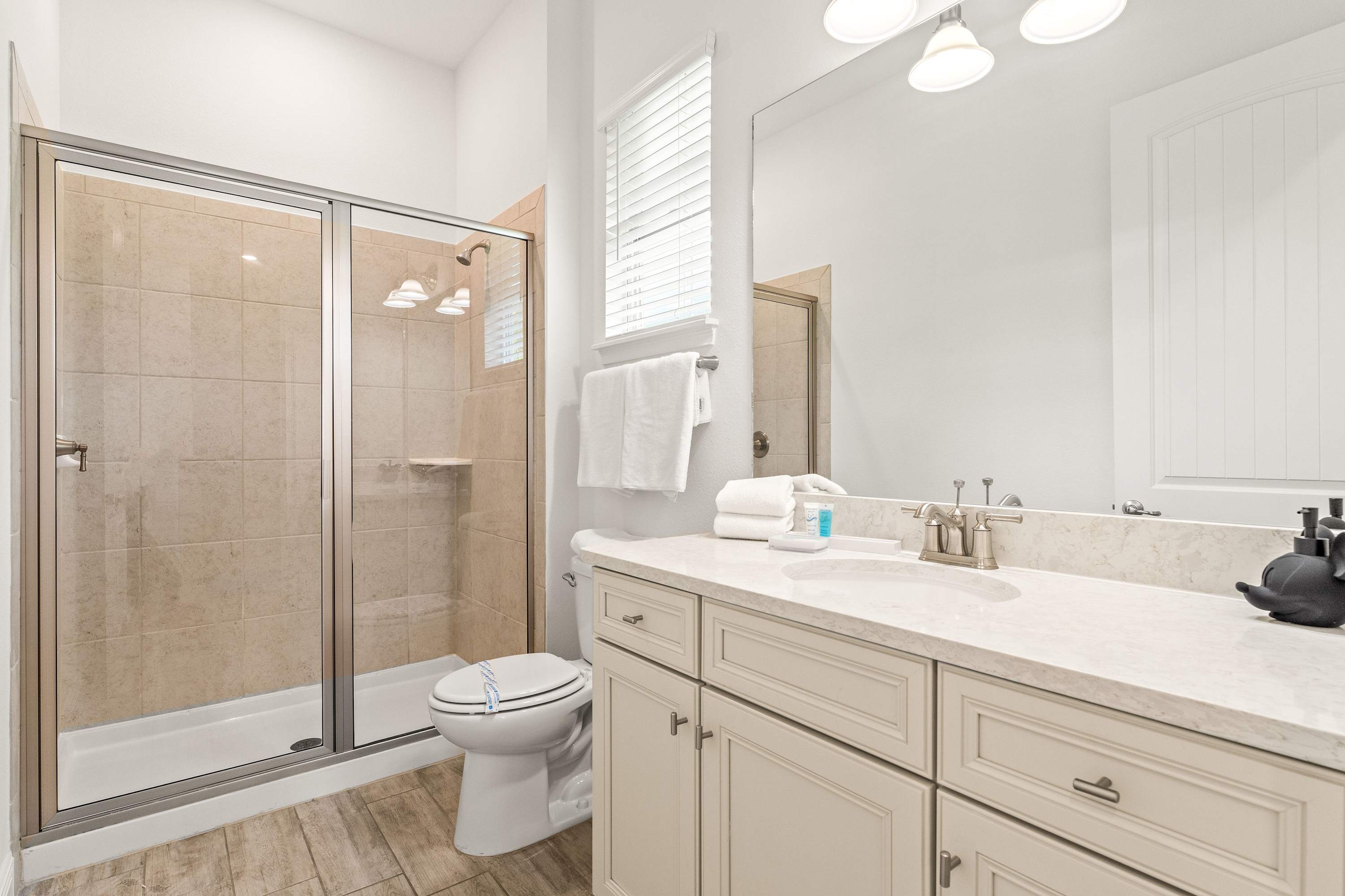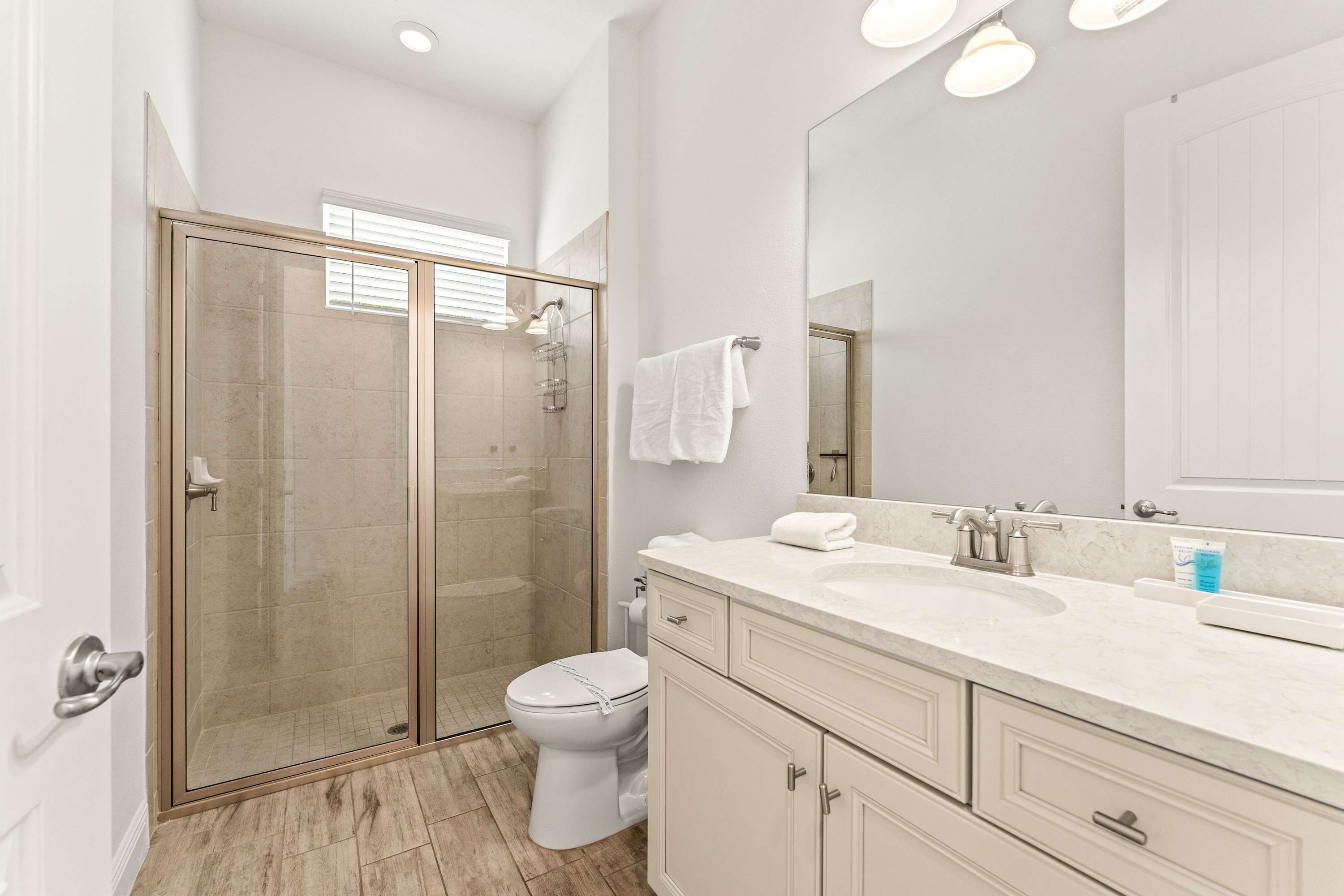• An additional full bathroom with a single vanity and a walk-in shower is also available.
