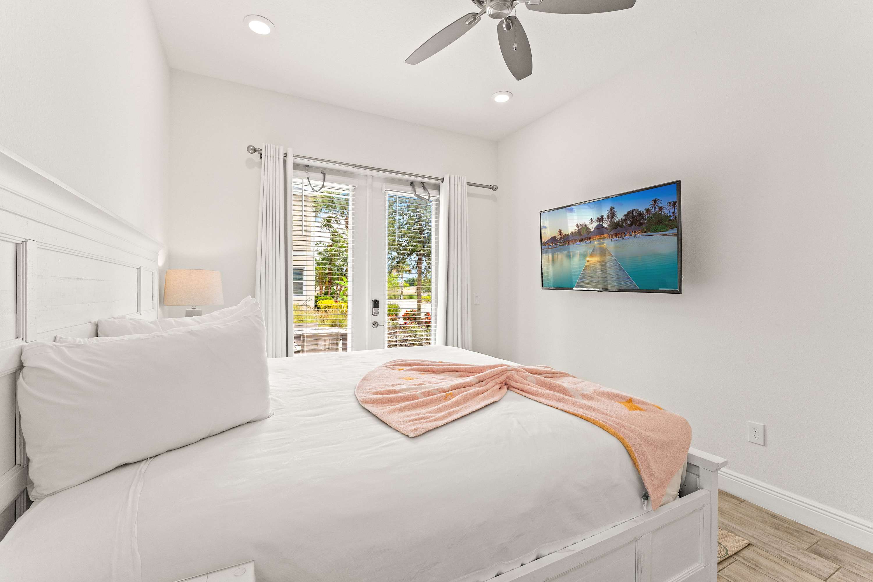 • Bedroom #1 includes a king-size bed, a smart TV with cable, patio access, and an ensuite bathroom with a single vanity and a walk-in shower.