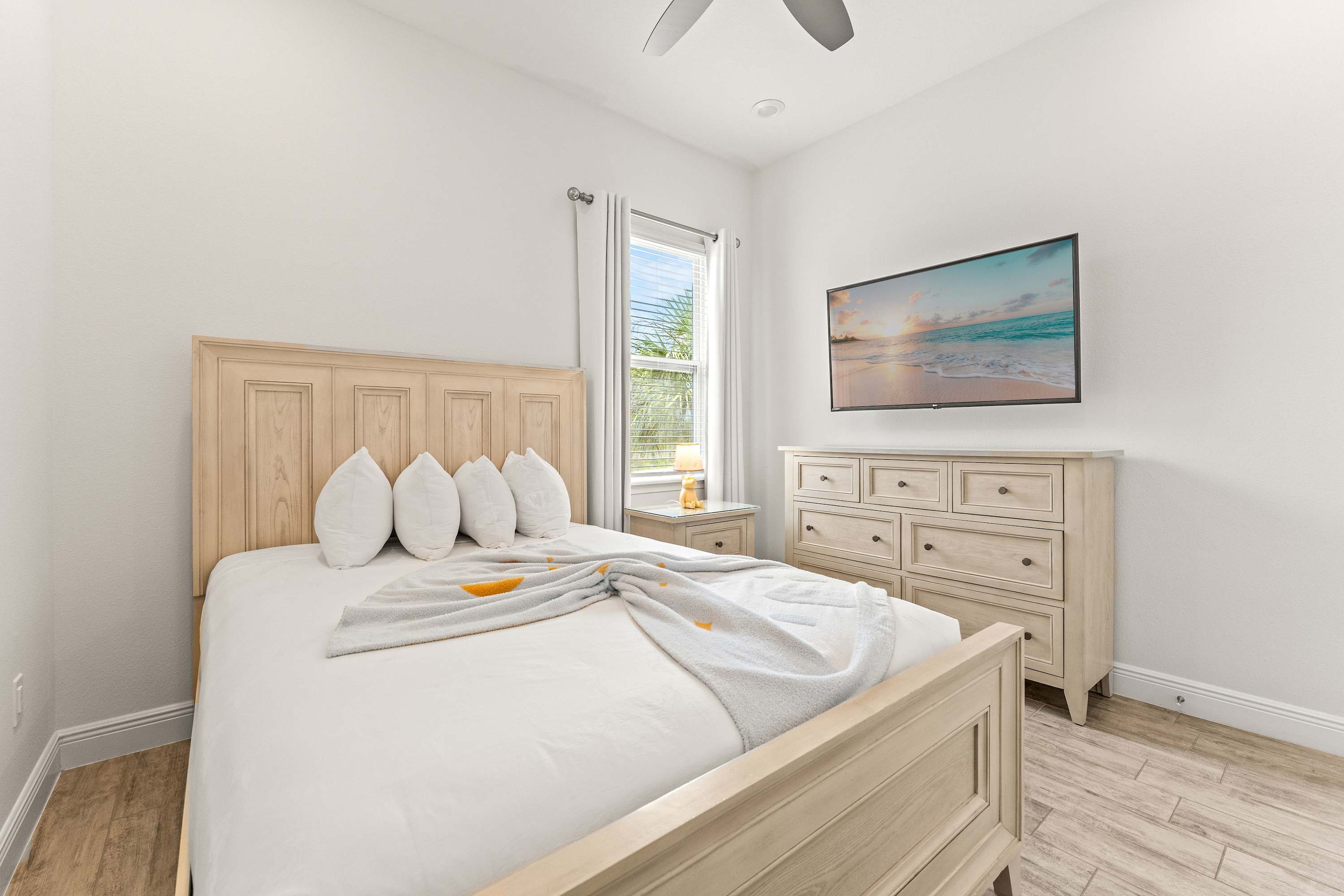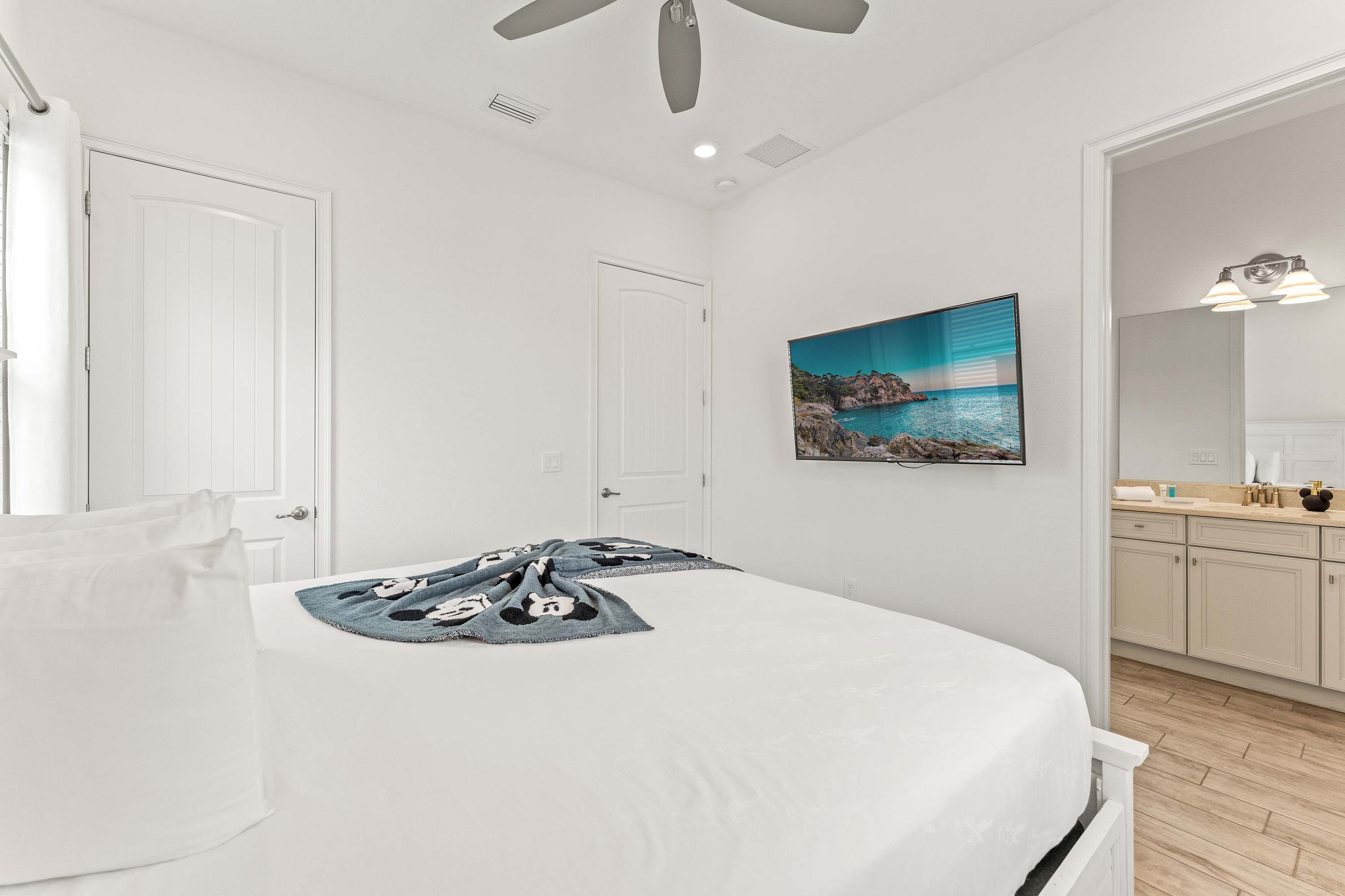 • Bedroom #3 includes a king-size bed, a smart TV with cable, and an ensuite bathroom with a single vanity and a shower/tub combo.
