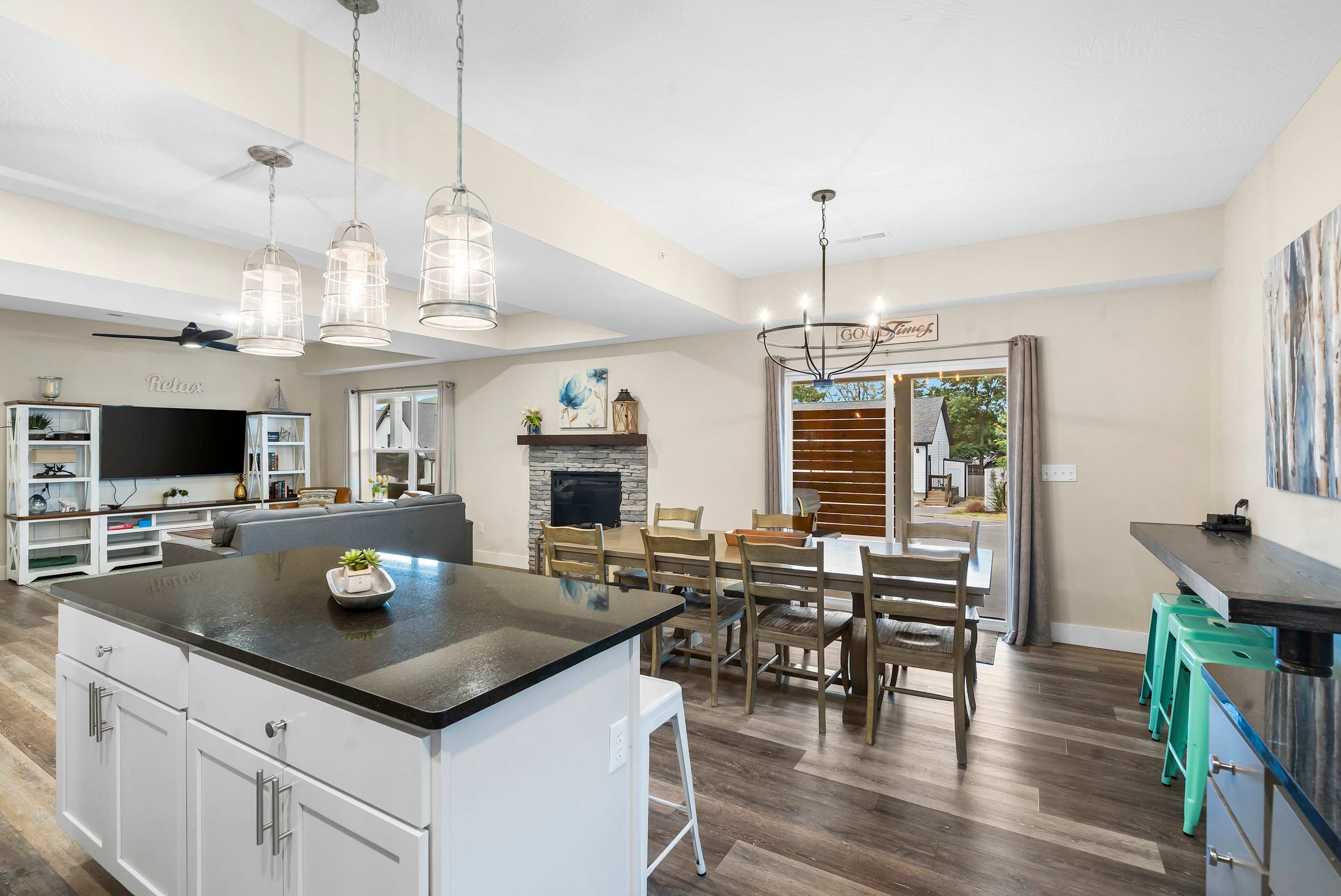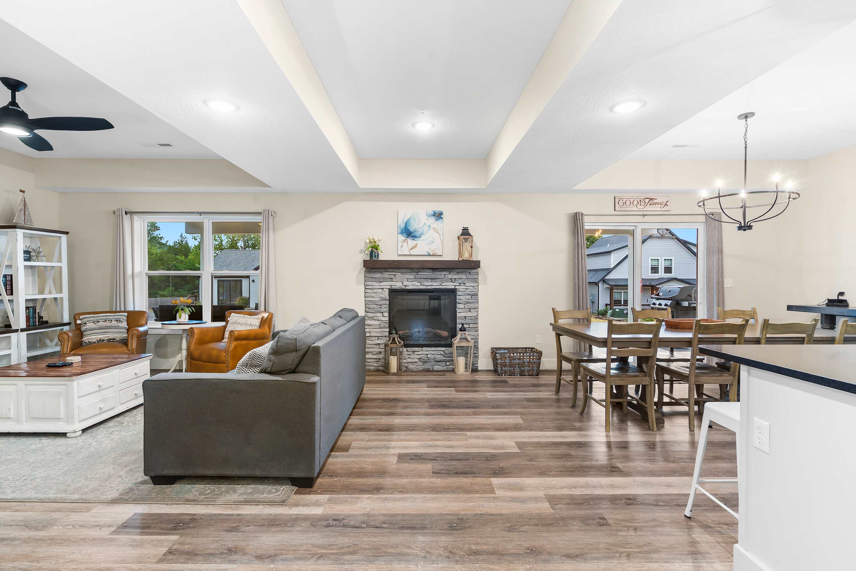Inside, the home is designed for comfort and connection. The living room welcomes you with a plush couch, two armchairs, and a smart TV perfect for movie nights. The sleek kitchen boasts stainless steel appliances, dark countertops, a drip and Keurig coffee maker, and counter seating for four. Gather around the dining table for seven to share meals and stories after a day of exploring. Outdoors, a private patio with a bubbling hot tub and cozy seating invites you to unwind under the stars, making this the perfect retreat for your Branson getaway.
