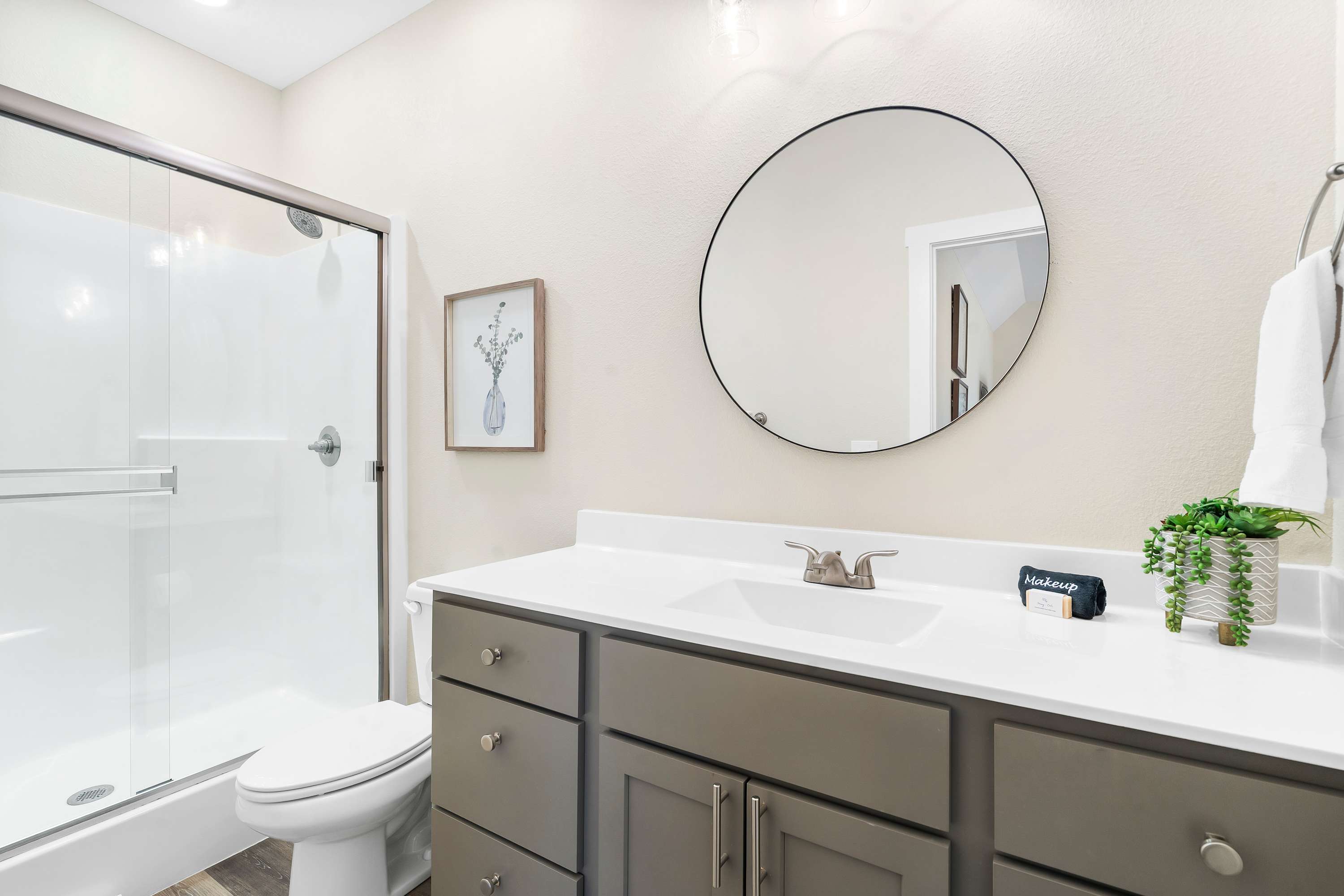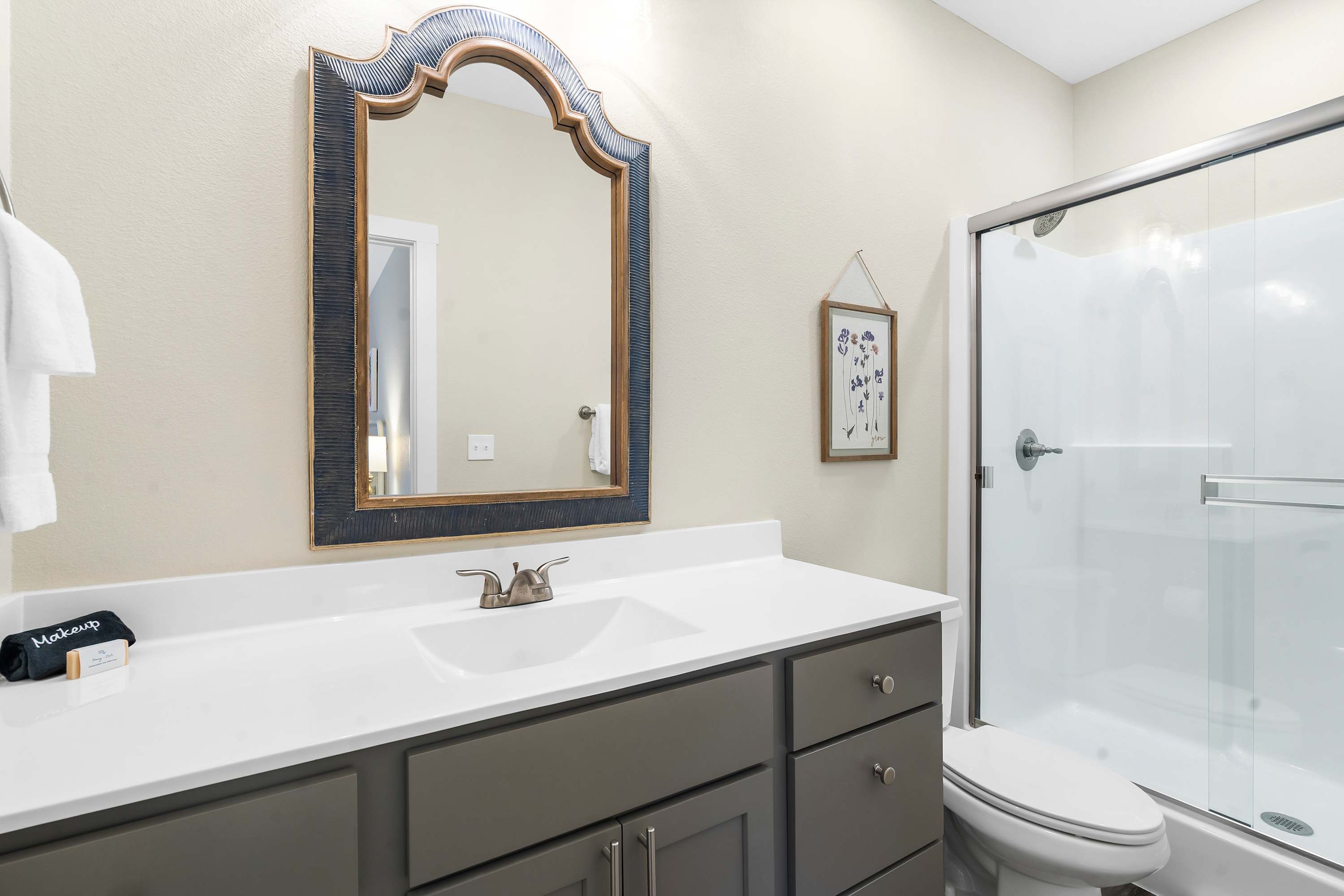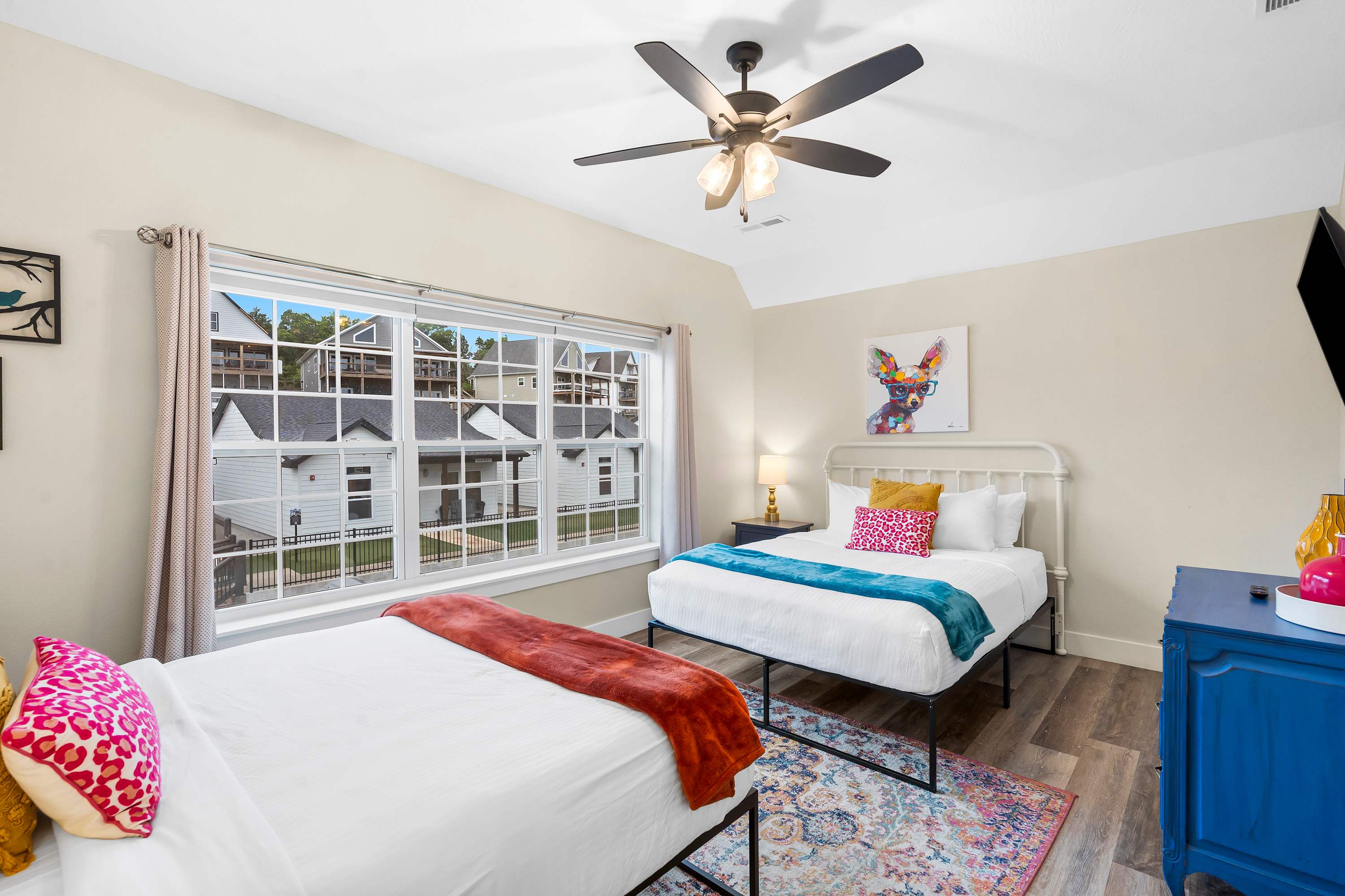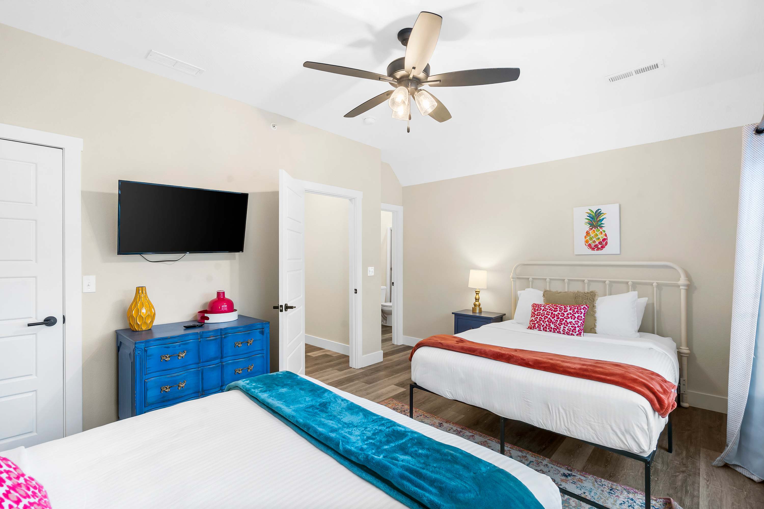 Bedroom #4 includes 2 queen-size beds, a smart TV, and an ensuite bathroom with a single vanity and a walk-in shower.