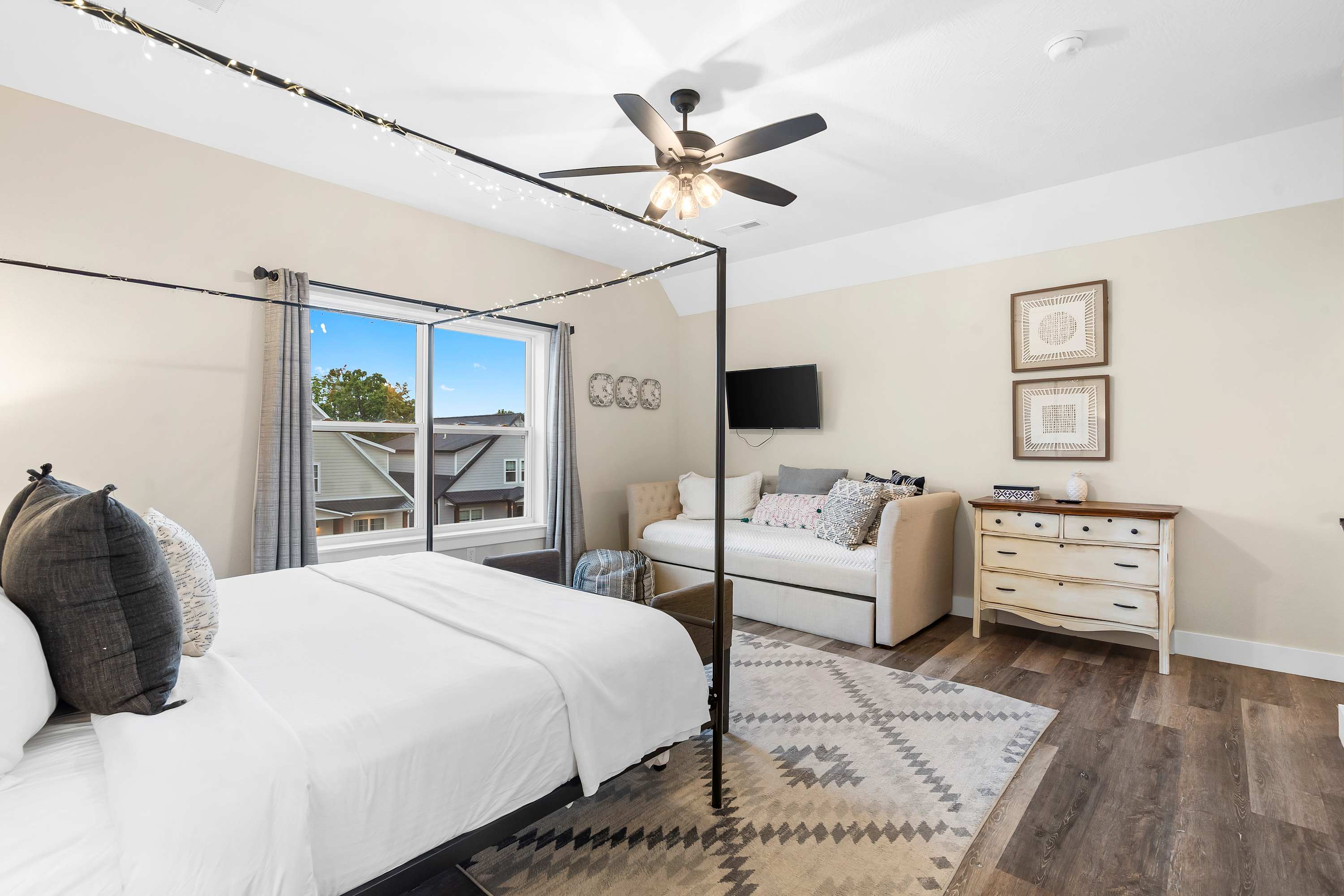 Bedroom #3 includes a king-size bed, a twin-size daybed with a twin-size trundle bed, a smart TV, and an ensuite bathroom with a single vanity and a walk-in shower.