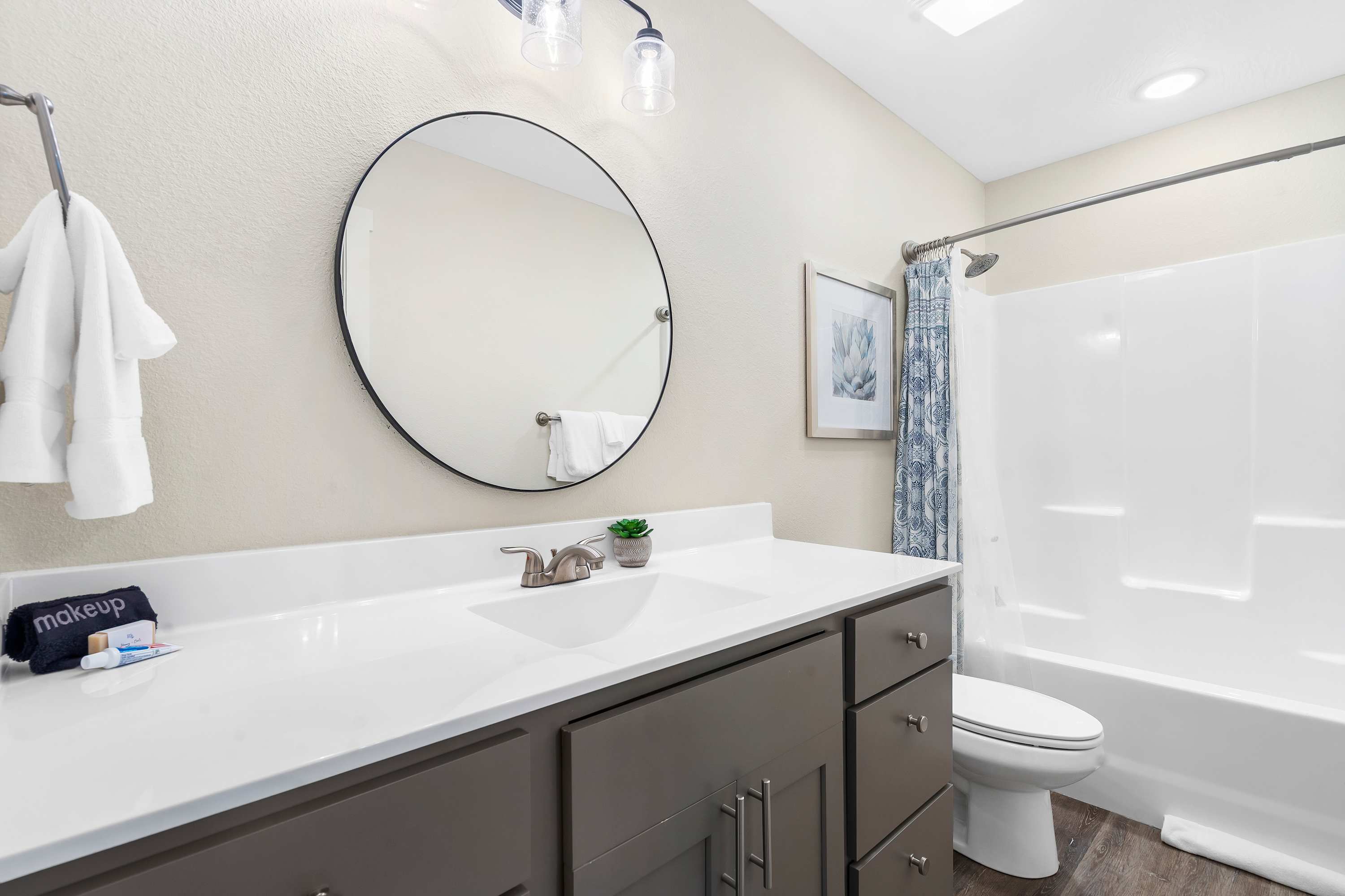 Bedroom #1 includes a king-size bed, a smart TV, and an ensuite bathroom with a single vanity and a shower/tub combo.