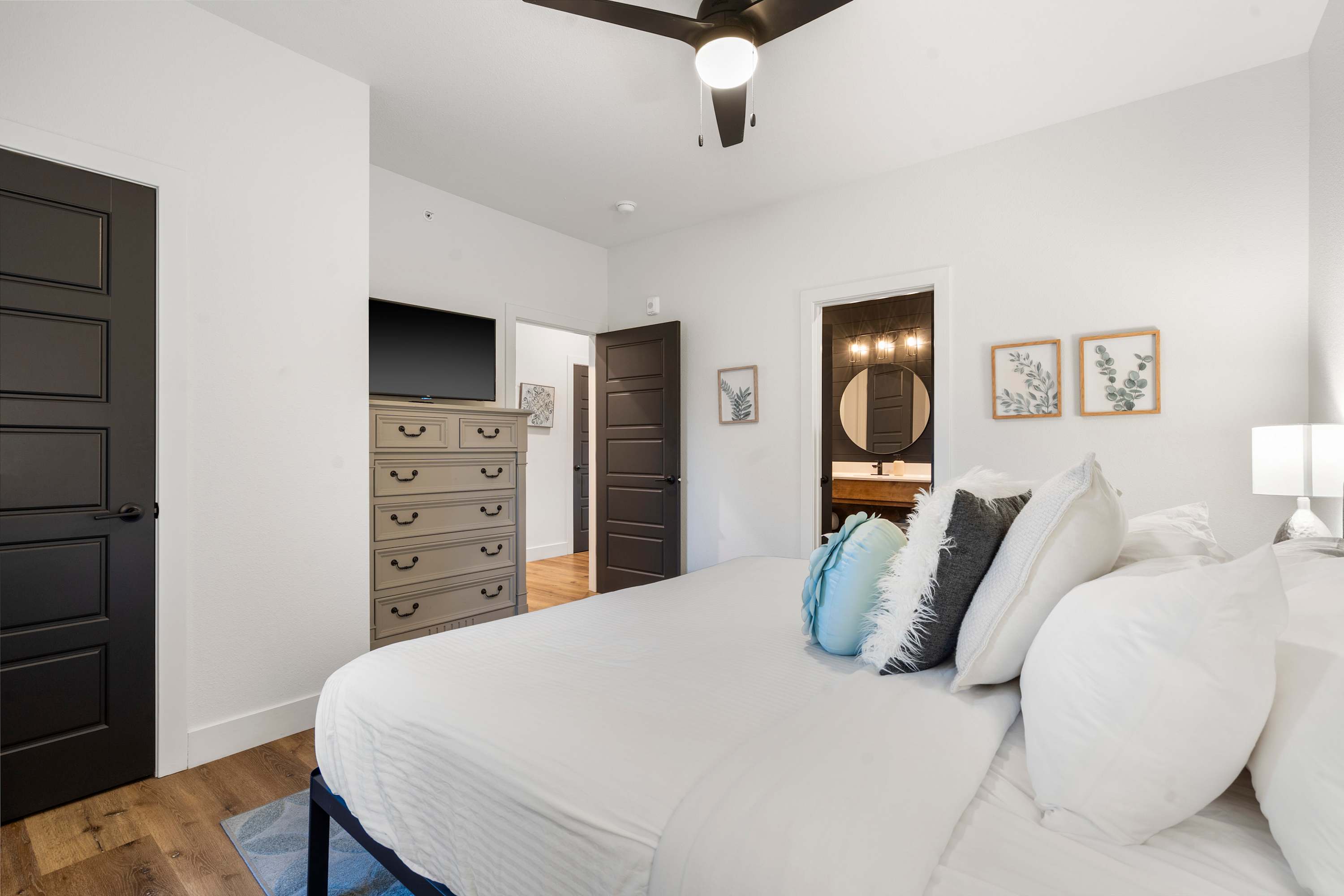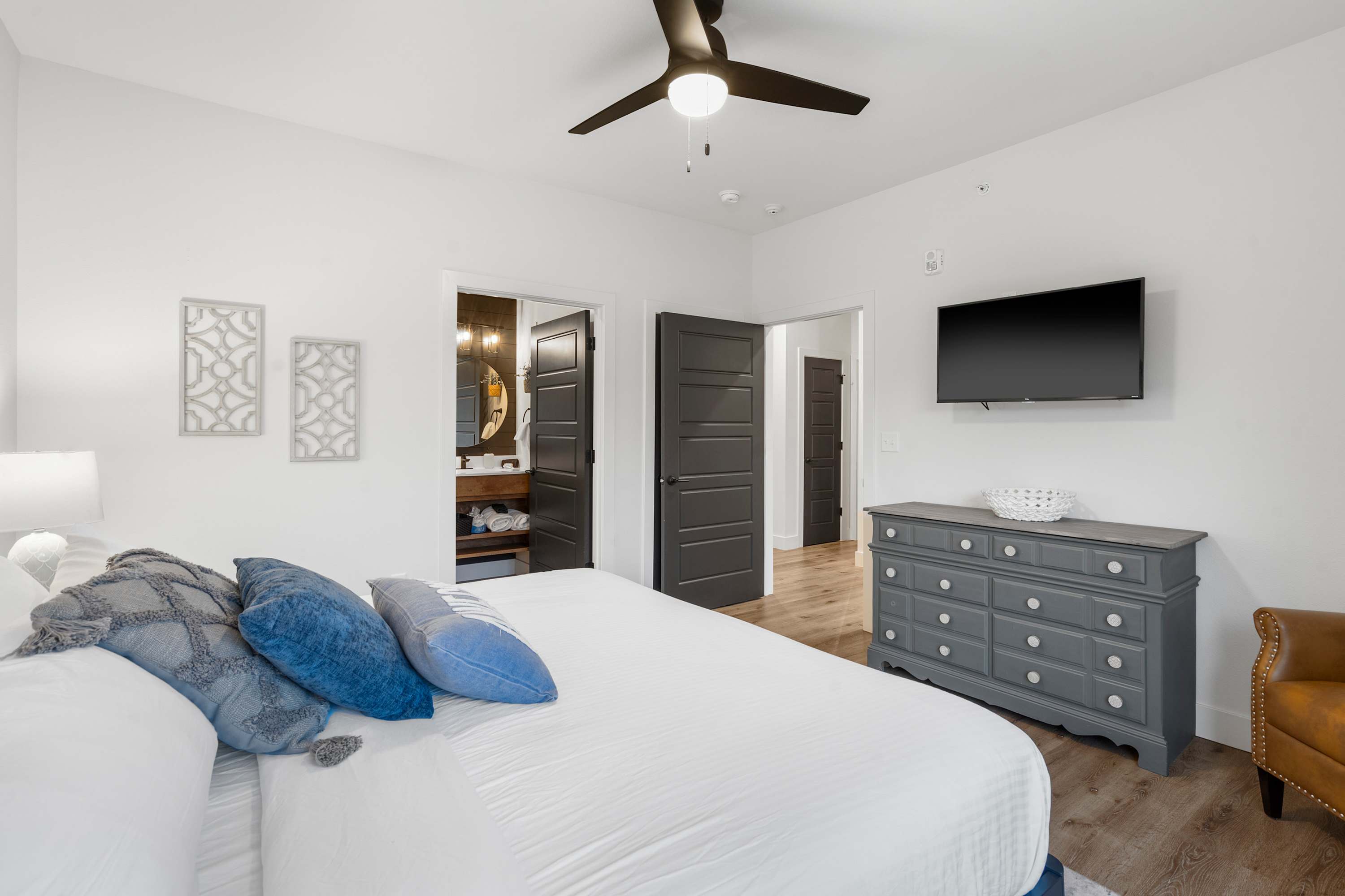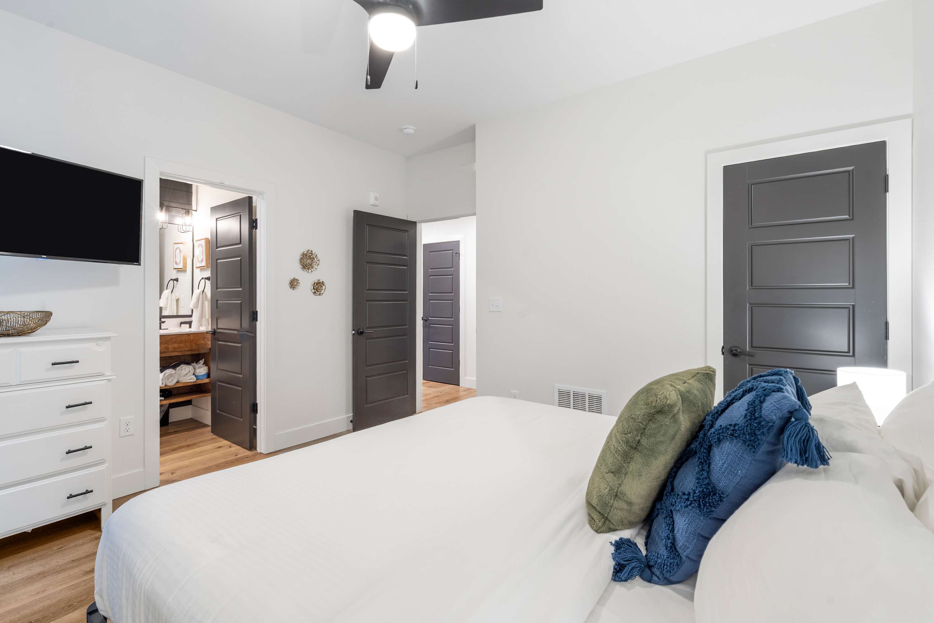 Bedroom #3 includes a king size bed, a smart TV, and an ensuite bathroom with a single vanity and a shower/tub combo.