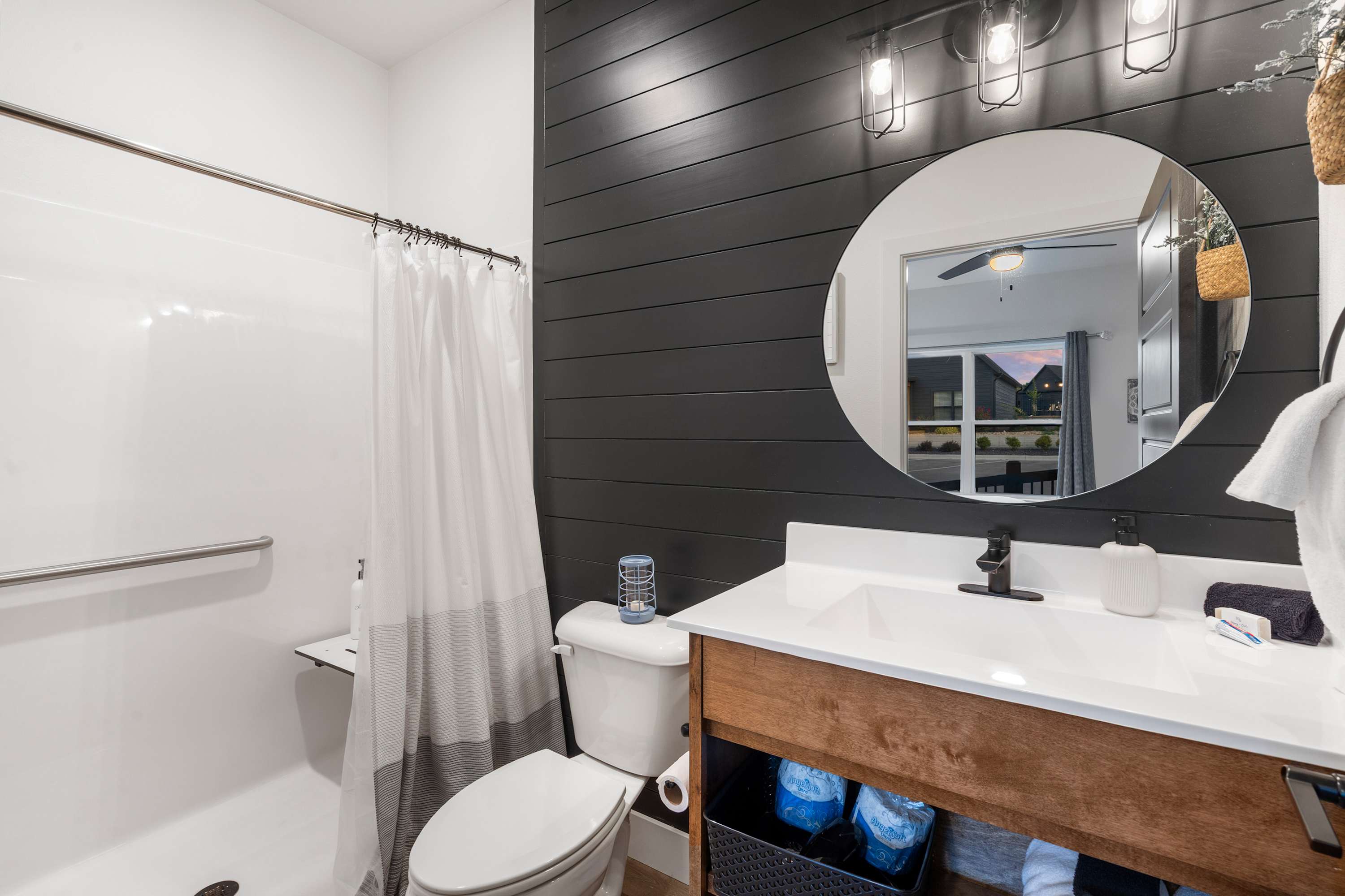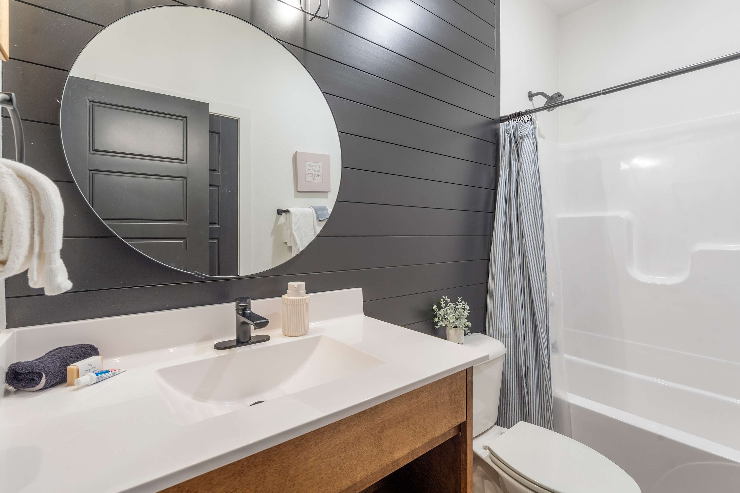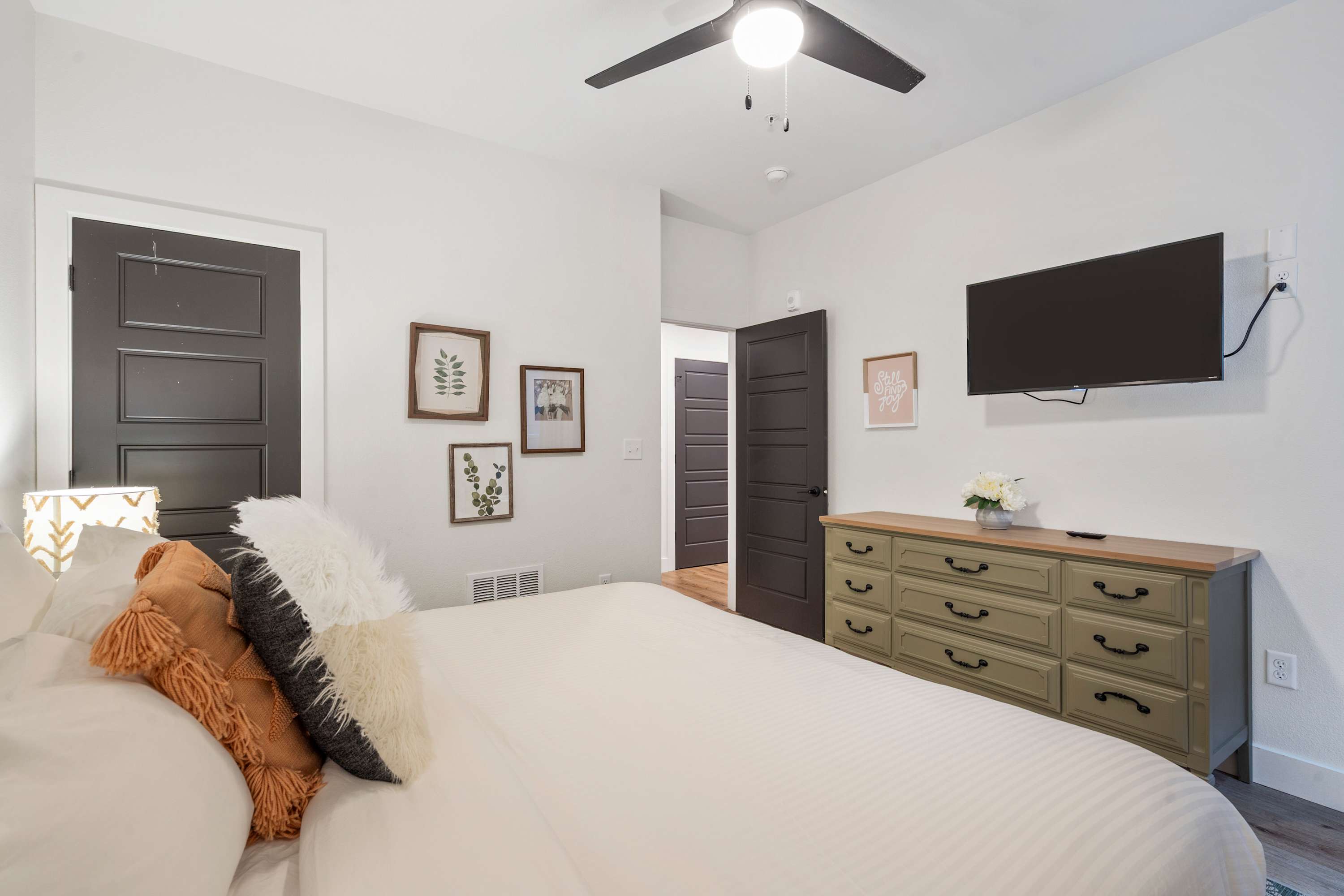 Bedroom #3 includes a king size bed, a smart TV, and an ensuite bathroom with a single vanity and a shower/tub combo.