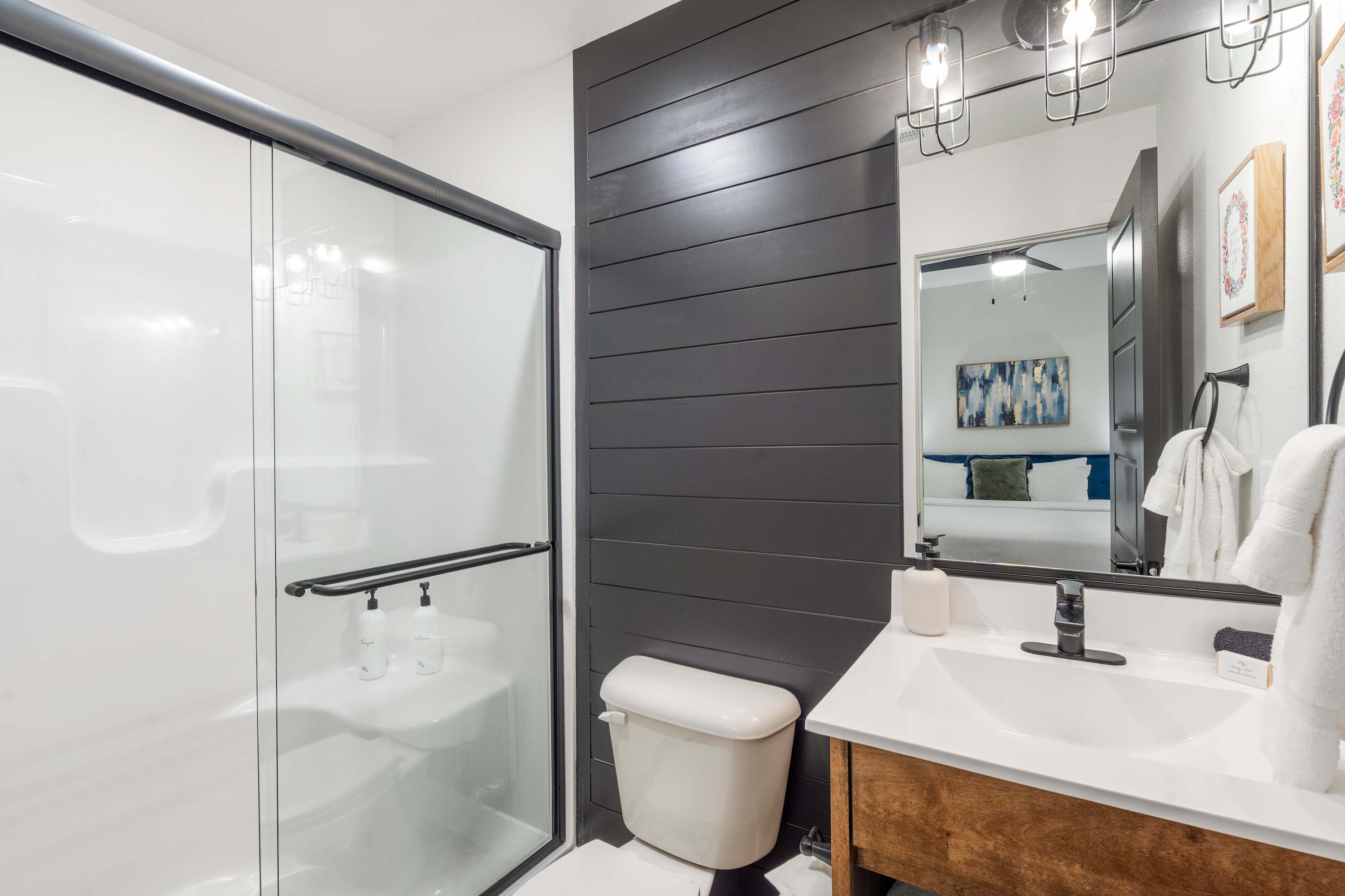 Bedroom #1 includes a king size bed, a smart TV, and an ensuite bathroom with a single vanity and a shower/tub combo.
