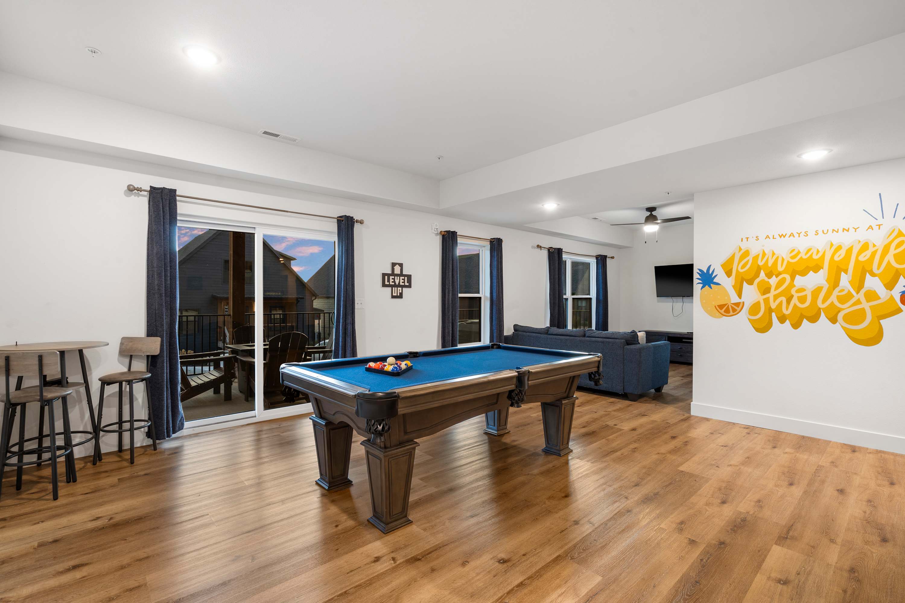 For endless fun, the basement game room awaits with a pool table, a Mortal Kombat arcade with dozens of other classic games, a smart TV, and a comfy couch—an entertainment hub for kids and adults alike. Outside, the upper-level deck is perfect for grilling and gathering, with a dining table for six and comfortable seating for lounging with a drink in hand. On the lower patio, a private hot tub and additional seating create the ultimate space to unwind under the stars.