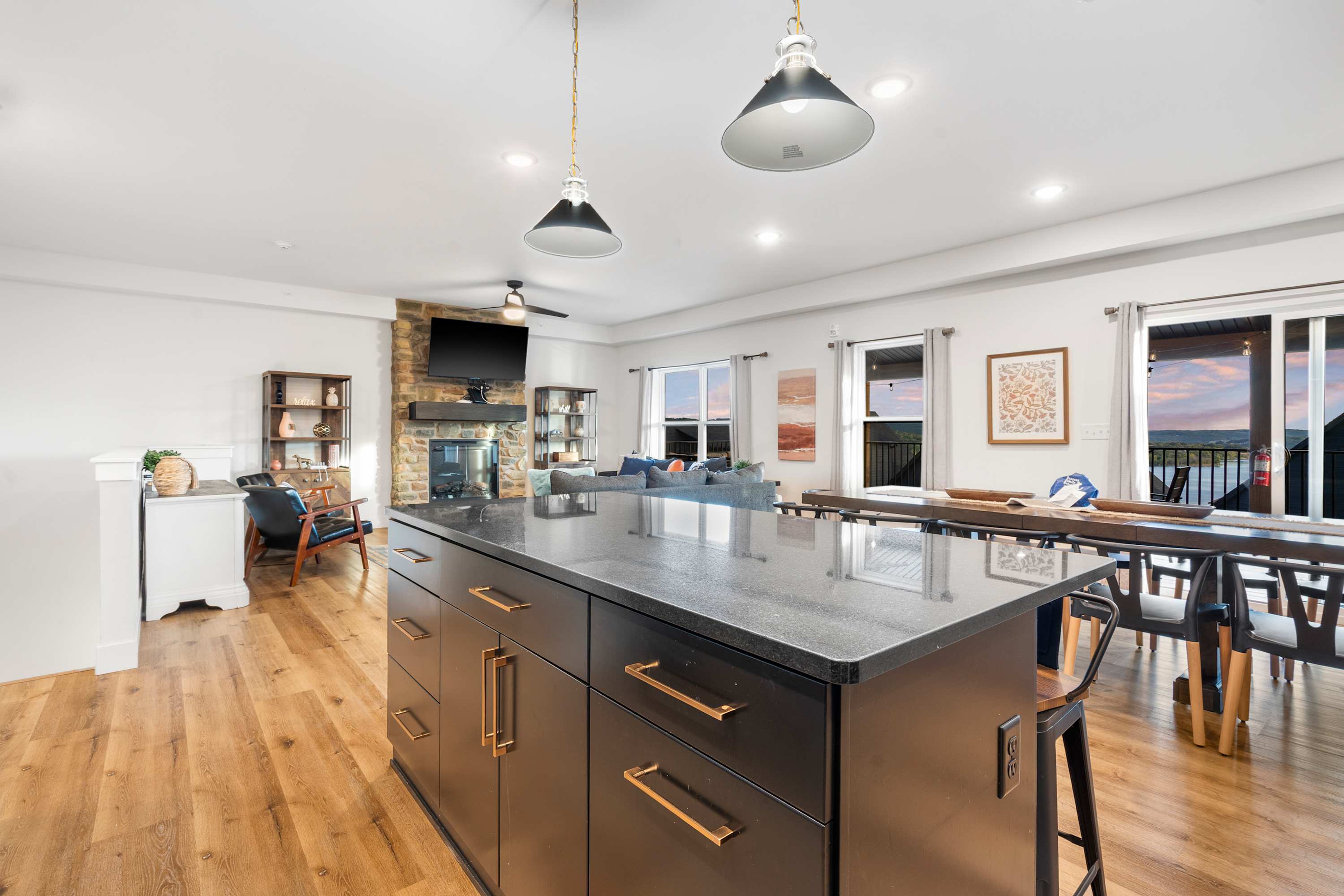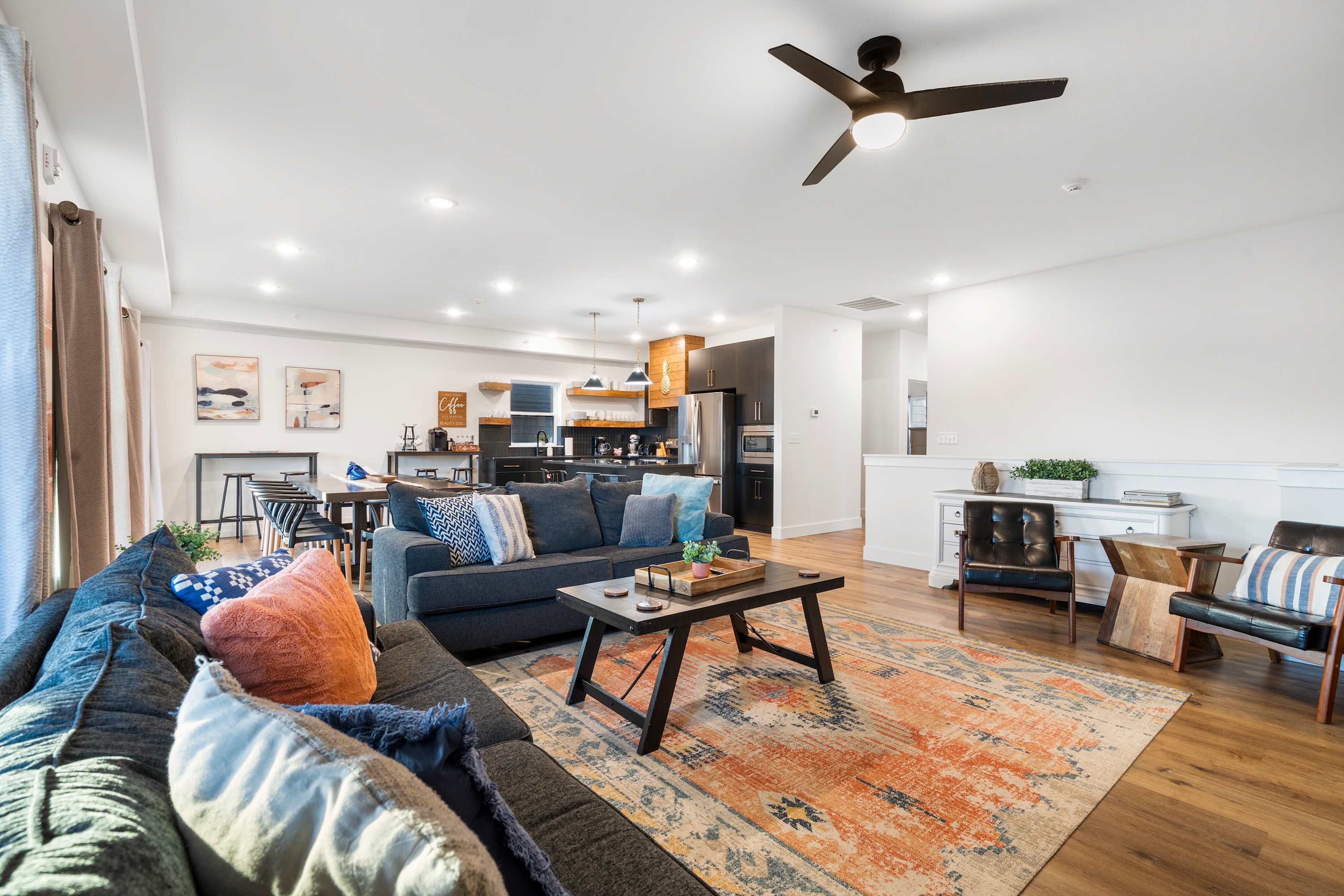 Step inside your vacation retreat, where style and comfort come together. The living room invites you to gather around a decorative fireplace, with two plush couches, two armchairs, and a smart TV setting the scene for cozy evenings. The kitchen is a dream for any cook, featuring stainless steel appliances, sleek black counters and cabinetry, a spacious island with seating for four, and additional bar-style seating lining the wall for casual bites. Share meals at the grand dining table for twelve, perfect for big family dinners or festive celebrations.