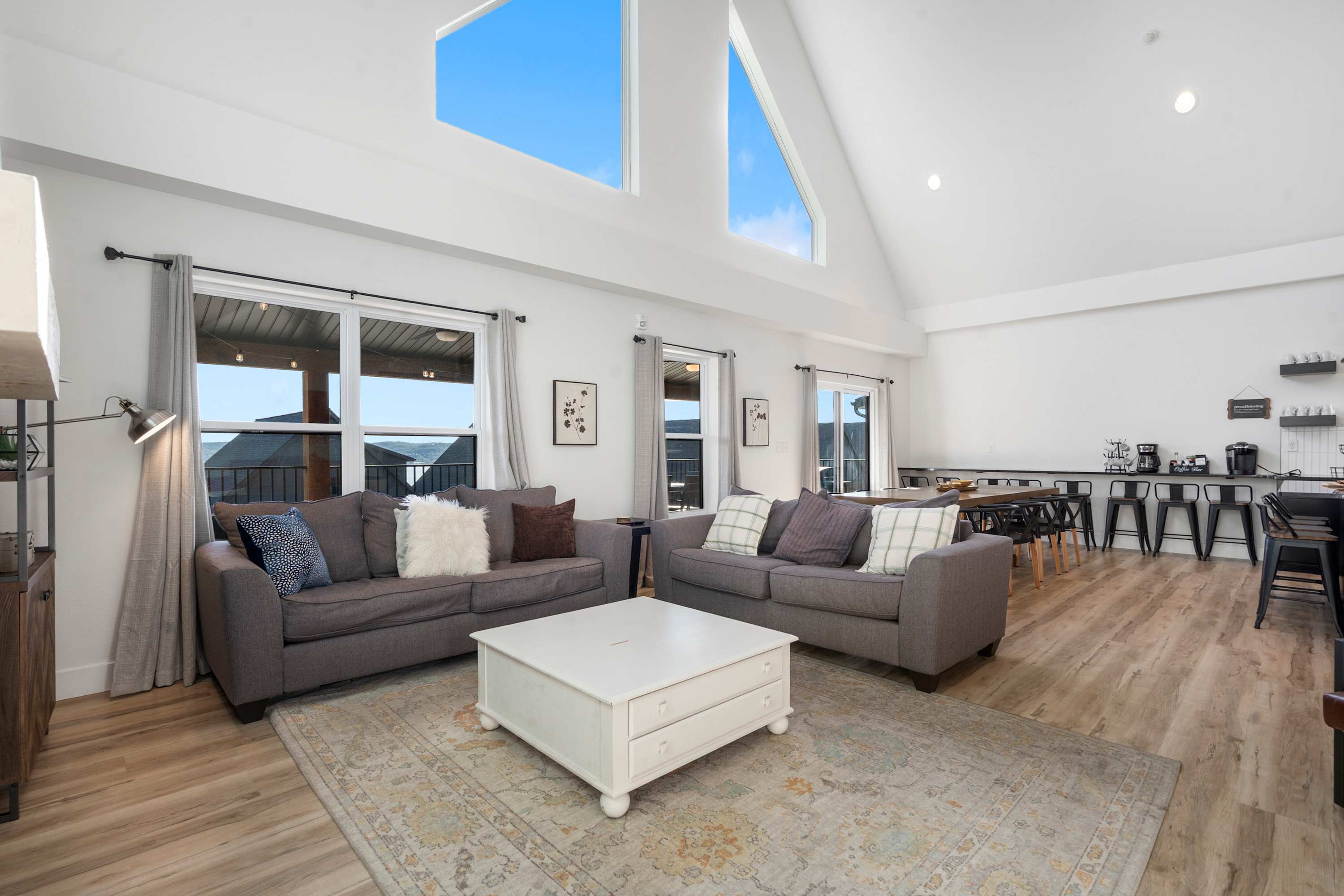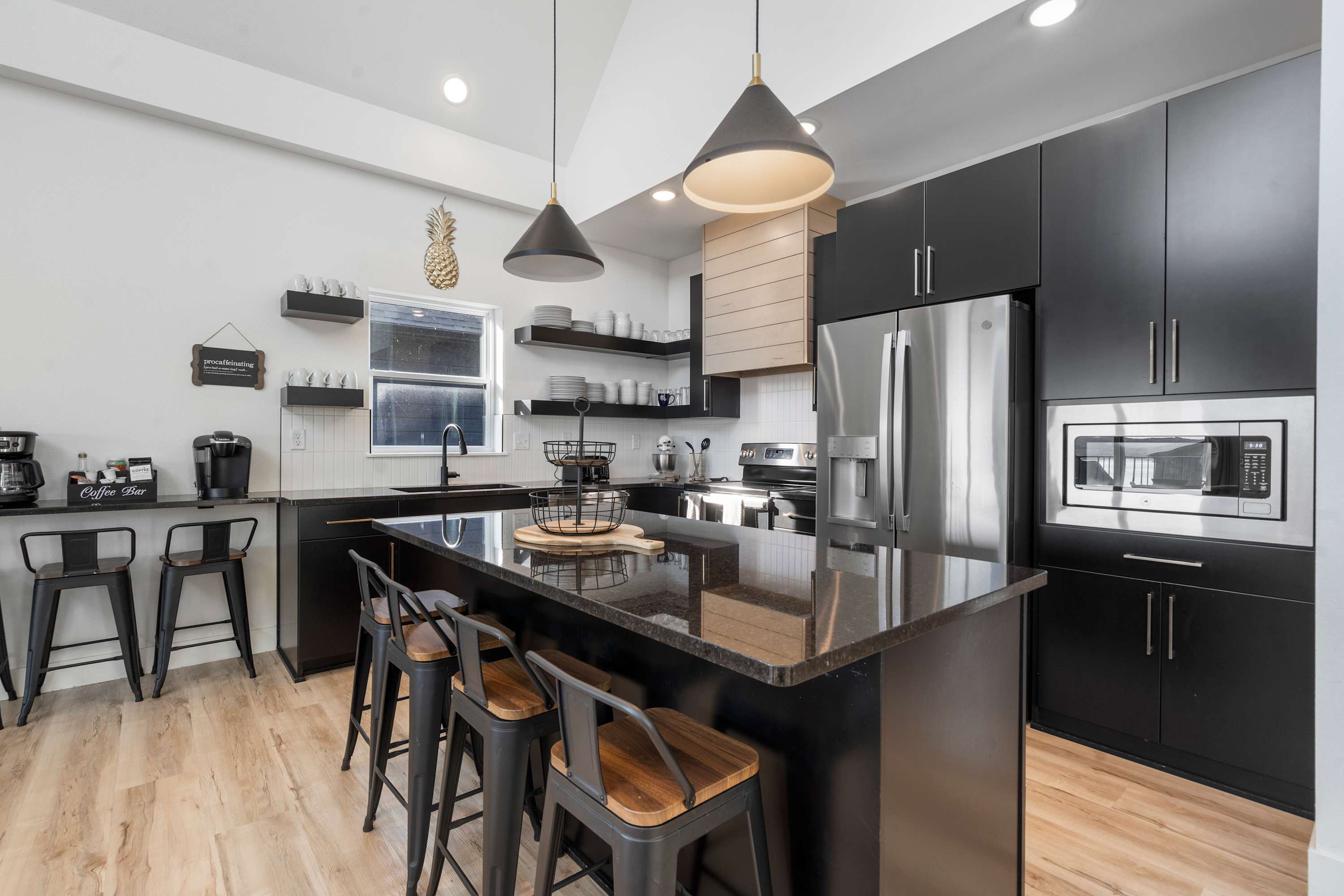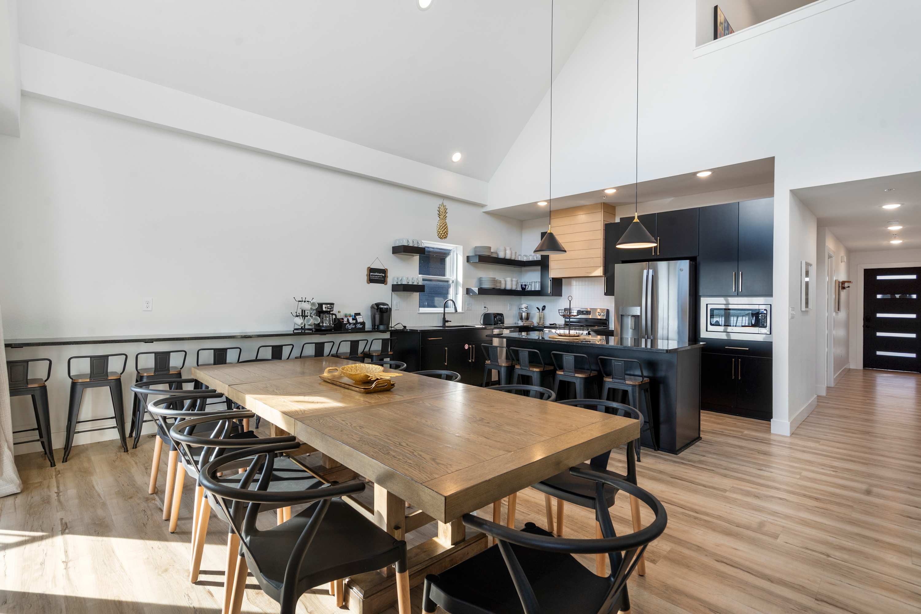 Inside, soaring high ceilings and an open-concept layout set a warm, inviting tone. The living room offers two comfortable couches, two chairs, and a smart TV, creating the perfect place to relax after a day on the water. The kitchen combines modern dark finishes with warm accents, featuring stainless steel appliances, a spacious island with seating for four, and extra bar-style seating along the wall. Gather around the dining table for ten to enjoy meals and conversation together in style.