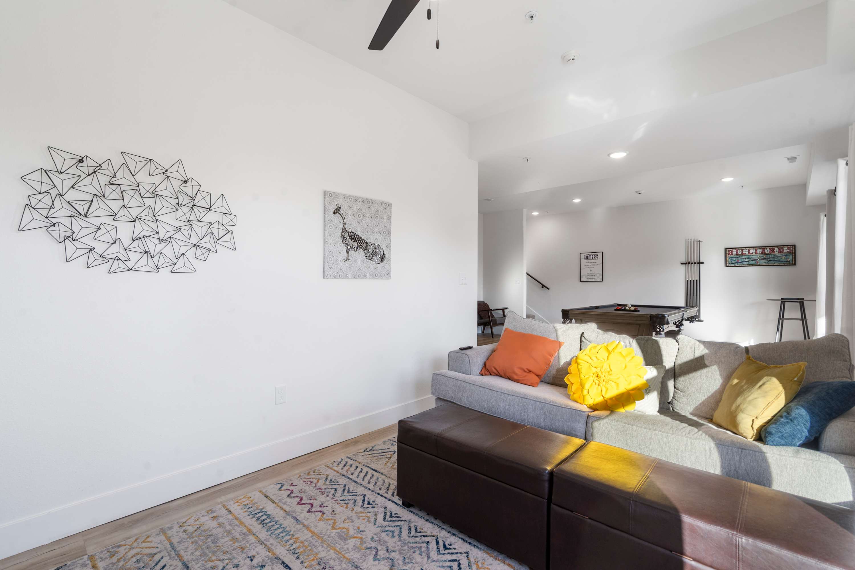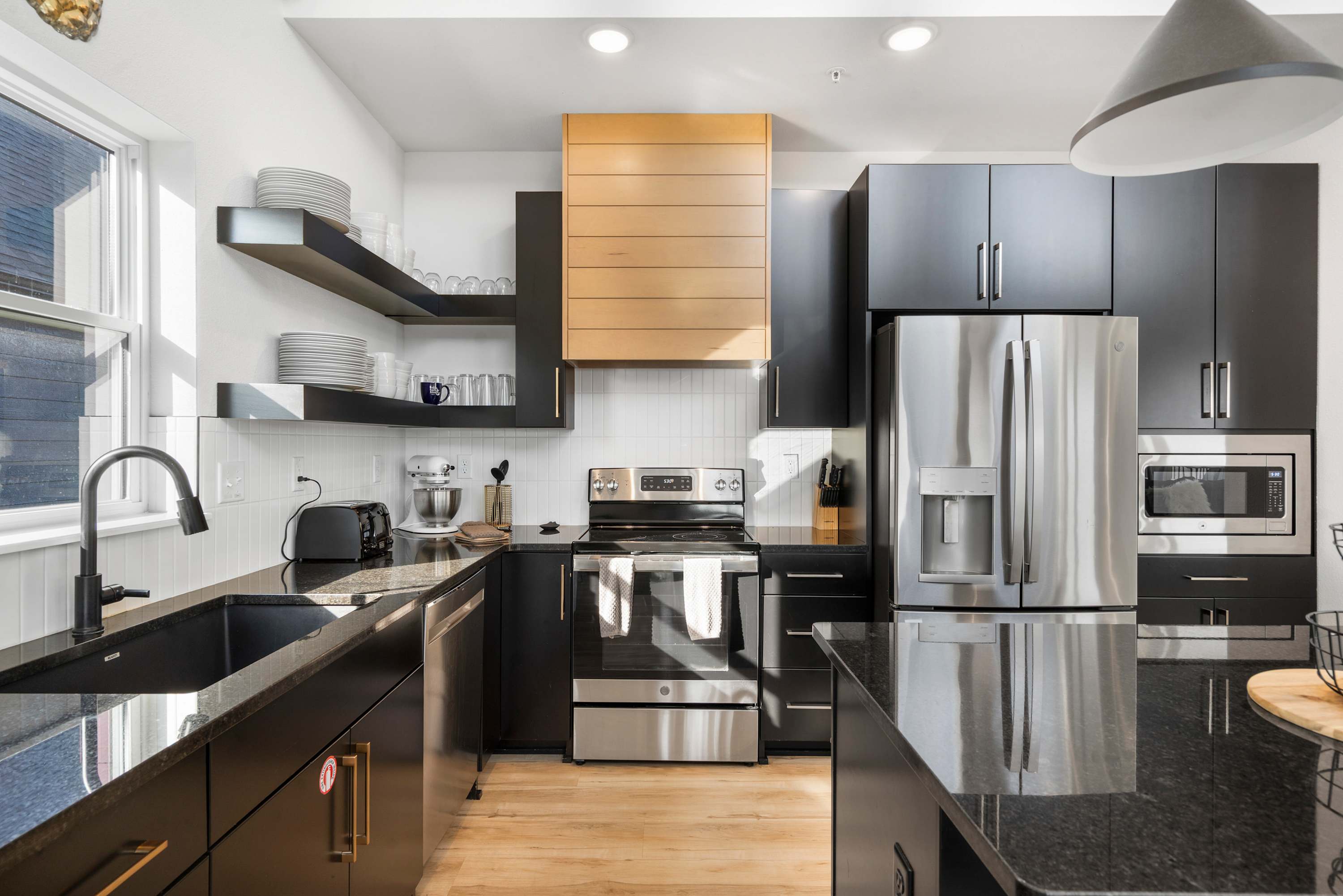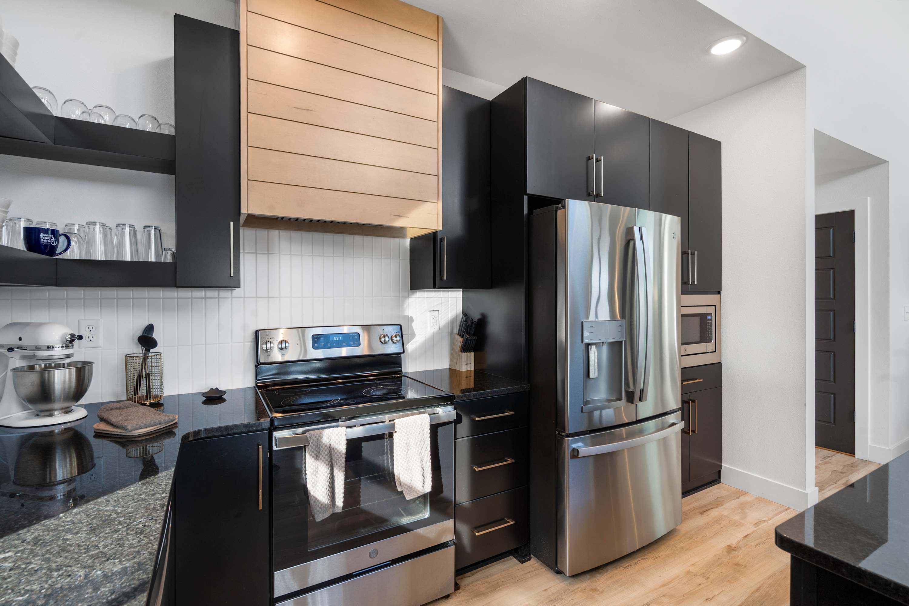 Inside, soaring high ceilings and an open-concept layout set a warm, inviting tone. The living room offers two comfortable couches, two chairs, and a smart TV, creating the perfect place to relax after a day on the water. The kitchen combines modern dark finishes with warm accents, featuring stainless steel appliances, a spacious island with seating for four, and extra bar-style seating along the wall. Gather around the dining table for ten to enjoy meals and conversation together in style.