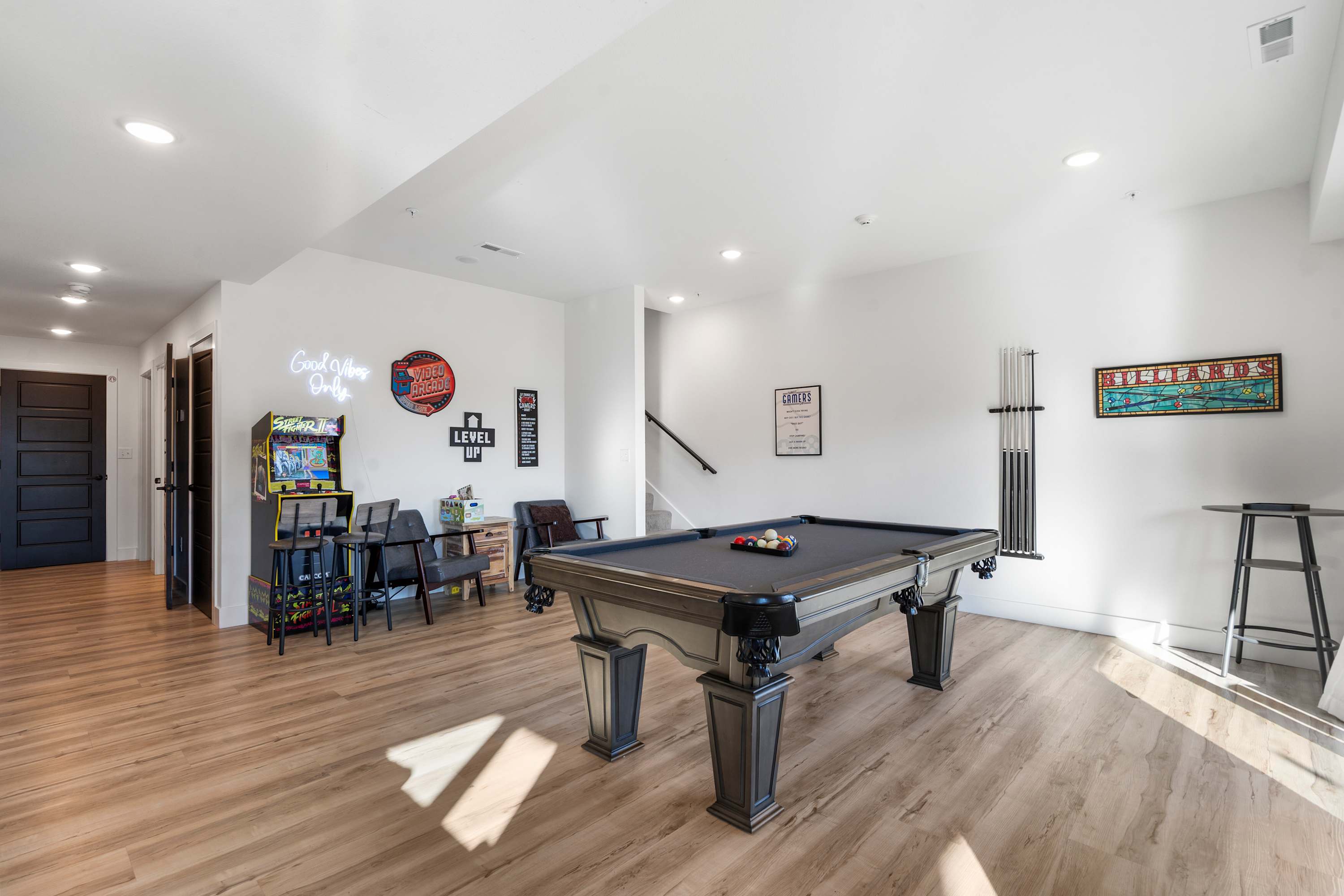 Entertainment continues in the game room, where a pool table, a Street Fighter arcade game with dozens of classic games, cable TV, and a cozy couch make it a favorite hangout spot. Step outside to take in the water views—on the upper deck you’ll find a dining table for six and a grill for alfresco feasts, while the lower deck invites you to unwind in the hot tub or relax in the comfortable seating.