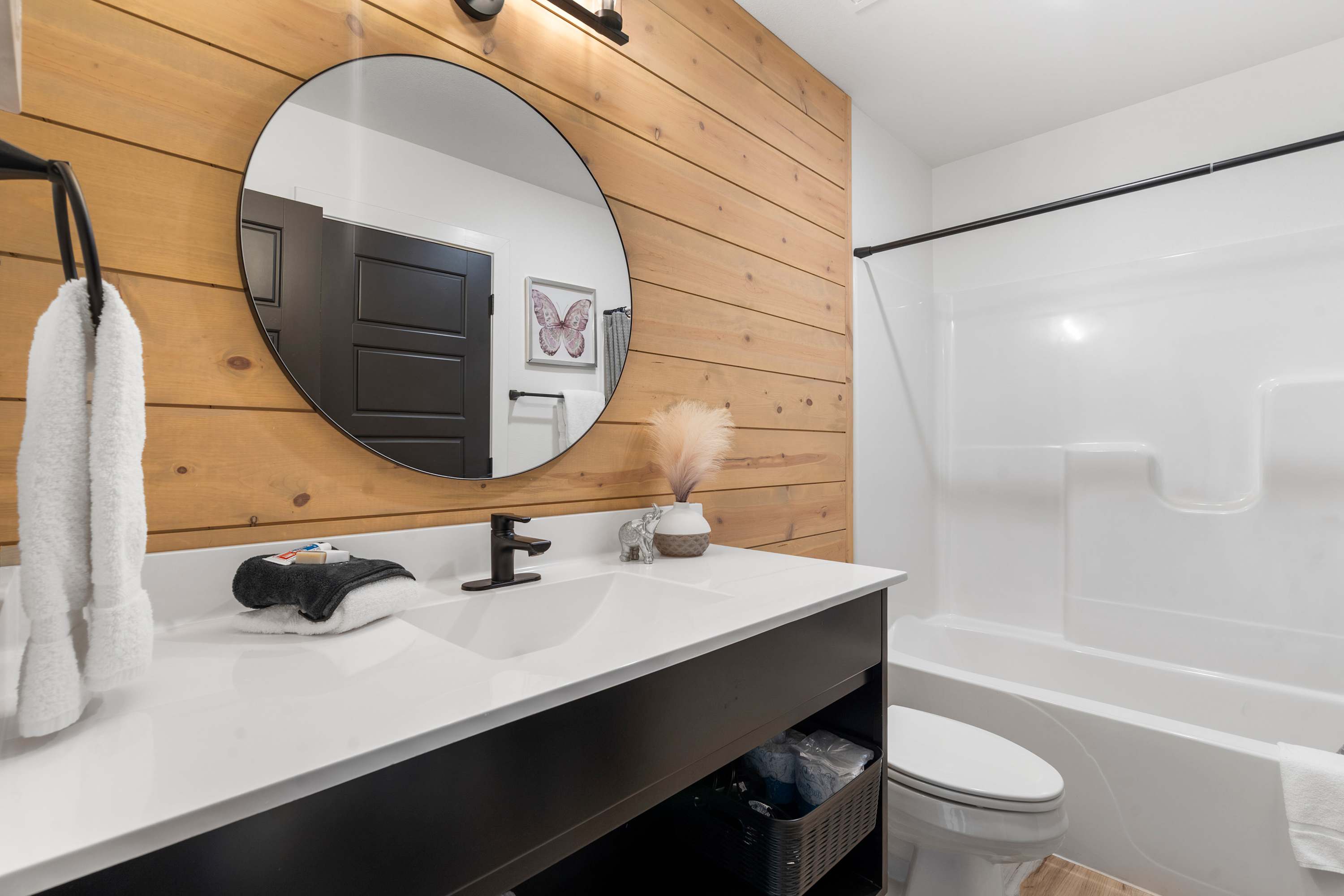 Bedroom #1 includes a king size bed, a smart TV, and an ensuite bathroom with a single vanity and a shower/tub combo.