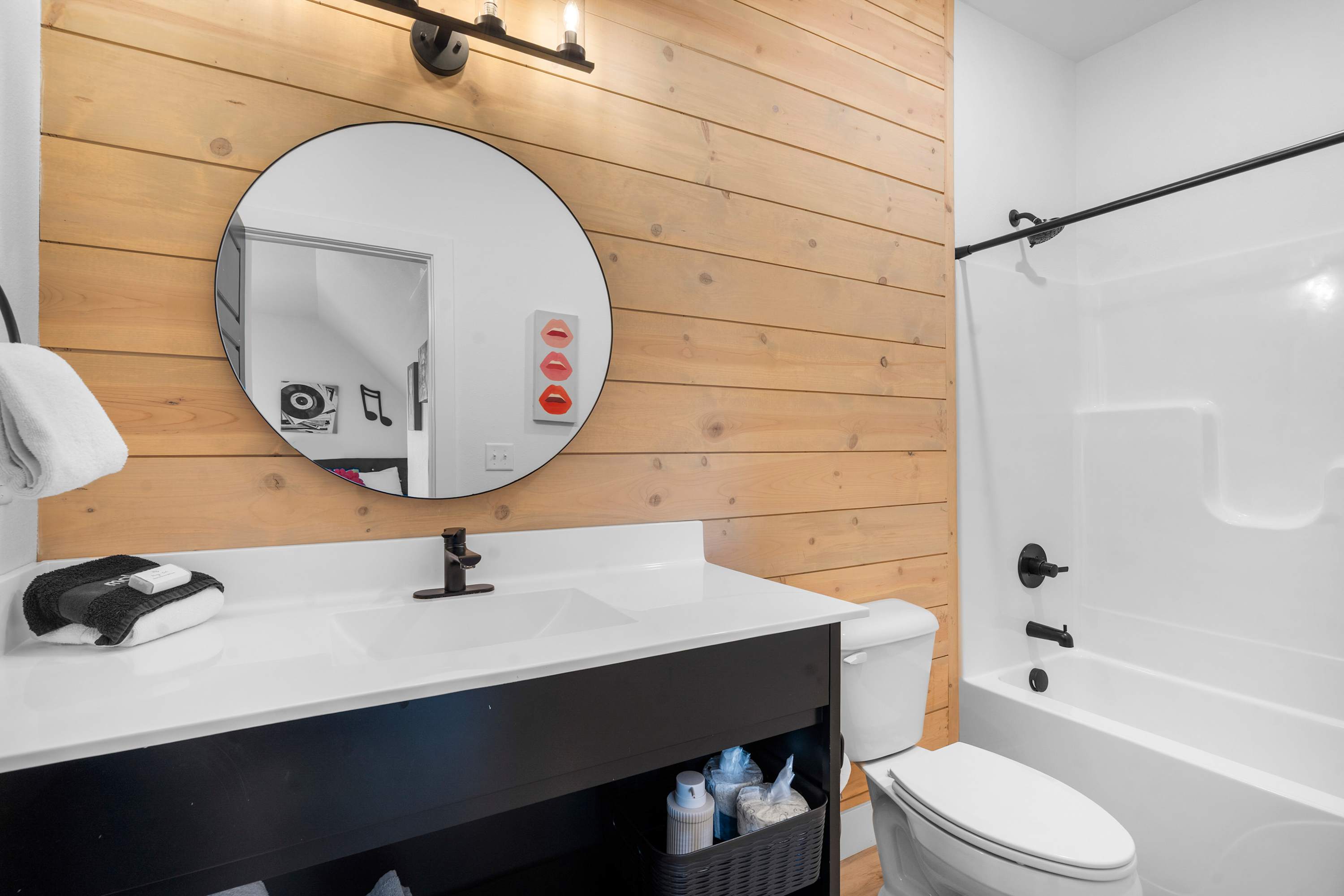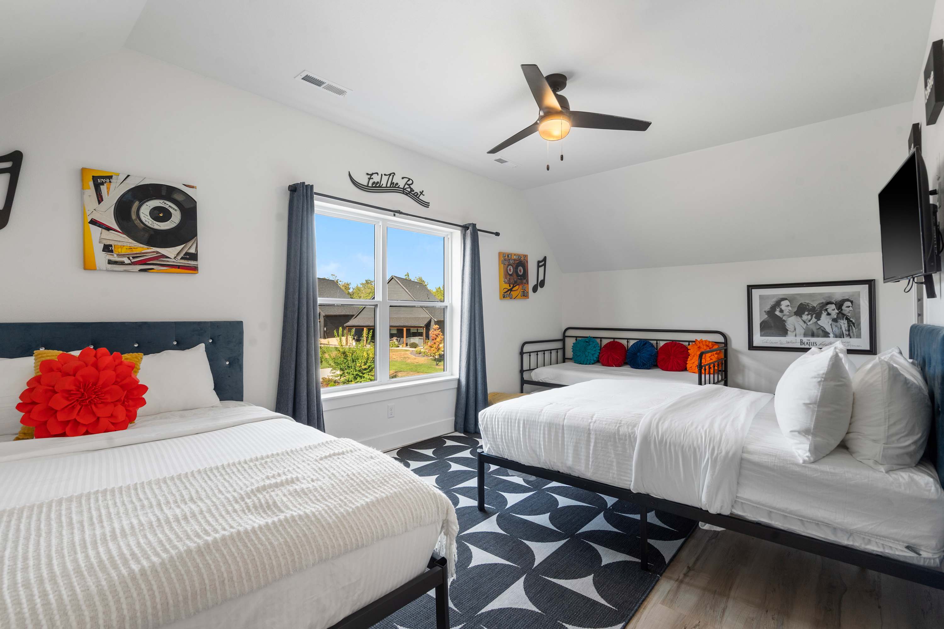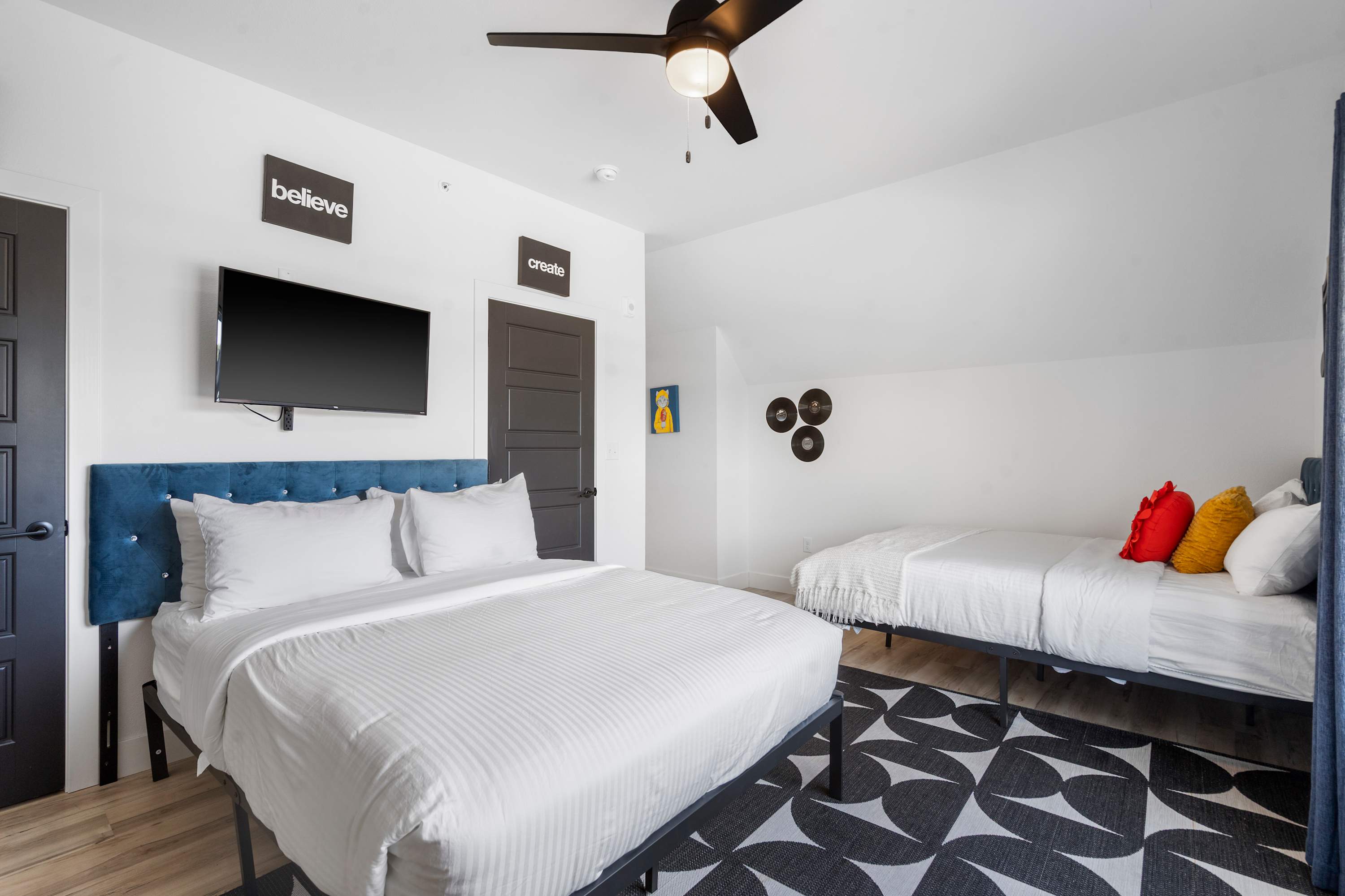 Bedroom #3 includes 2 queen size beds, 2 twin size beds, a smart TV, and an ensuite bathroom with a single vanity and a shower/tub combo.