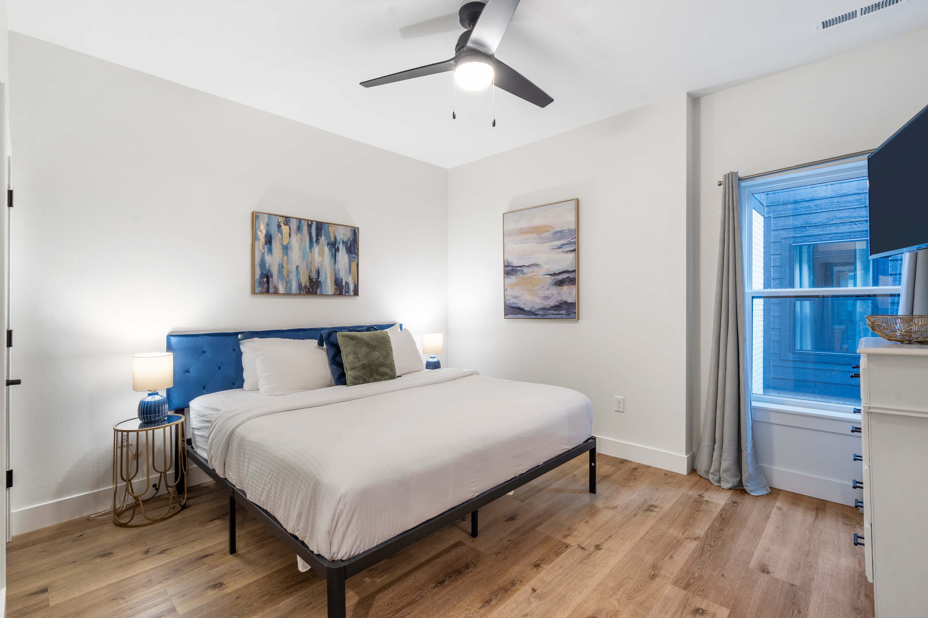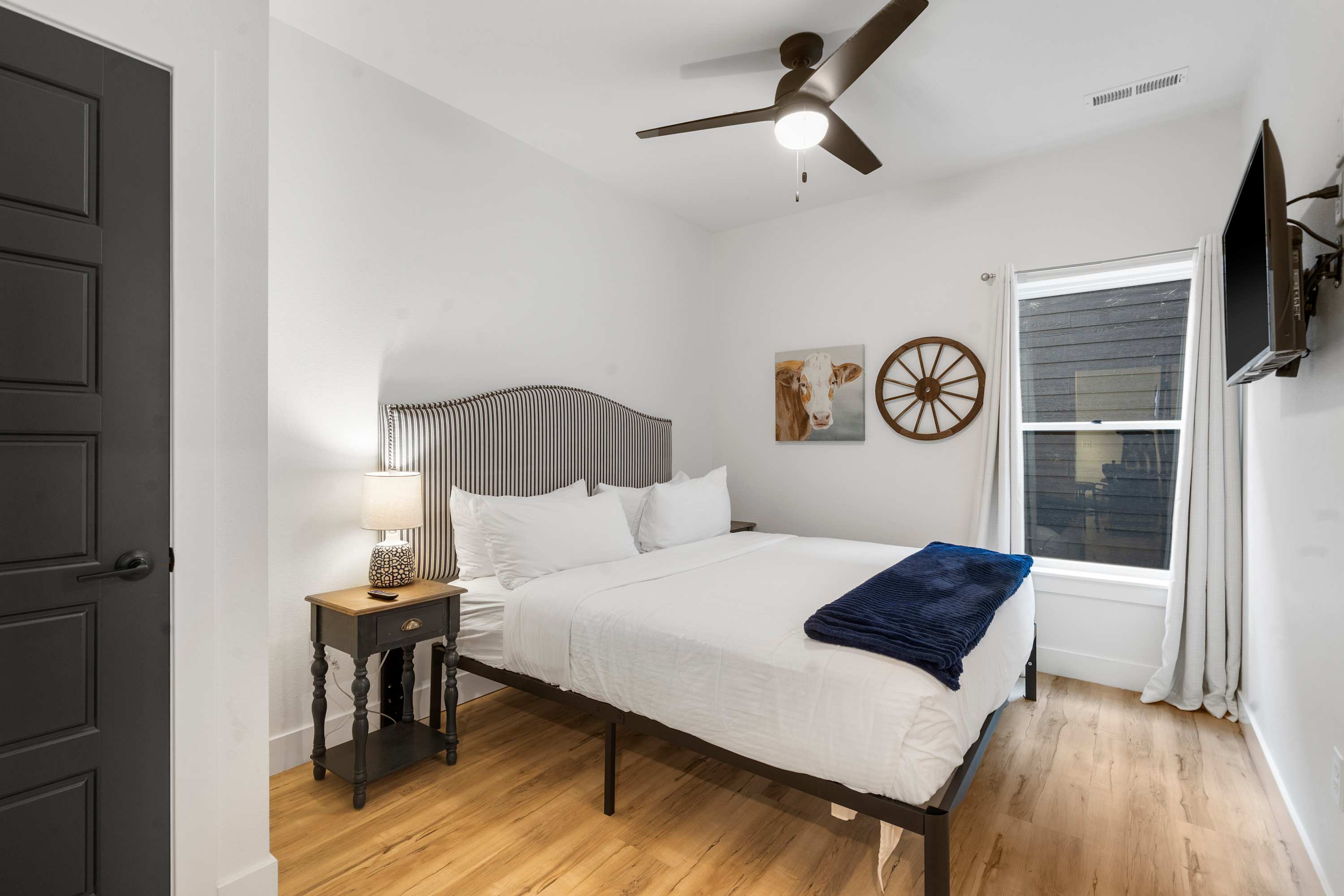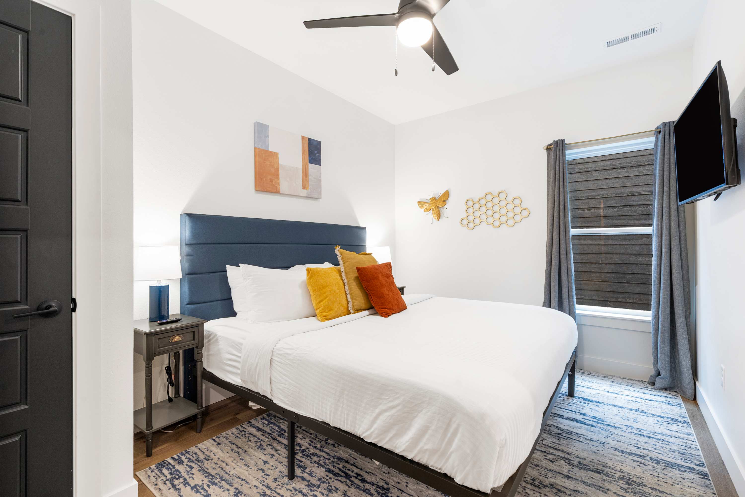 Bedroom #4 includes a king size bed, a smart TV, and an ensuite bathroom with a single vanity and a shower/tub combo.