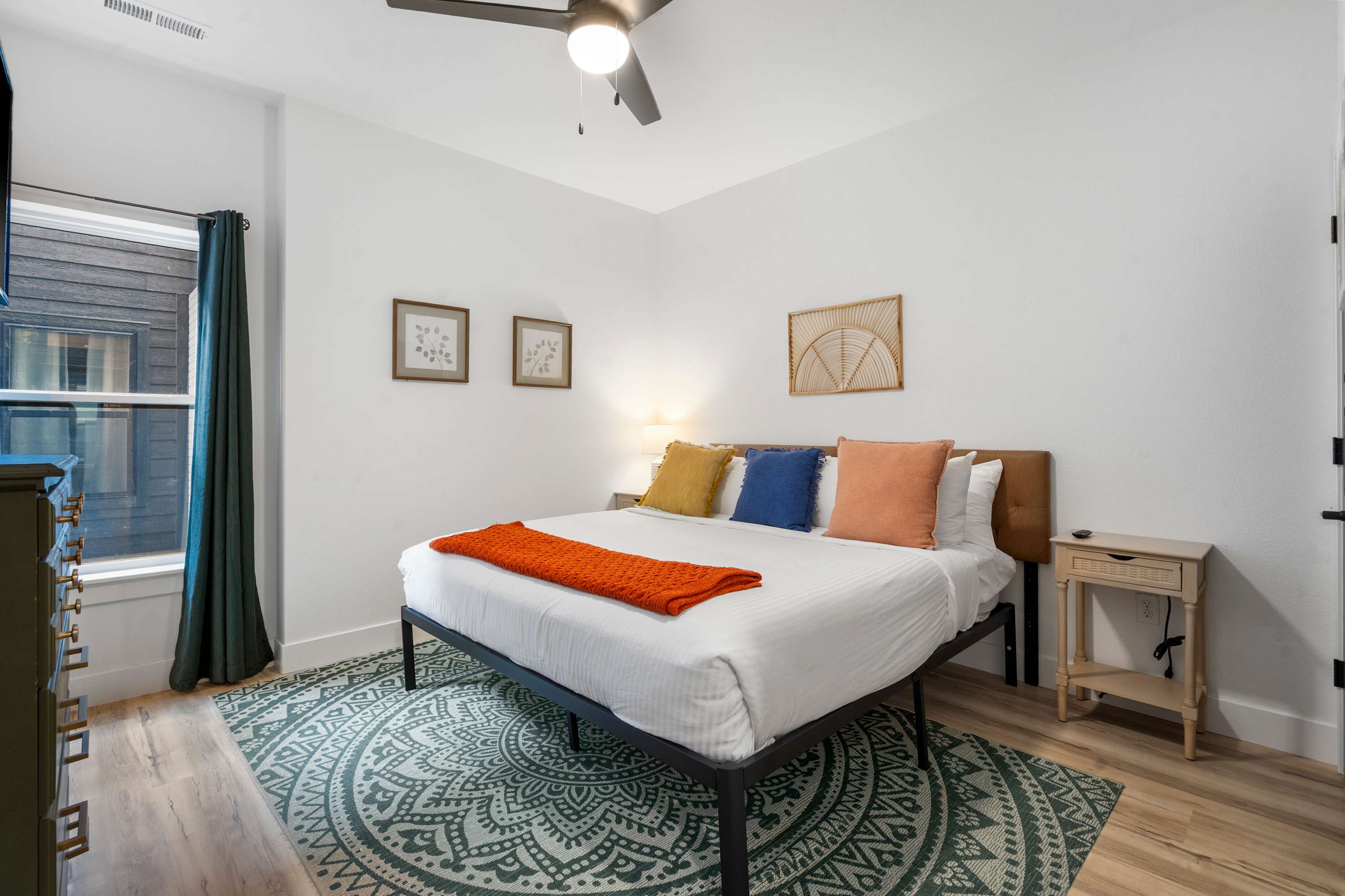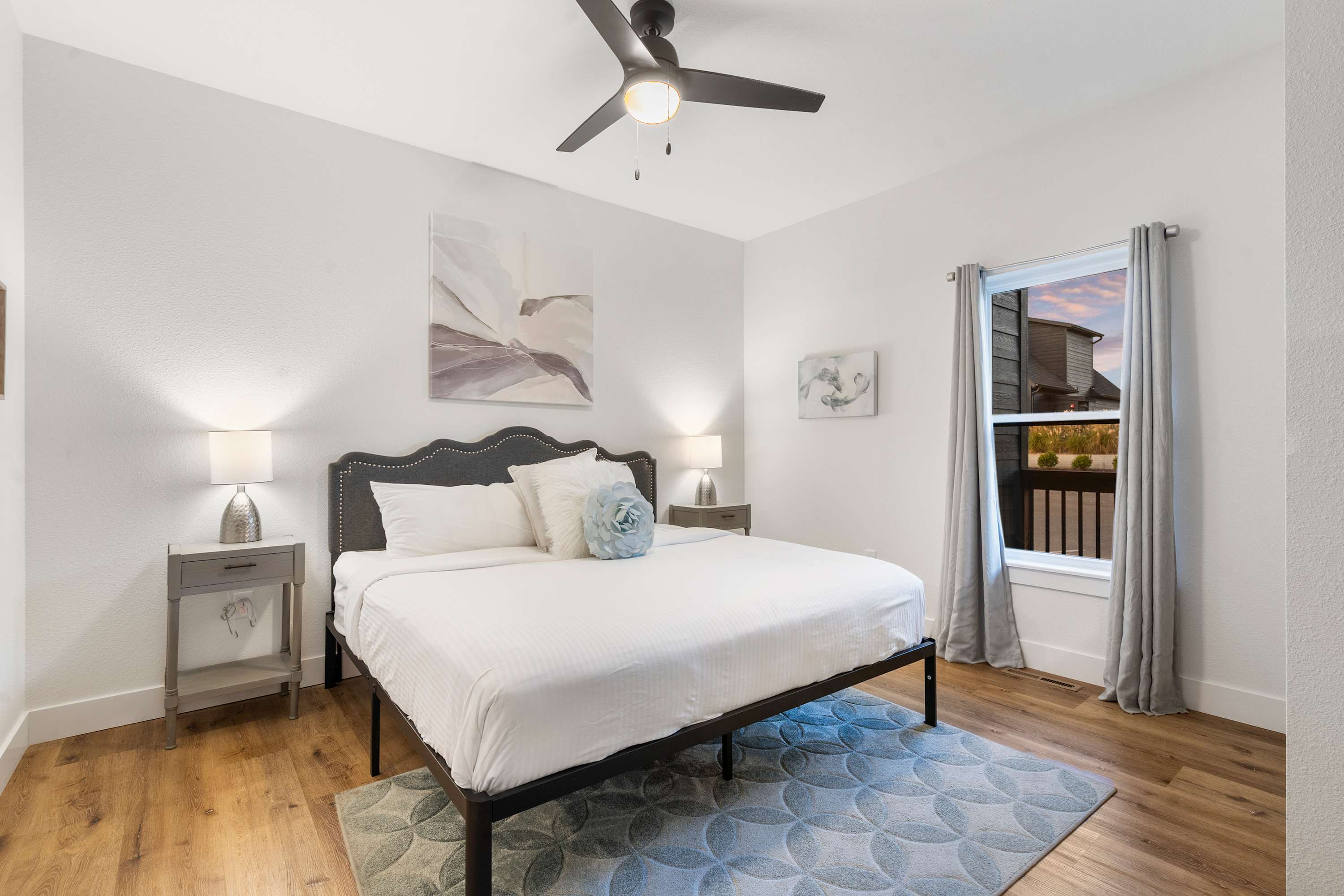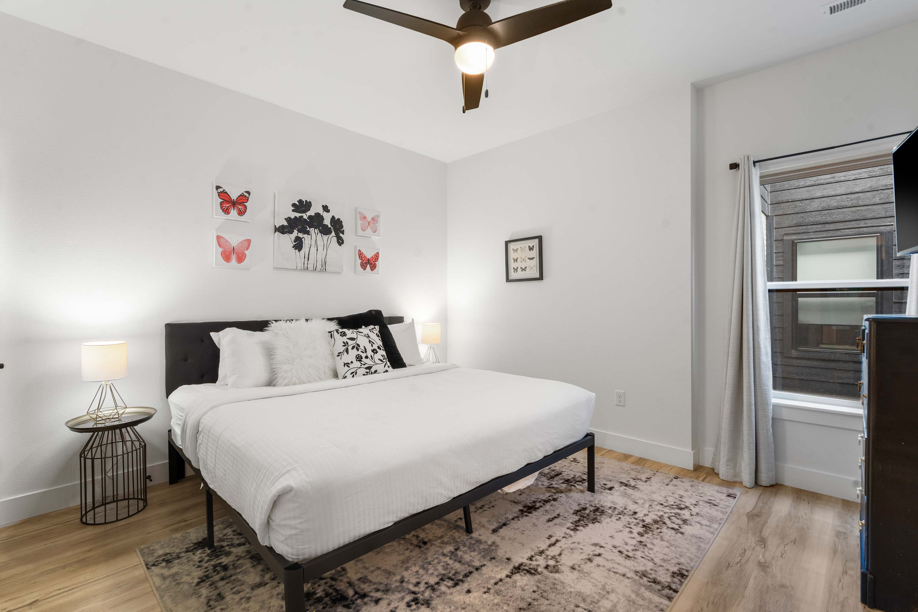 Bedroom #4 includes a king size bed, a smart TV, and an ensuite bathroom with a single vanity and a shower/tub combo.