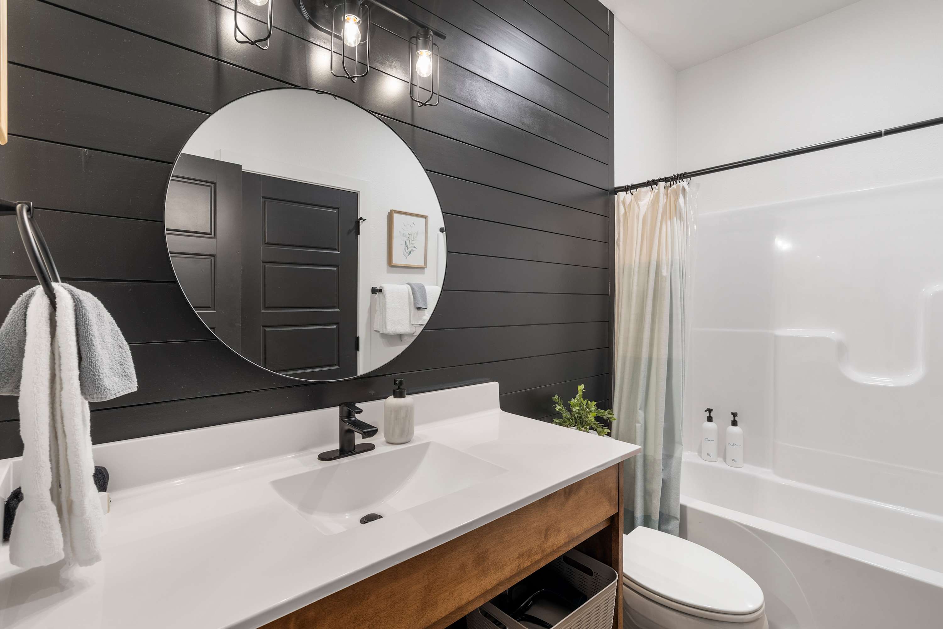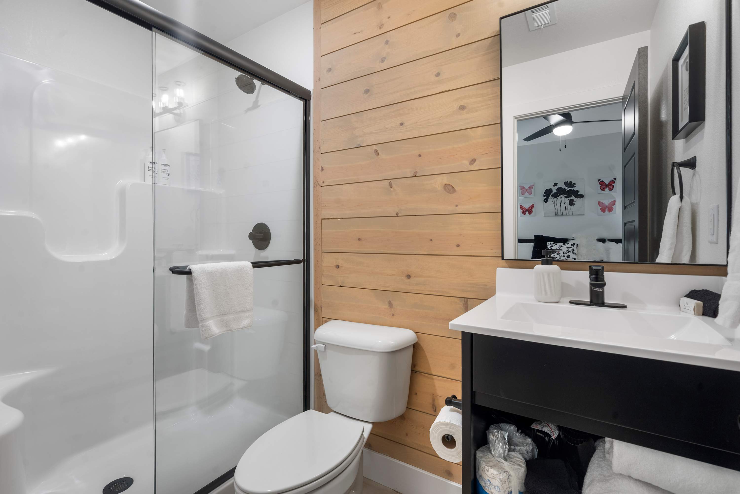 Bedroom #3 includes 2 queen size beds, 2 twin size beds, a smart TV, and an ensuite bathroom with a single vanity and a shower/tub combo.