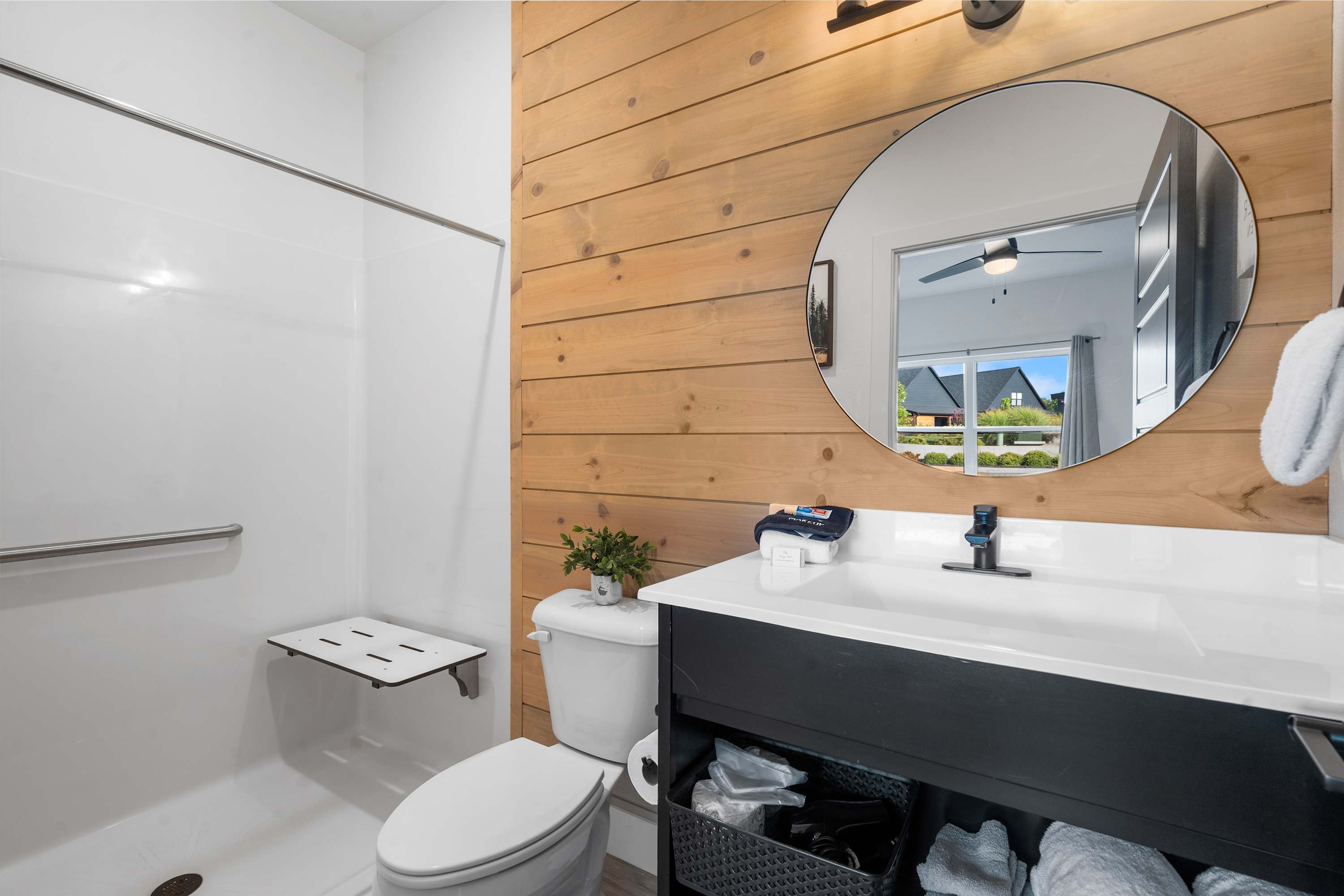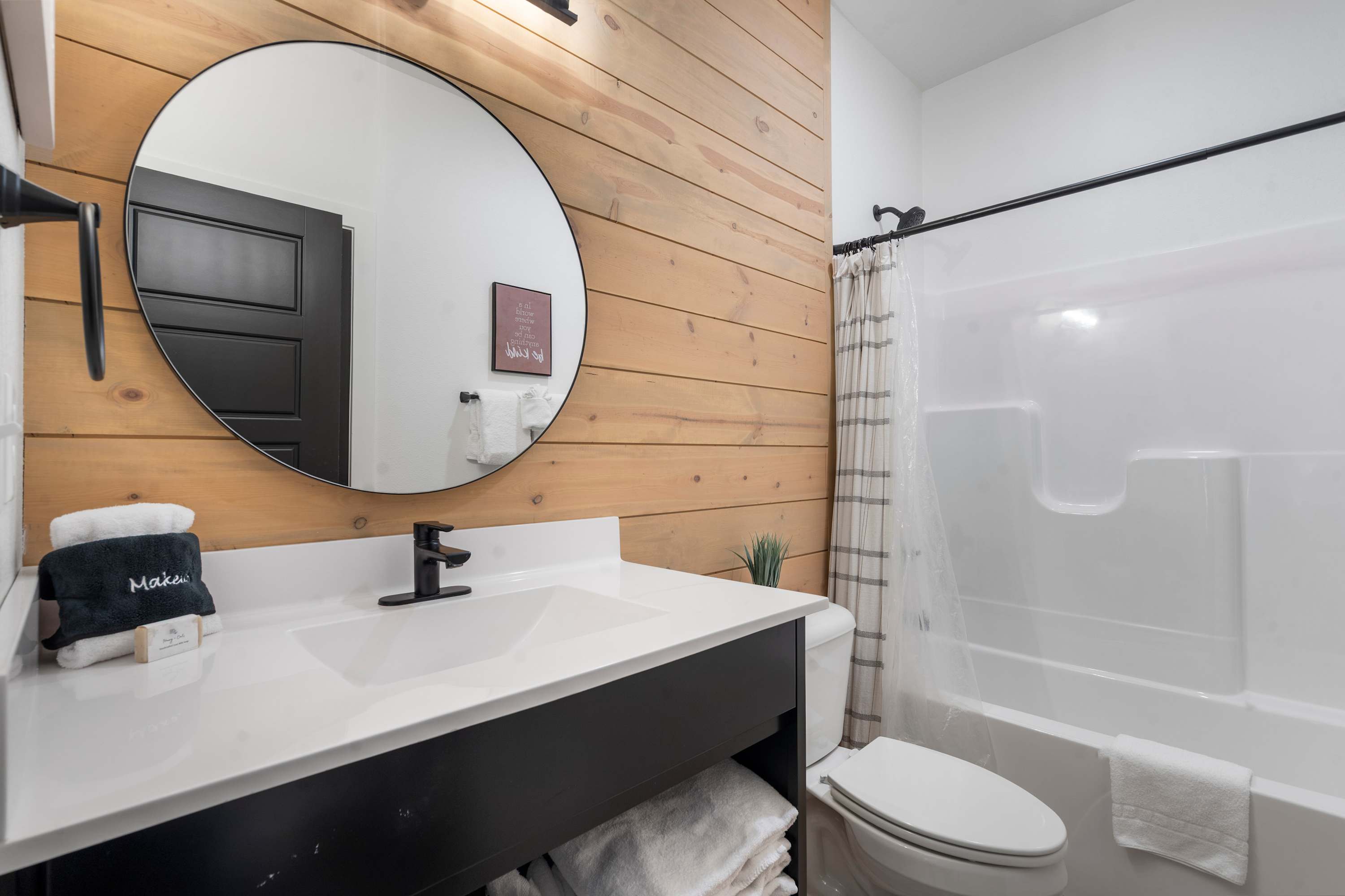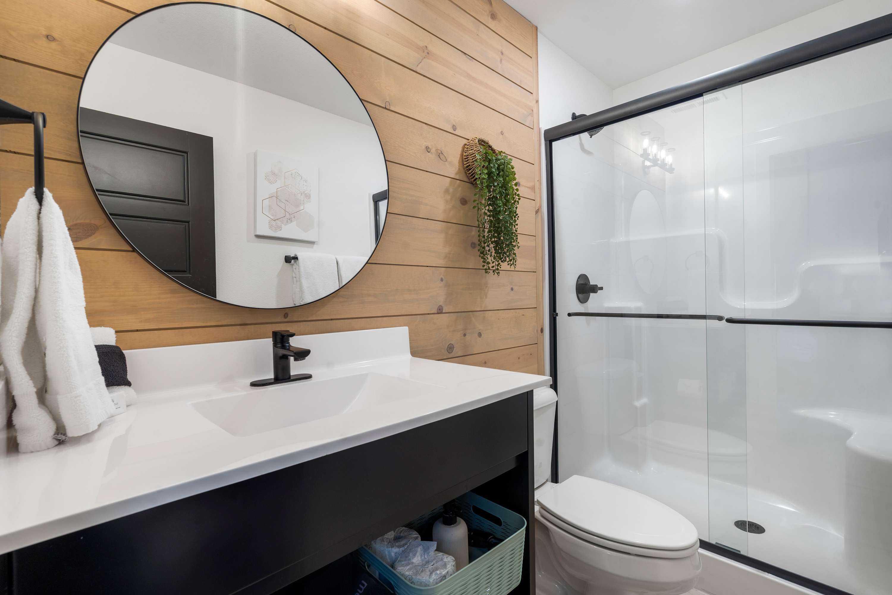 Bedroom #1 includes a king size bed, a smart TV, and an ensuite bathroom with a single vanity and a shower/tub combo.