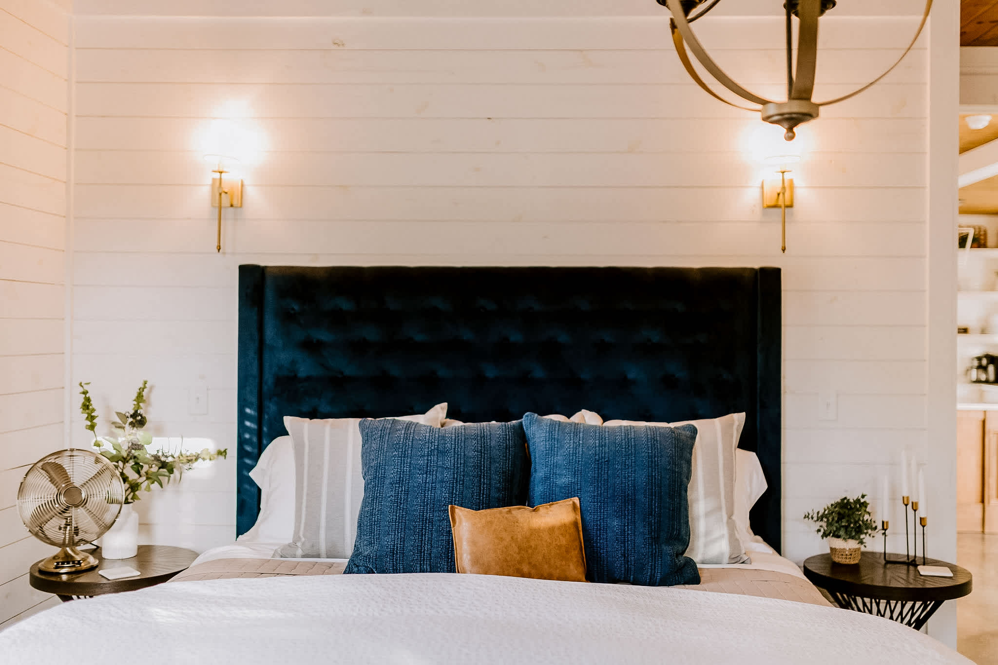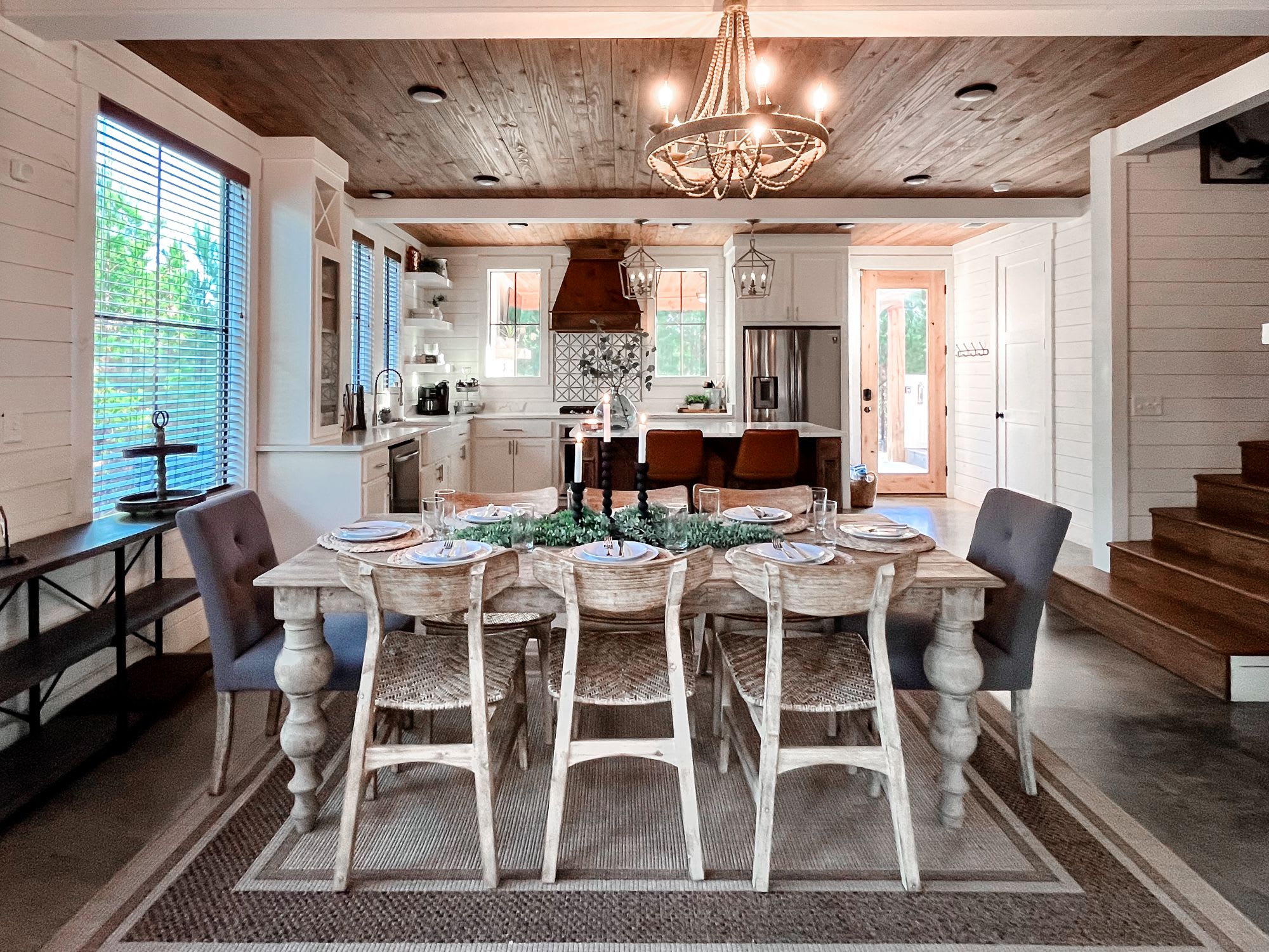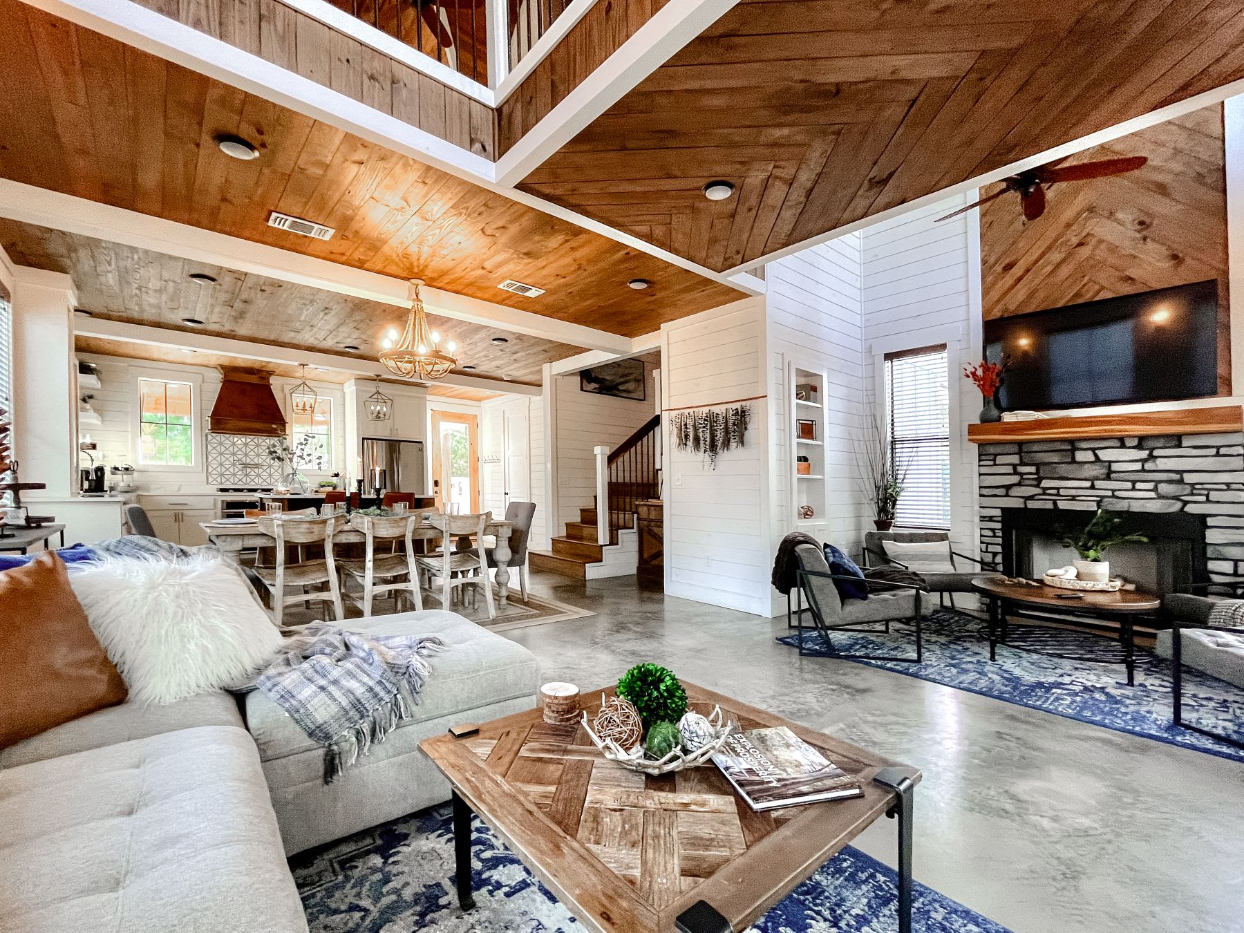 From the moment you arrive, the charm is undeniable. A front entry patio with seating welcomes you into the open-concept interior, where the living room sets the stage for cozy nights with an oversized sectional, a seating area for four in front of the gas fireplace, and a smart TV mounted above. Just steps away, the classy farmhouse kitchen features stainless steel appliances, a farmhouse sink, pot filler over the stove, and counter seating for three—making meal preparation as enjoyable as dining together. Gather around the stunning dining table for eight, perfectly positioned between the kitchen and living space, to share meals and memories.