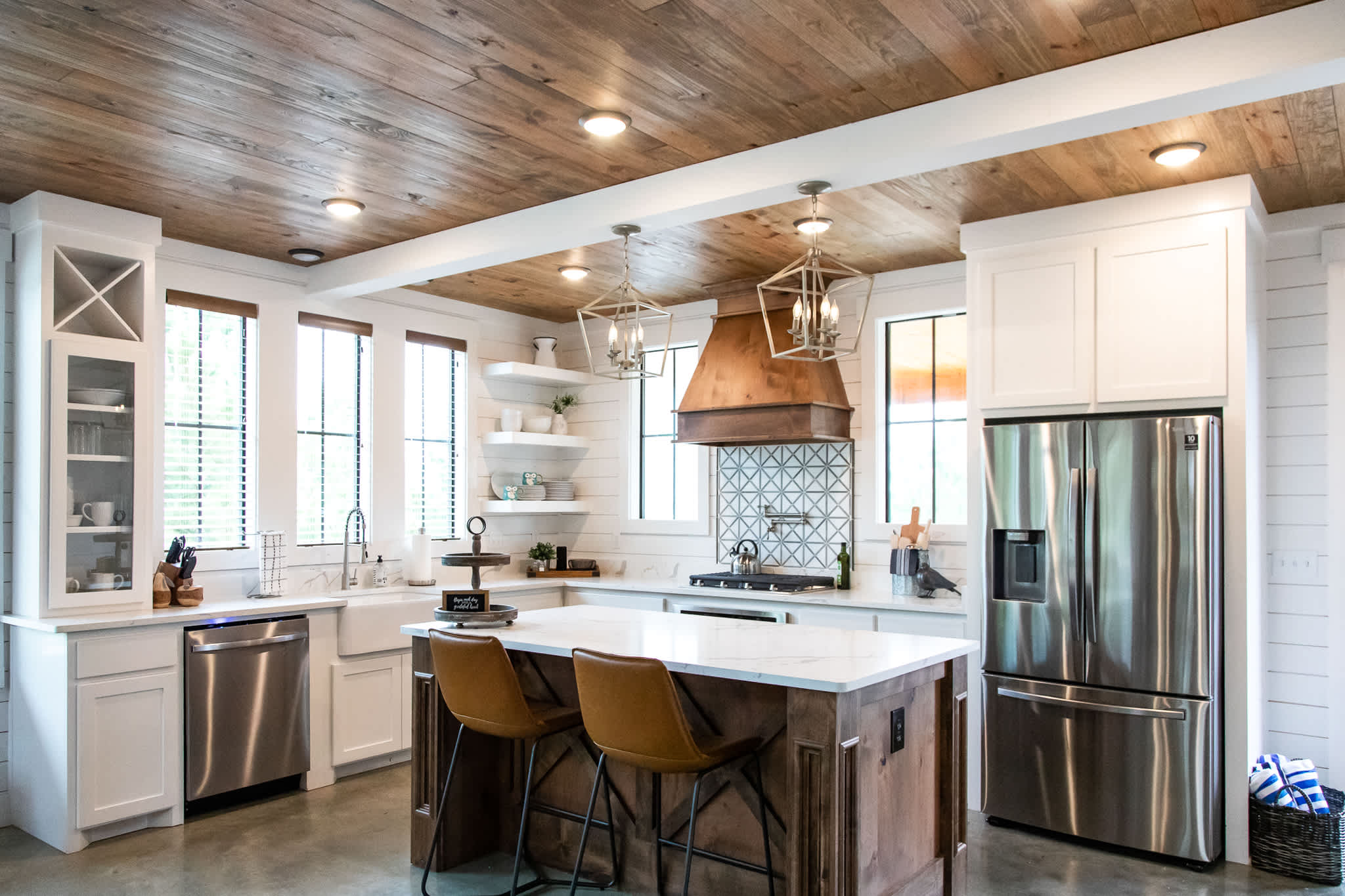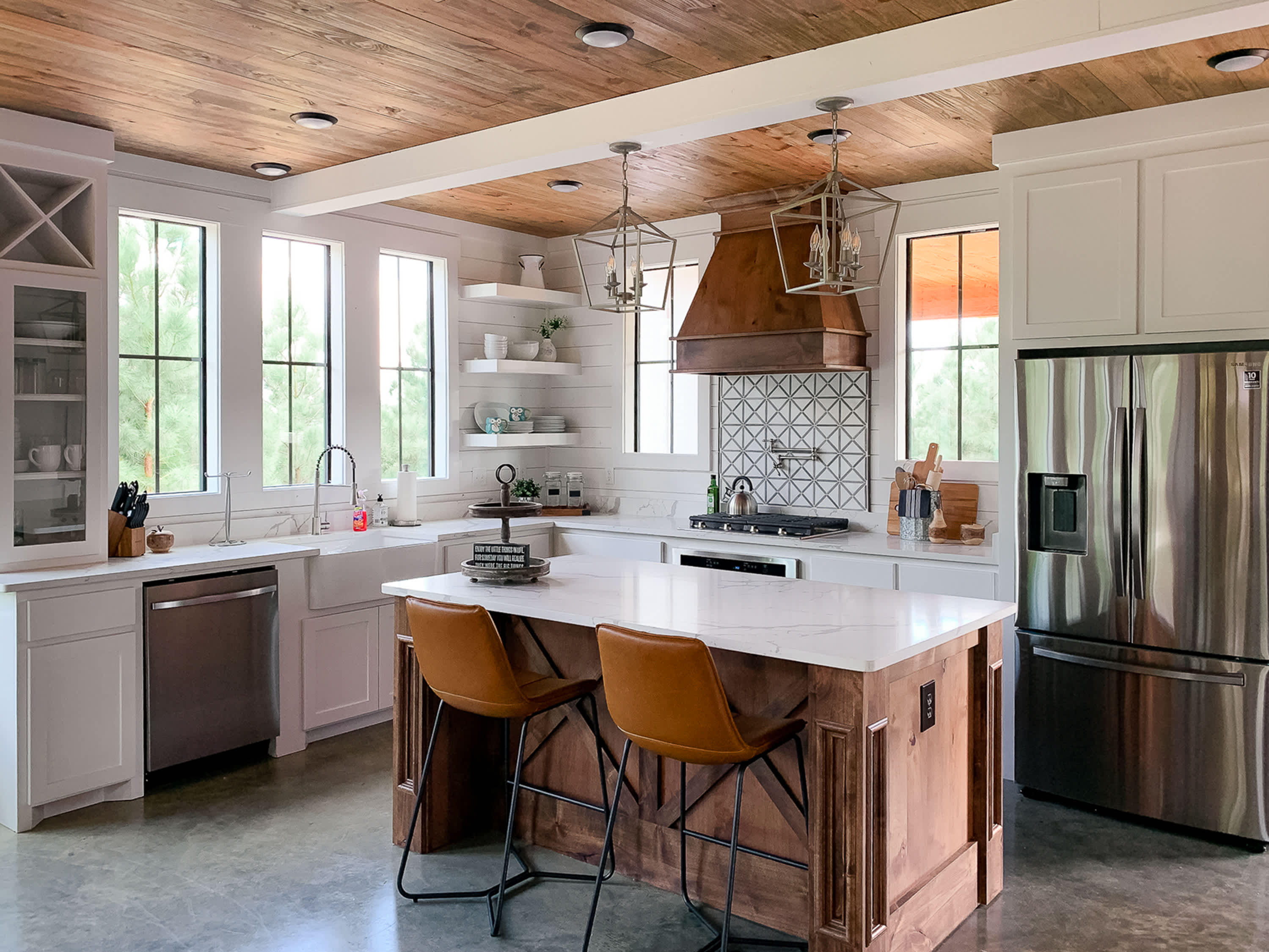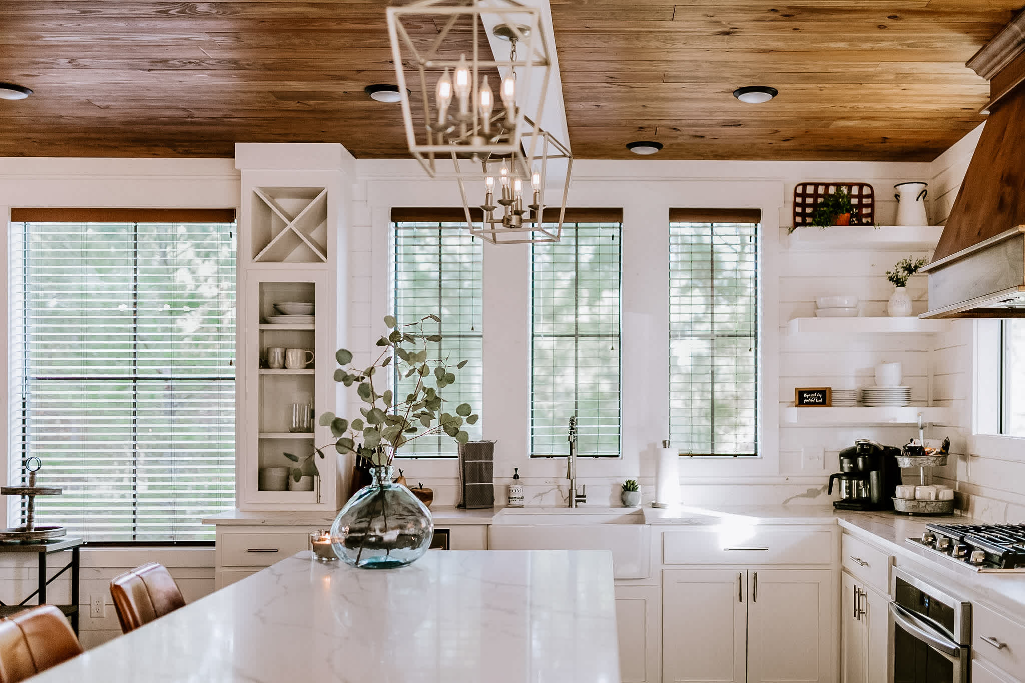 From the moment you arrive, the charm is undeniable. A front entry patio with seating welcomes you into the open-concept interior, where the living room sets the stage for cozy nights with an oversized sectional, a seating area for four in front of the gas fireplace, and a smart TV mounted above. Just steps away, the classy farmhouse kitchen features stainless steel appliances, a farmhouse sink, pot filler over the stove, and counter seating for three—making meal preparation as enjoyable as dining together. Gather around the stunning dining table for eight, perfectly positioned between the kitchen and living space, to share meals and memories.