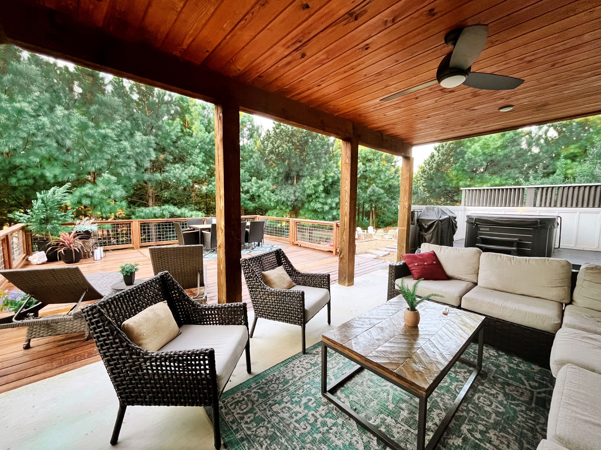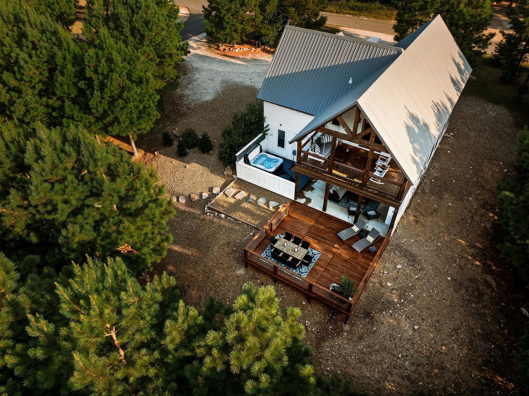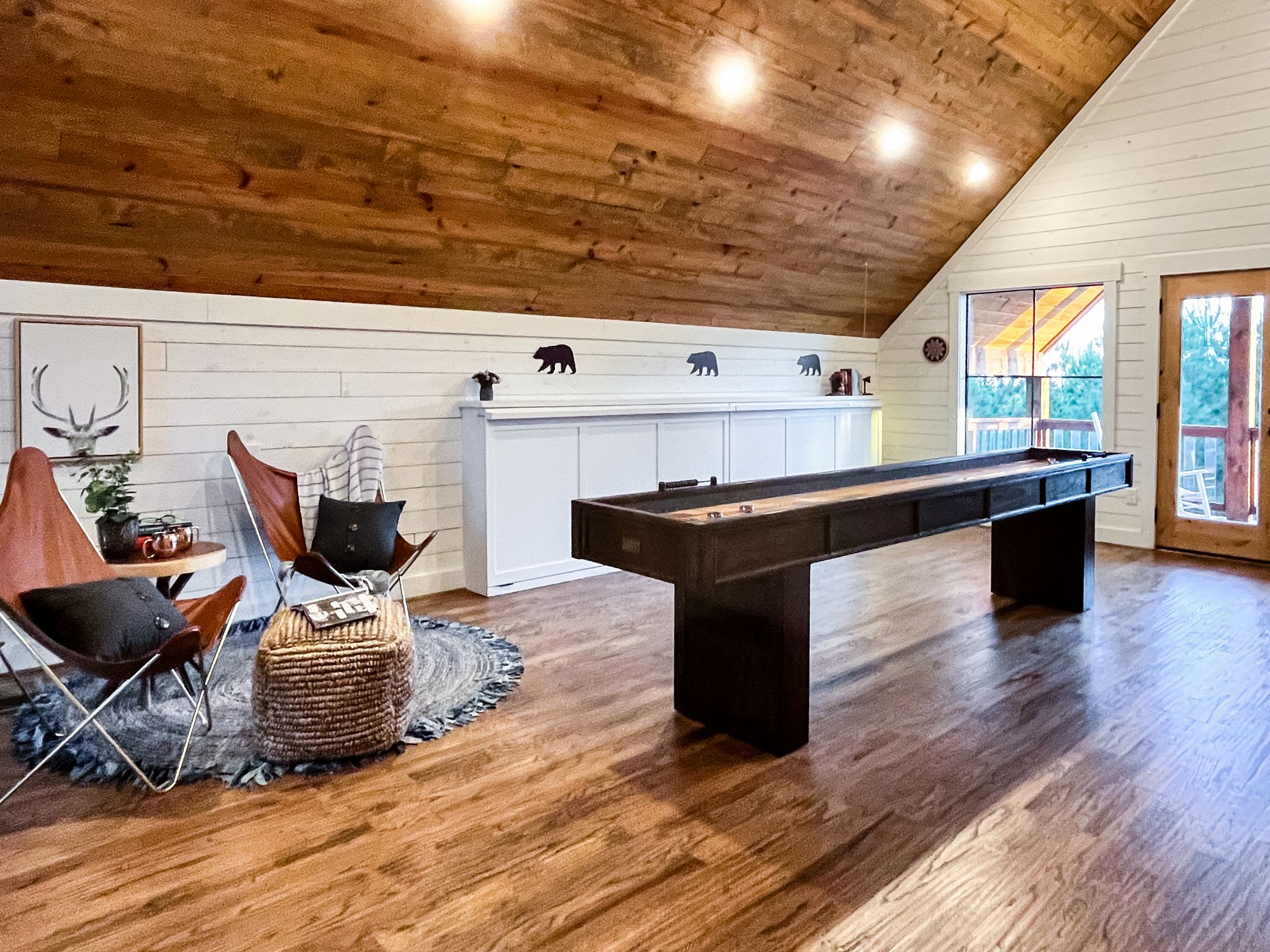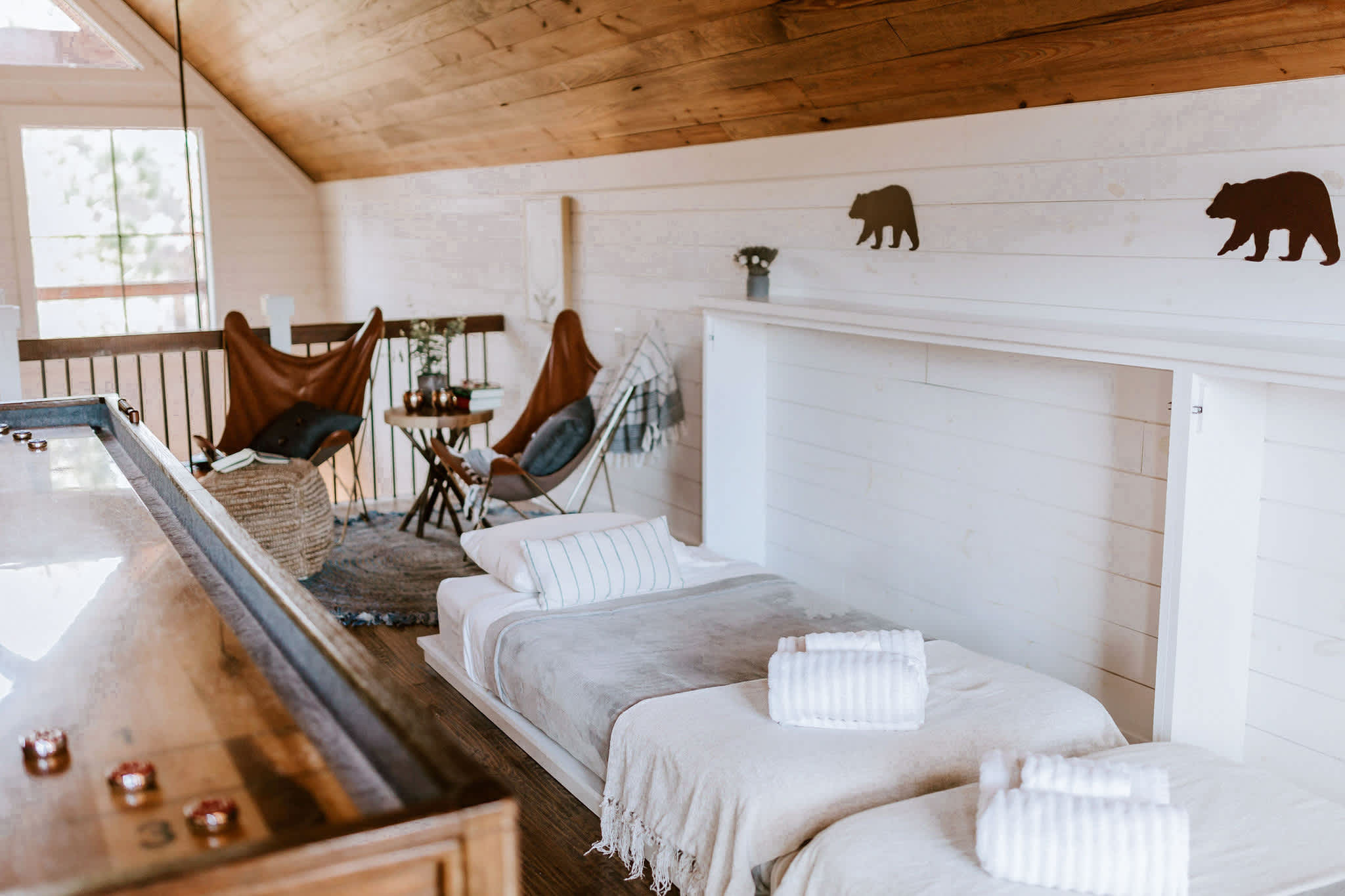 Upstairs, the loft game room brings everyone together with shuffleboard, an arcade machine, smart TV, and doors leading out to a private balcony with seating and a dreamy swinging daybed. Outdoors, the patio offers comfortable seating, a hot tub for evening soaks, and a grill, while the deck includes lounge seating and a dining table for eight. A few steps down, you’ll find a firepit with surrounding chairs—ideal for roasting marshmallows under the stars—and hammocks in the backyard for slow afternoons.