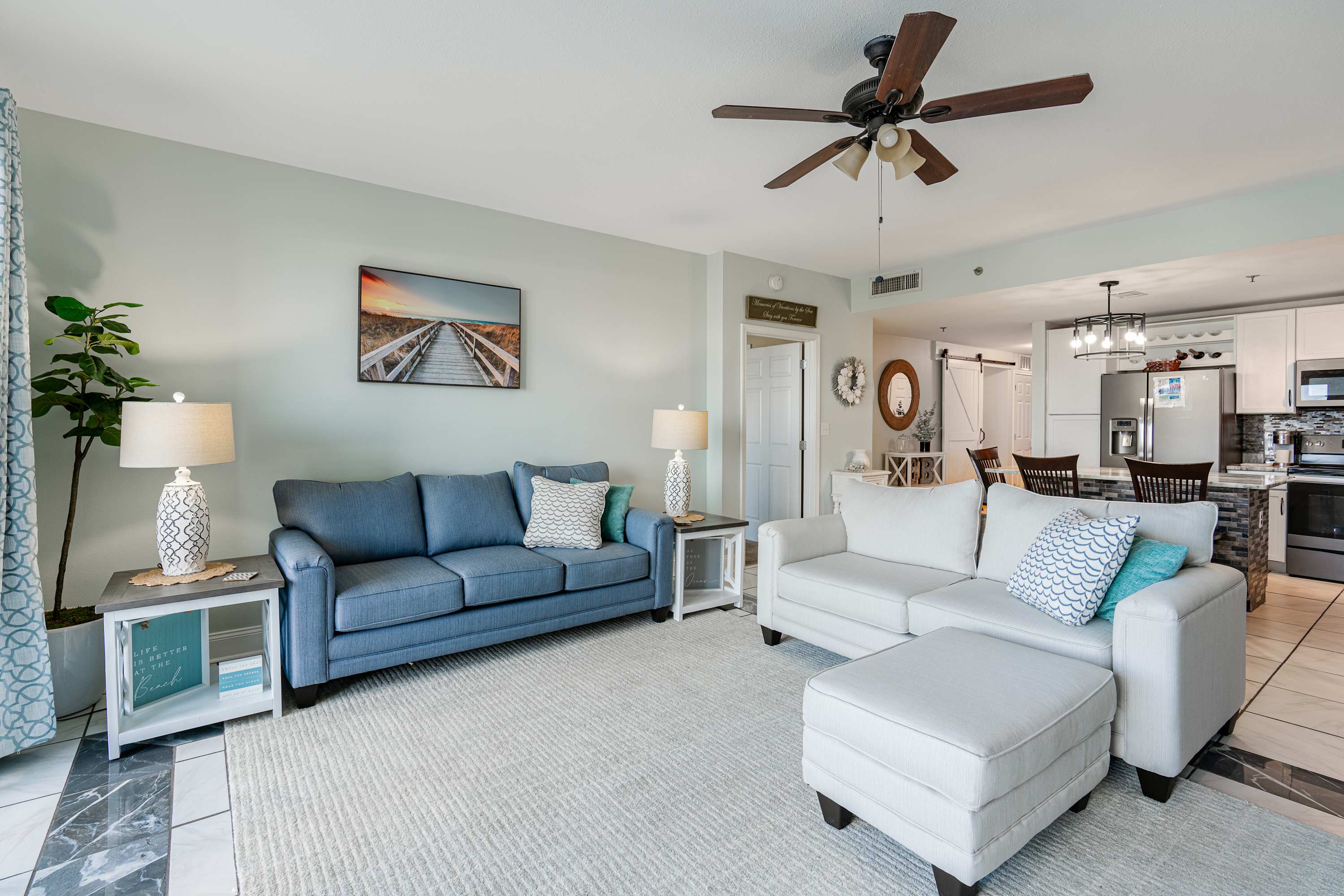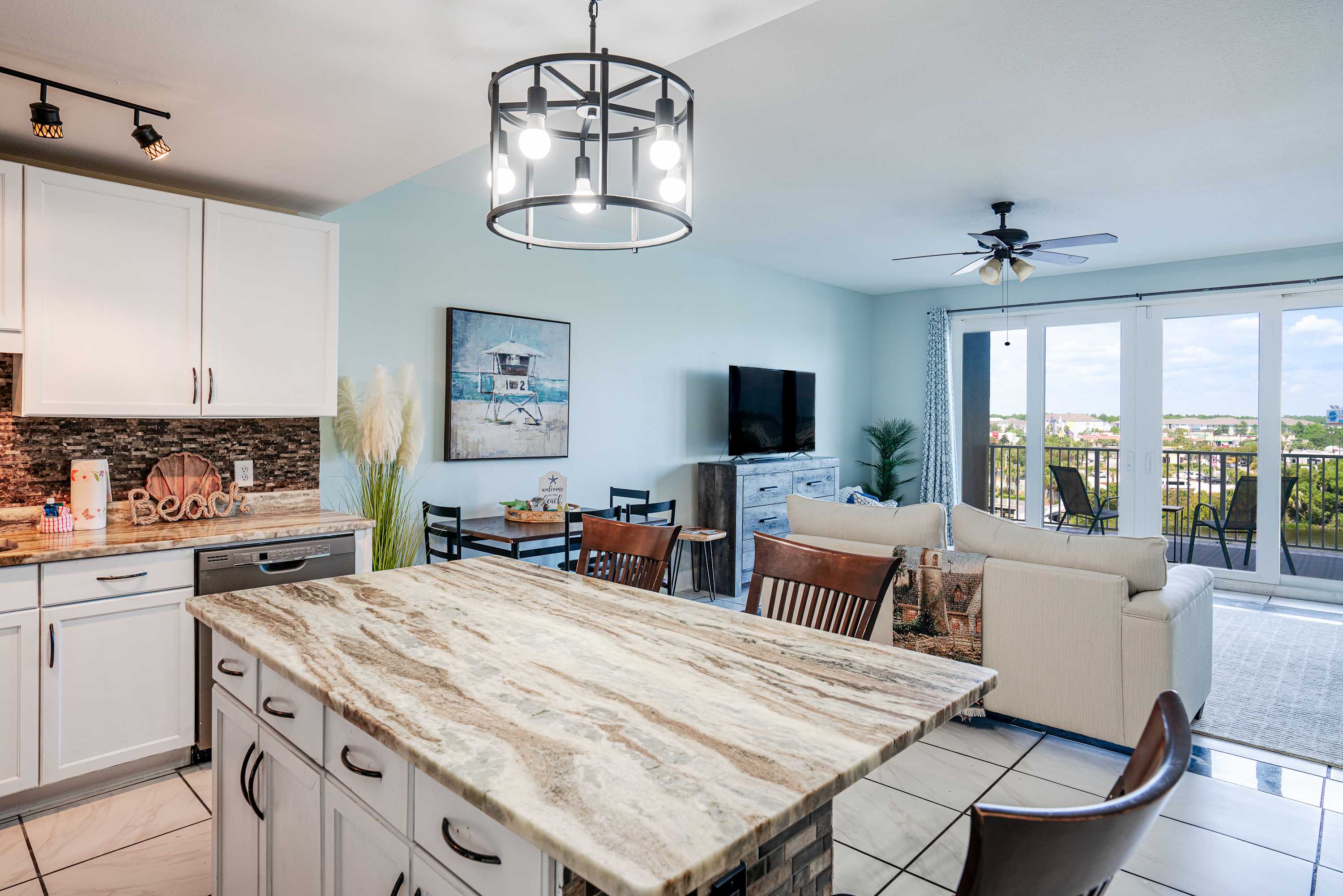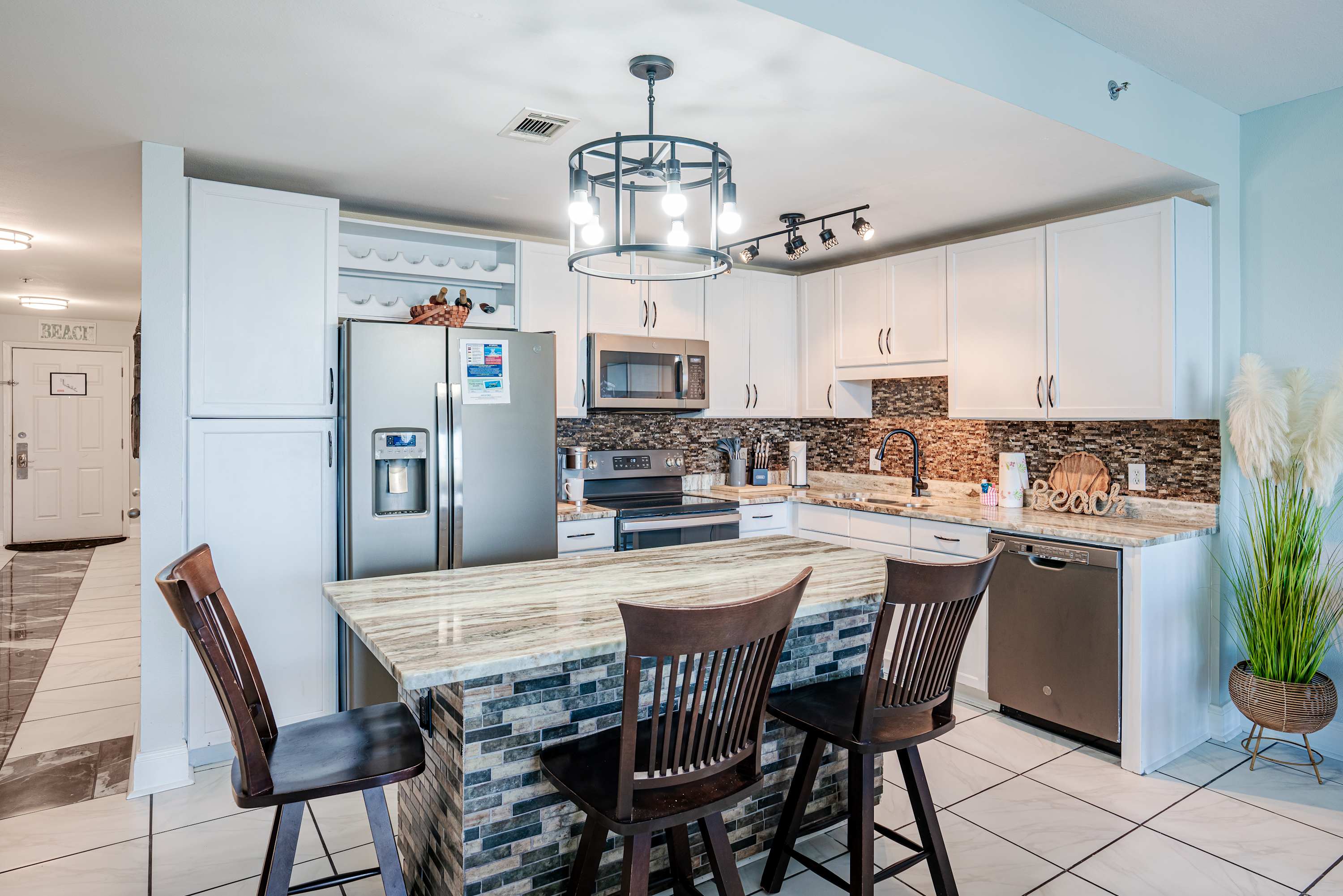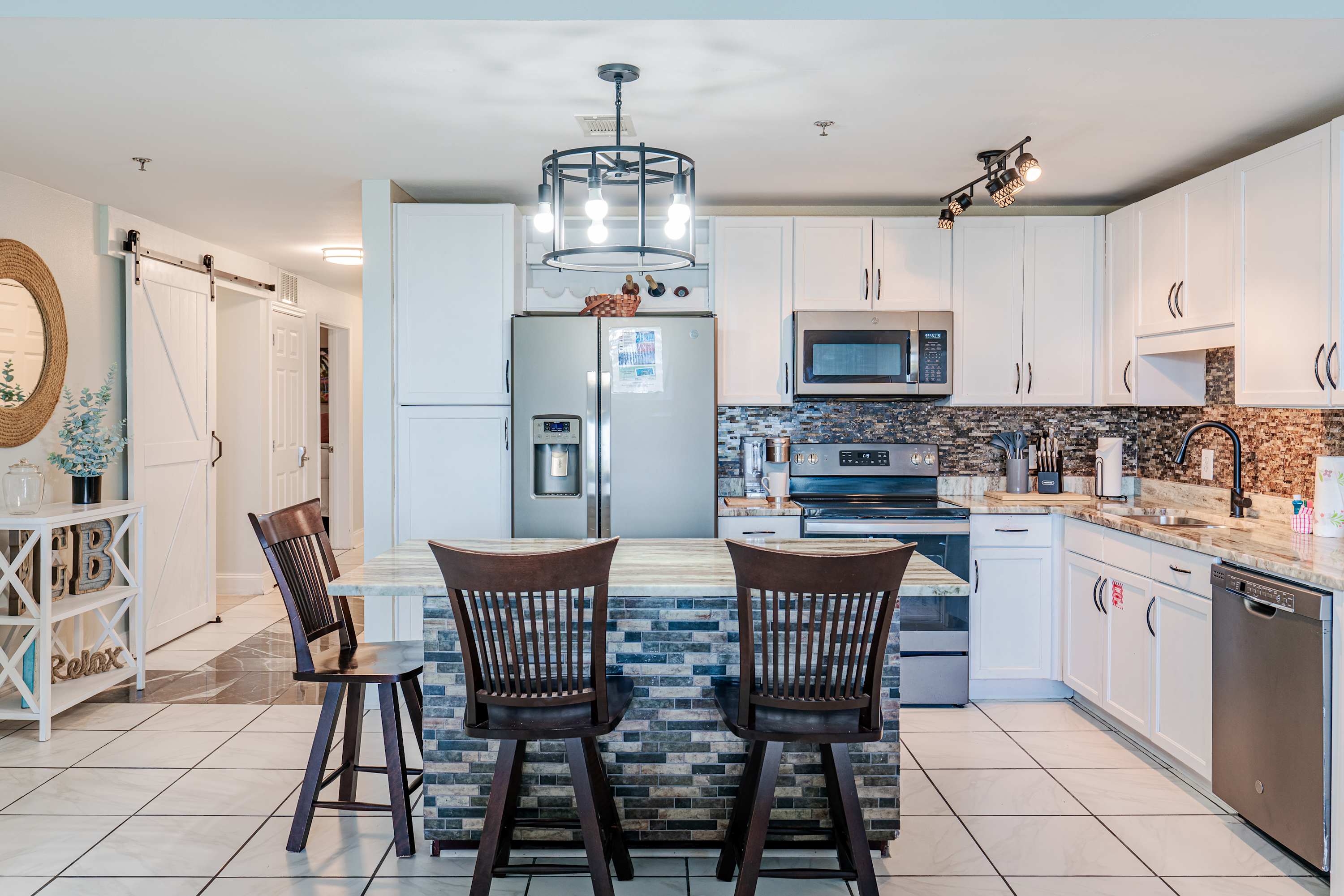 Inside, this 4th-floor home unfolds with a bright and inviting living space. The open-concept design makes it easy to flow from the living room—complete with a smart TV, plush couch, and a love seat with ottoman—into the sleek, modern kitchen. Here, you’ll find stainless steel appliances, stunning stone countertops, a Keurig for your morning coffee, and counter seating for three. Just beyond, the dining table for four creates the perfect spot for shared meals. Step onto your waterfront balcony, where plenty of comfortable seating invites you to take in panoramic views of the Gulf while sipping a drink or watching the sunset.