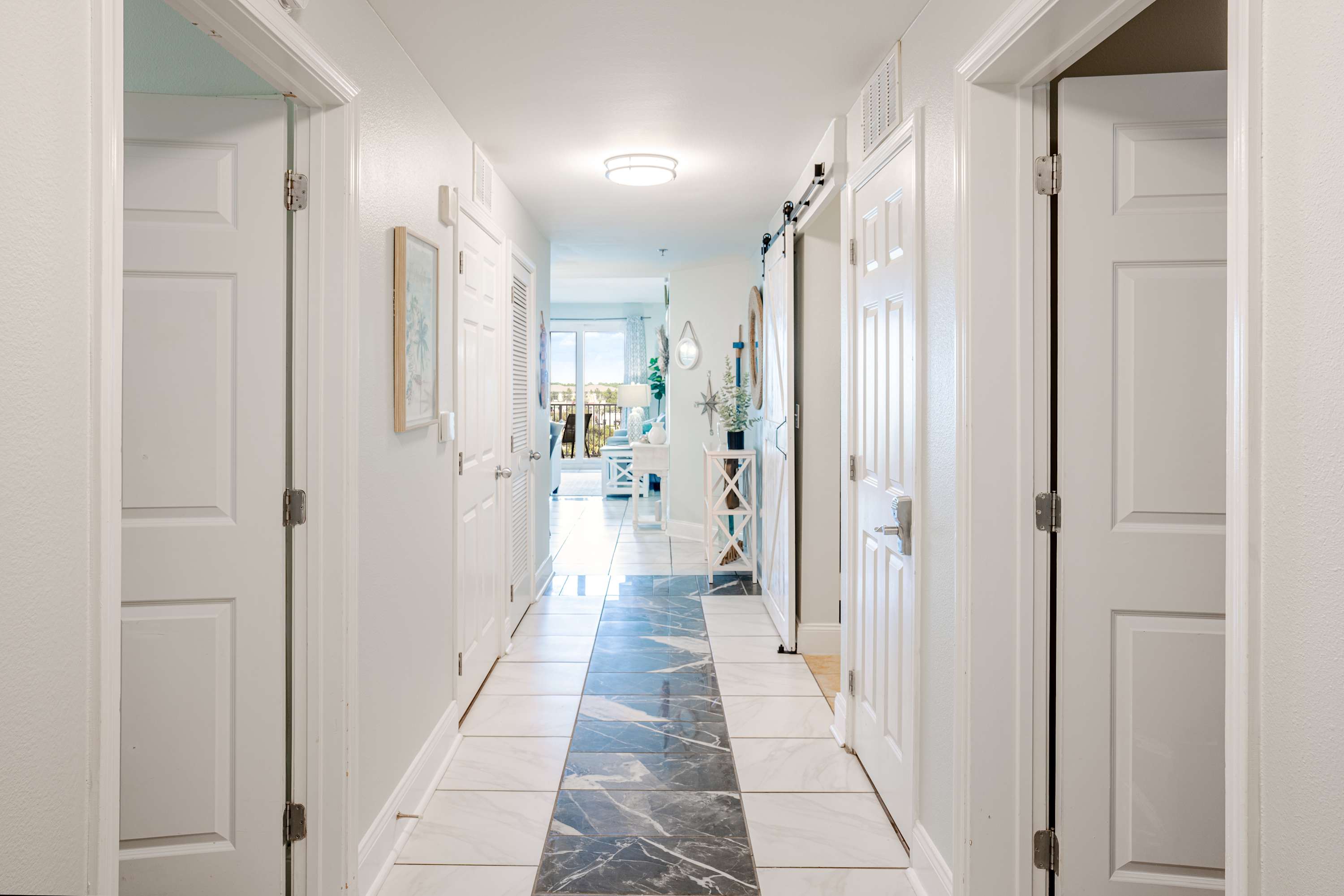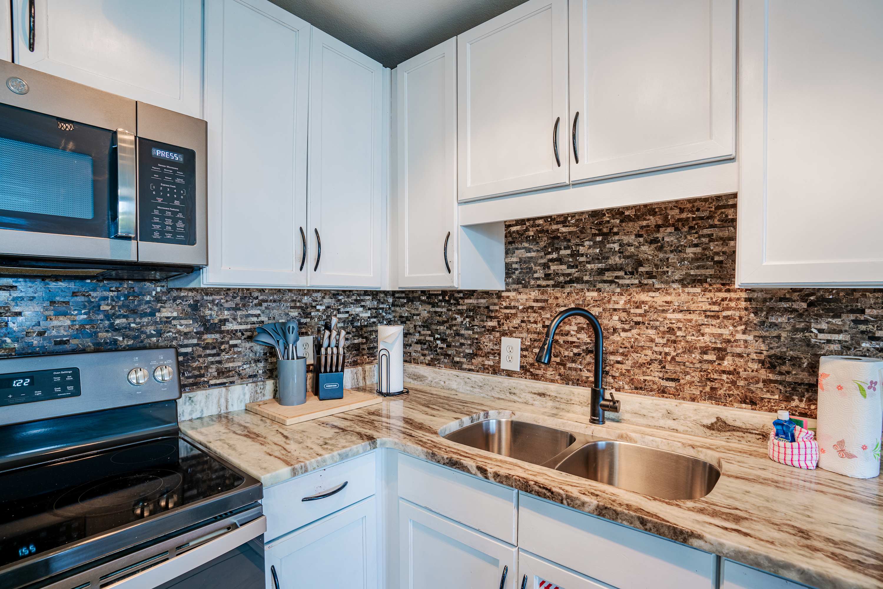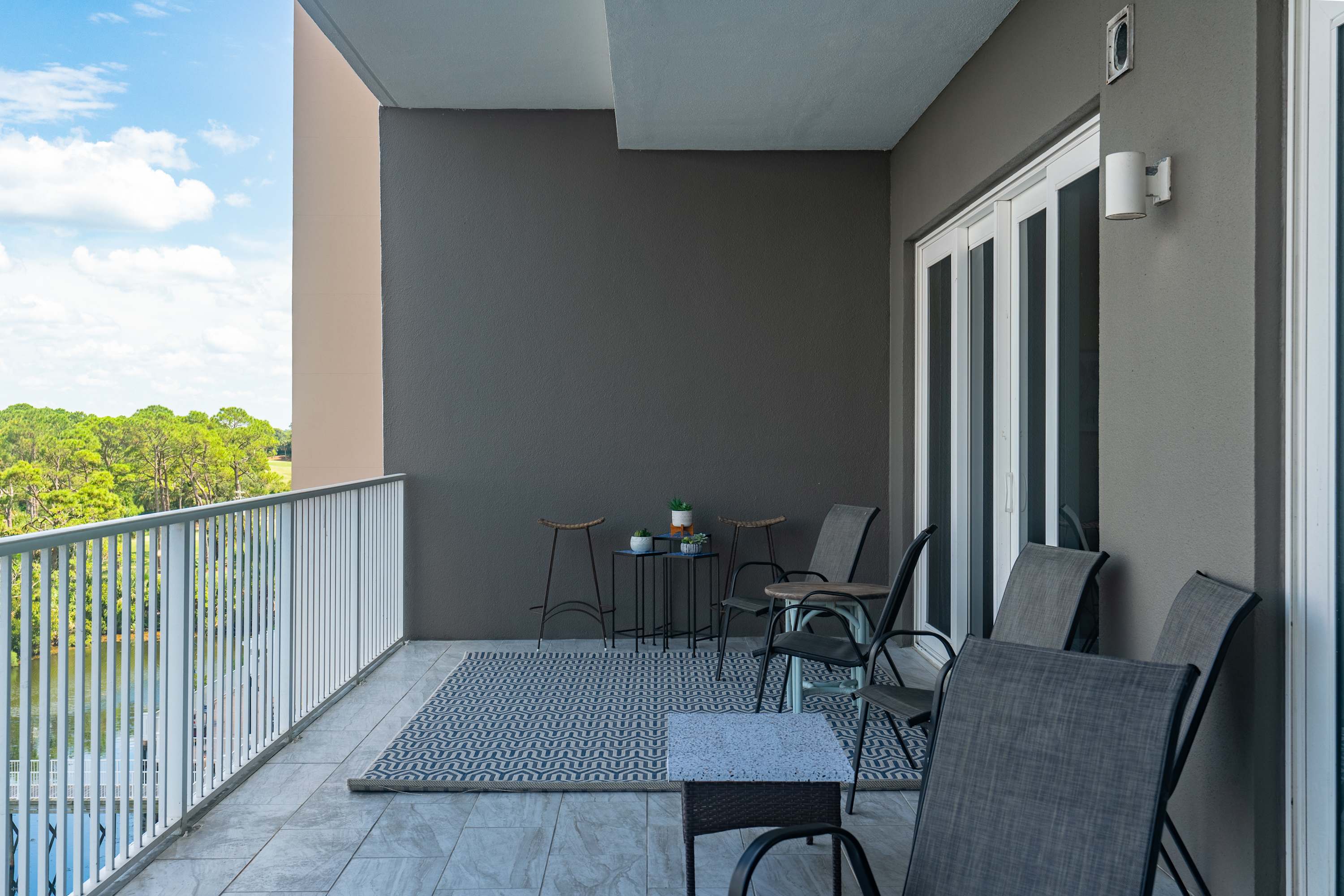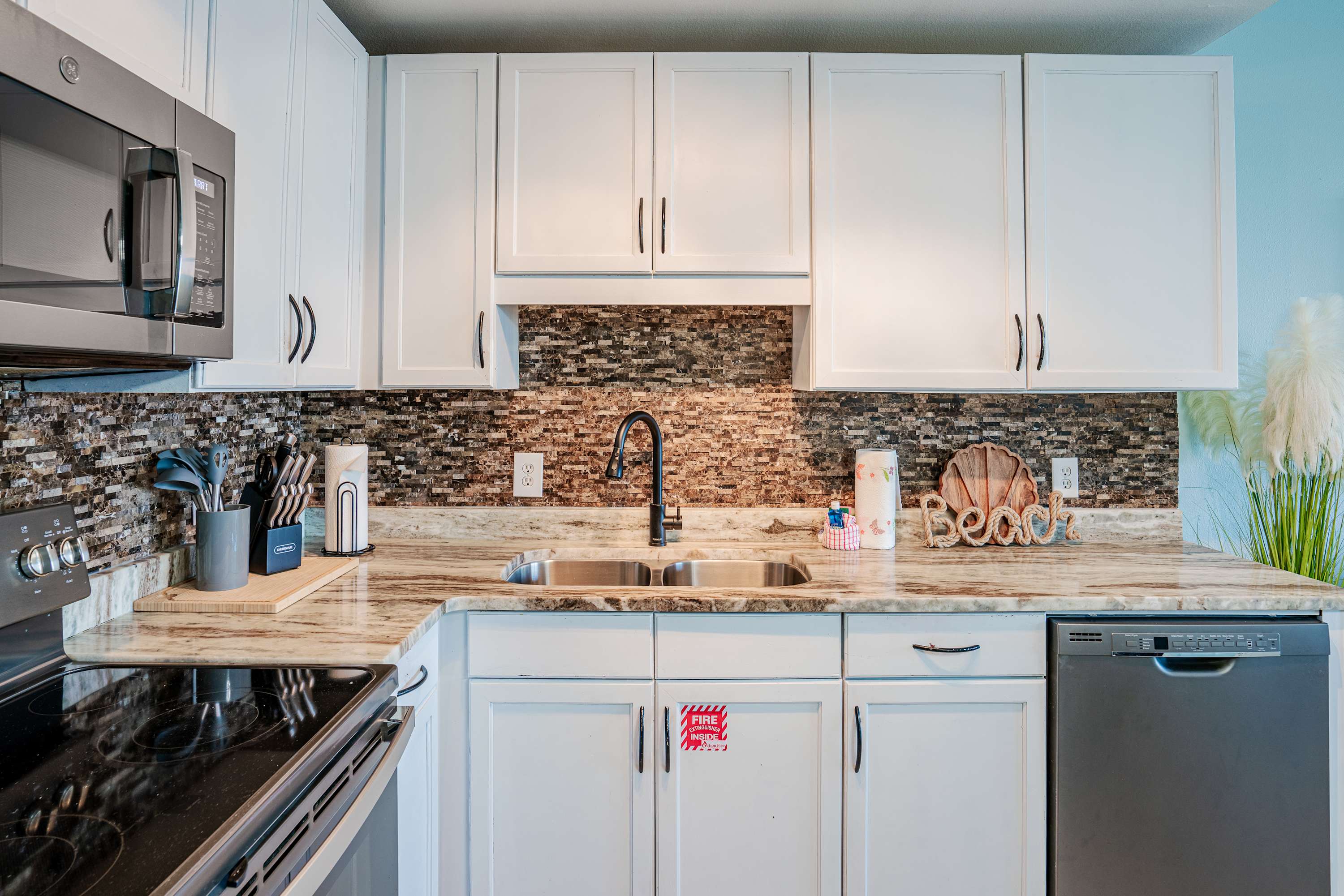 Inside, this 4th-floor home unfolds with a bright and inviting living space. The open-concept design makes it easy to flow from the living room—complete with a smart TV, plush couch, and a love seat with ottoman—into the sleek, modern kitchen. Here, you’ll find stainless steel appliances, stunning stone countertops, a Keurig for your morning coffee, and counter seating for three. Just beyond, the dining table for four creates the perfect spot for shared meals. Step onto your waterfront balcony, where plenty of comfortable seating invites you to take in panoramic views of the Gulf while sipping a drink or watching the sunset.