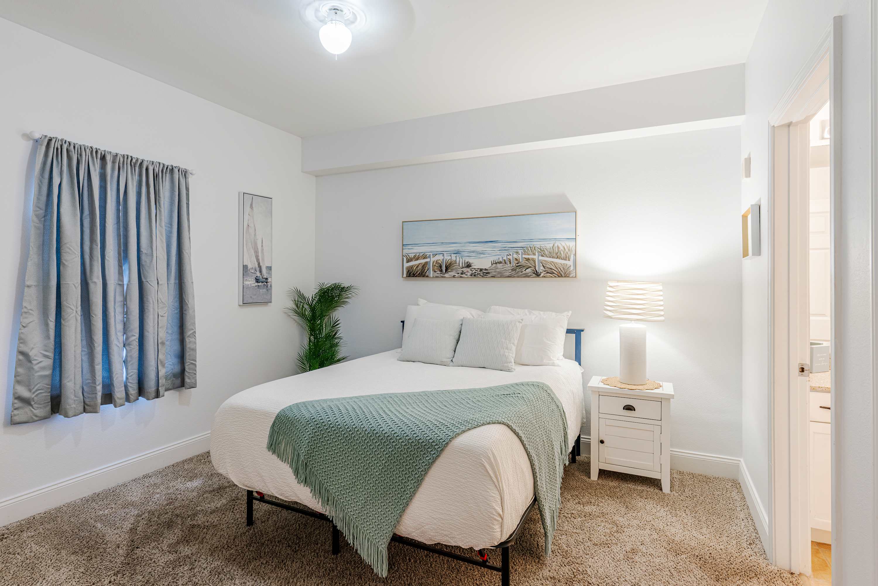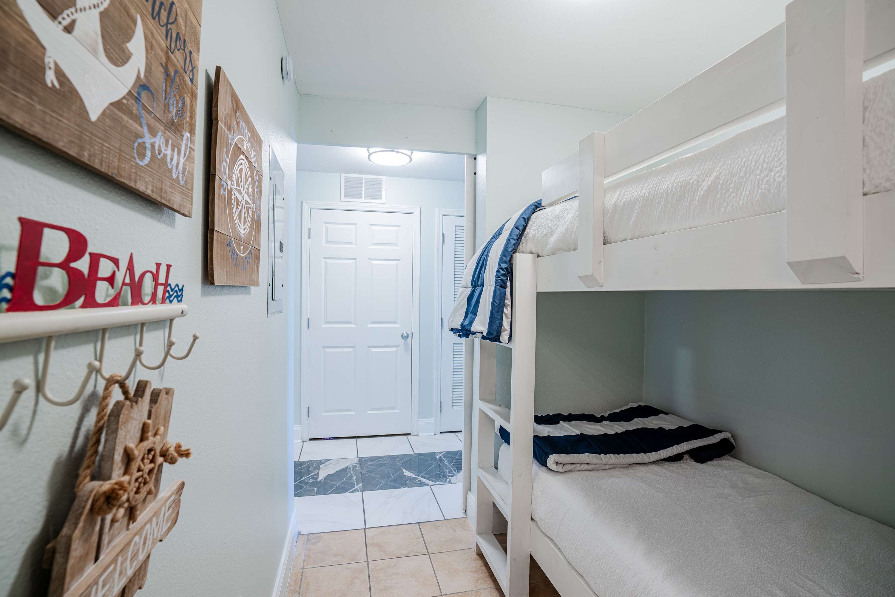 This home comfortably sleeps 8 guests between 3 private bedrooms and a set of twin-over-twin bunk beds near the bathroom hallway.
