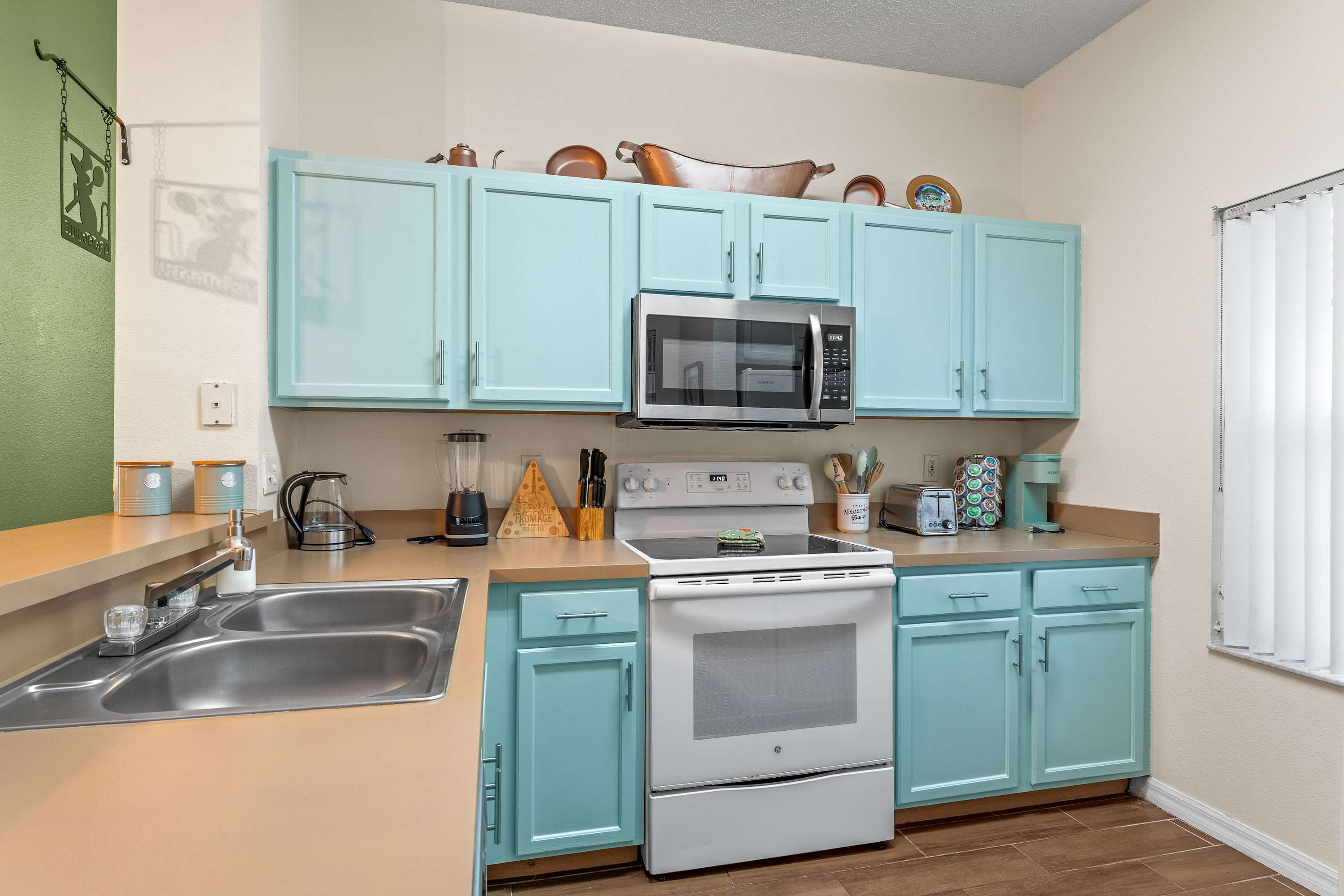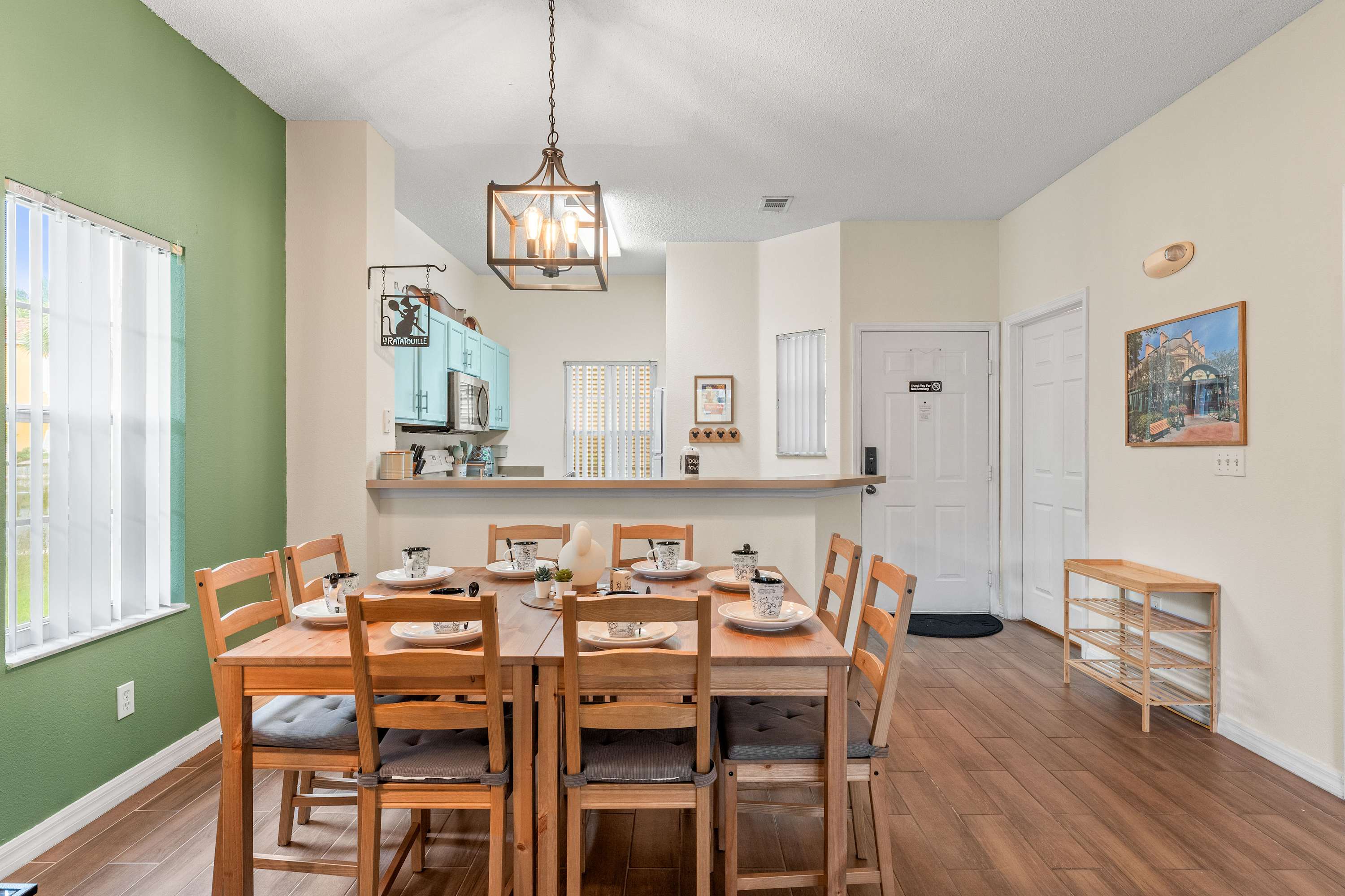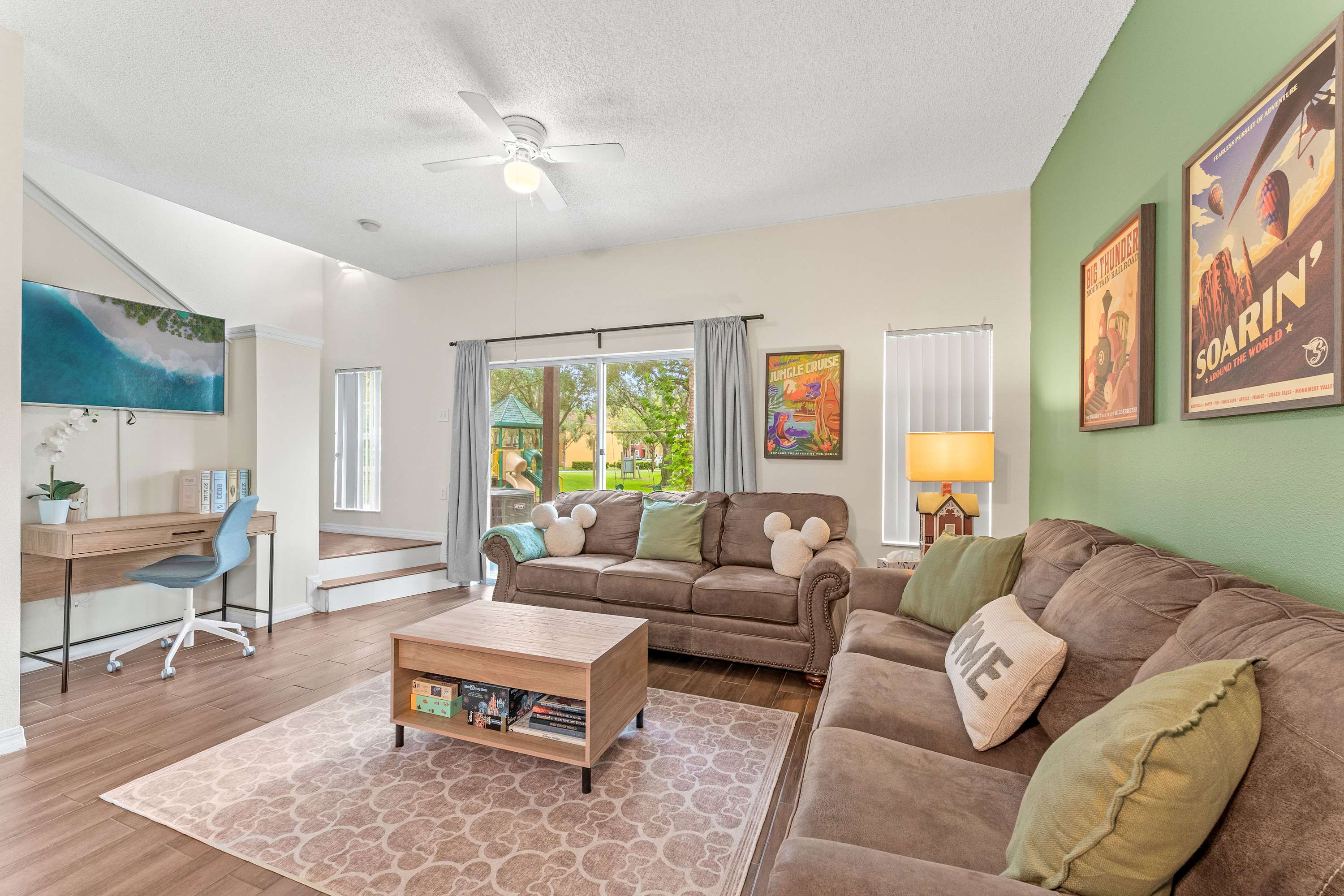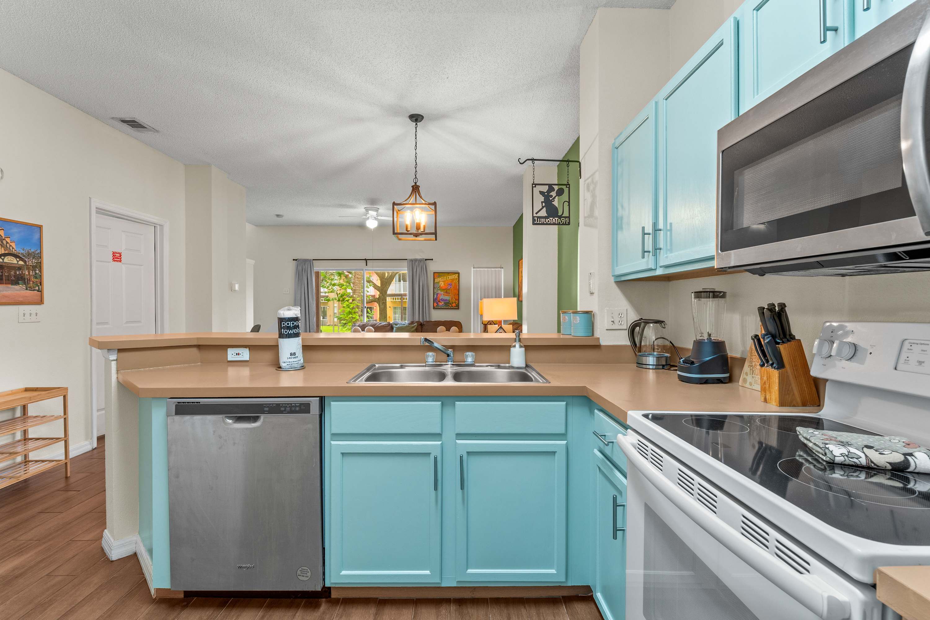 Inside your vacation home, every detail invites comfort and fun. The kitchen pairs baby blue and light brown cabinetry with modern appliances and both a drip and single-cup coffee maker, perfect for fueling your mornings. A dining table for eight sets the stage for family dinners or game nights, while the living room offers two cozy couches, a desk area for convenience, and sliding glass doors leading out to the patio.