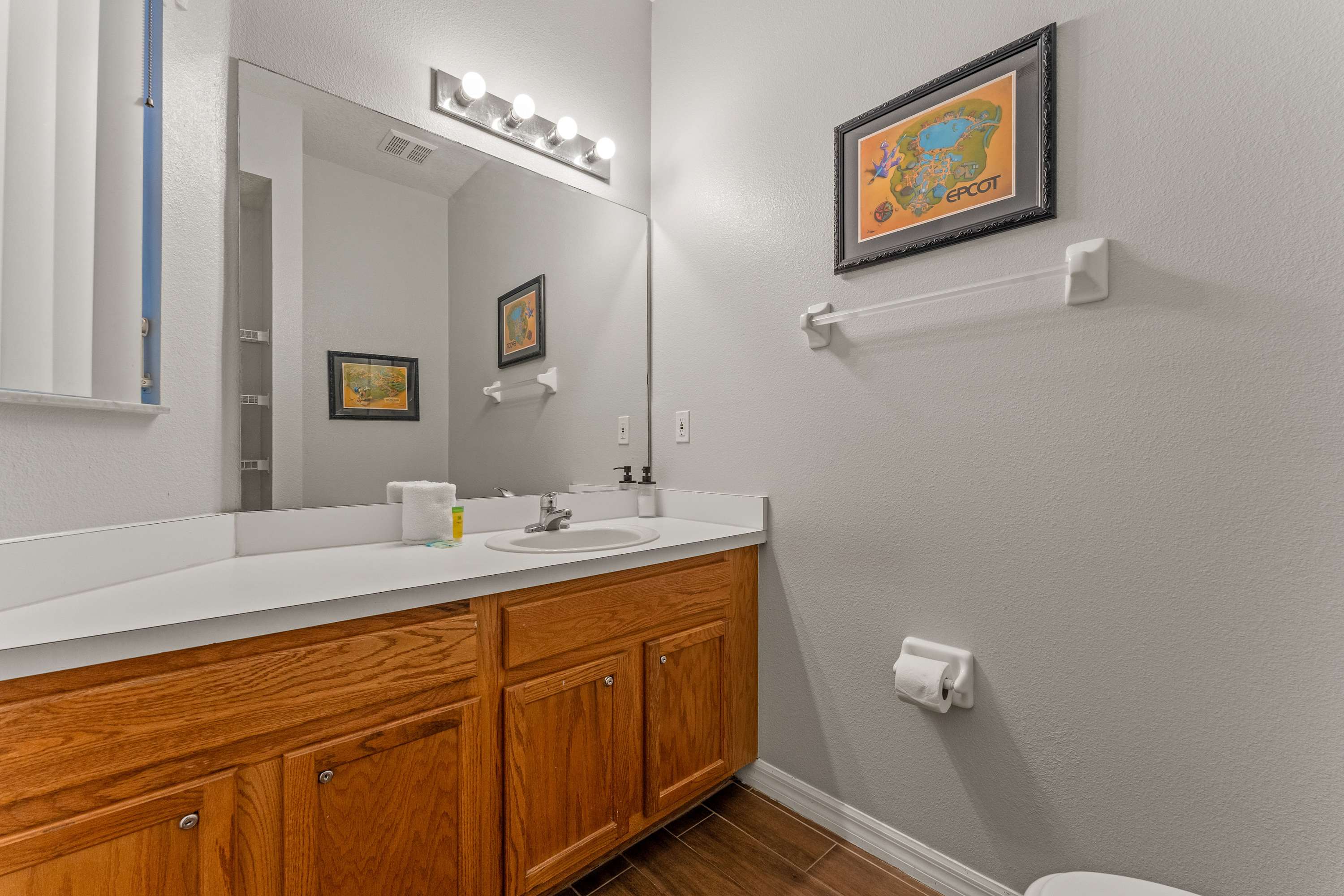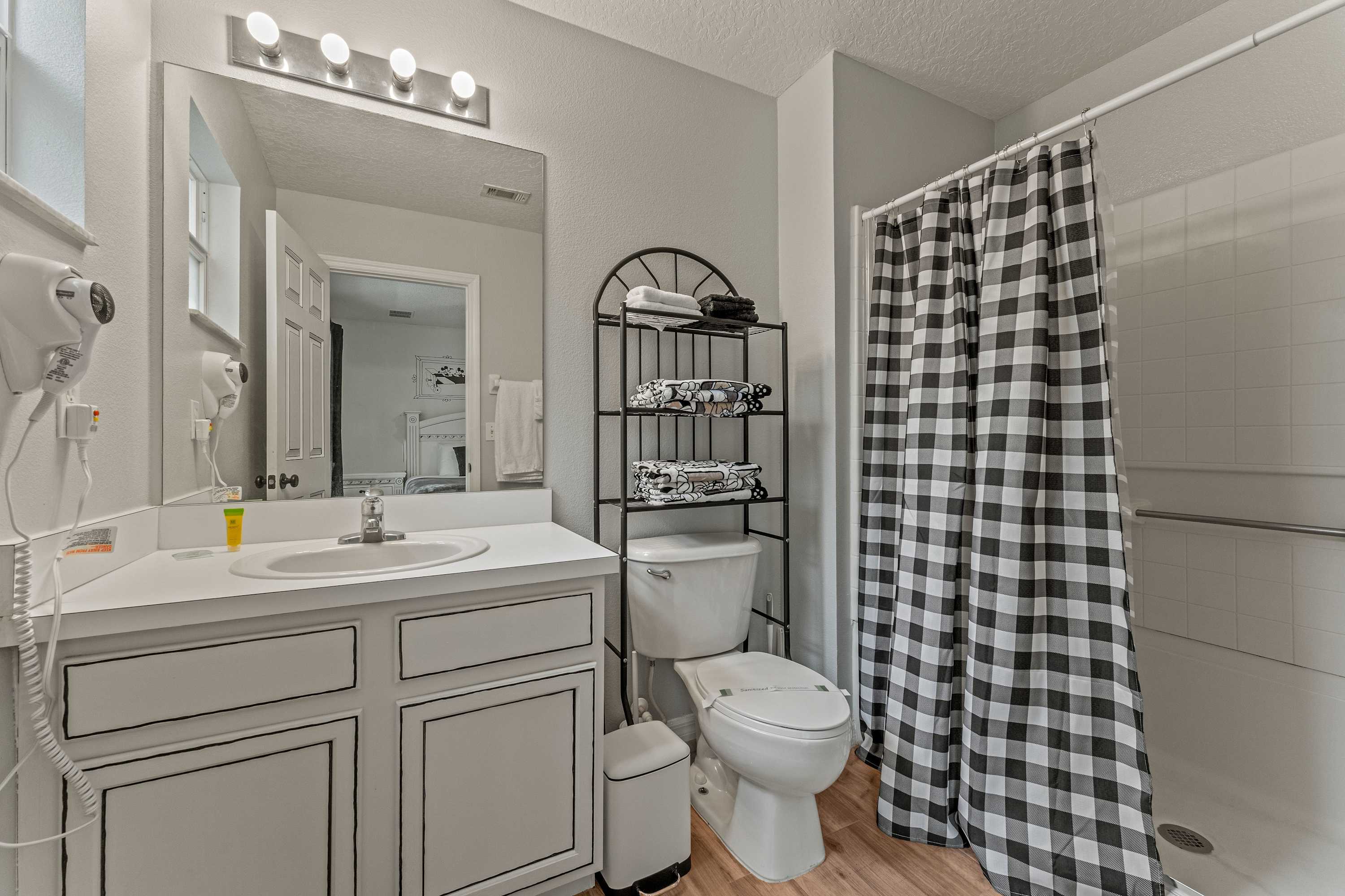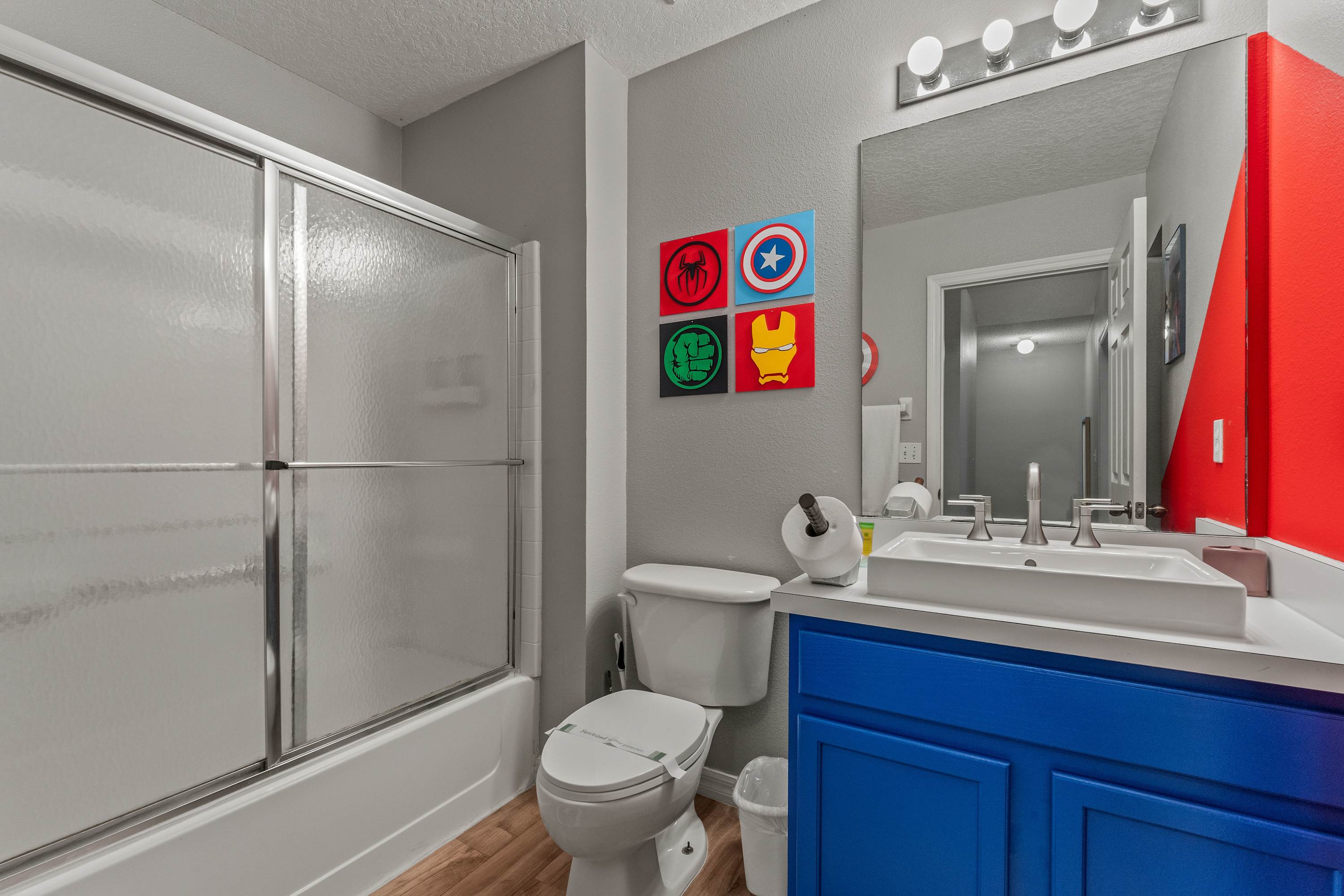 This home also includes a half bathroom and an additional full guest bathroom, Marvel themed, with a single vanity and a walk-in shower.