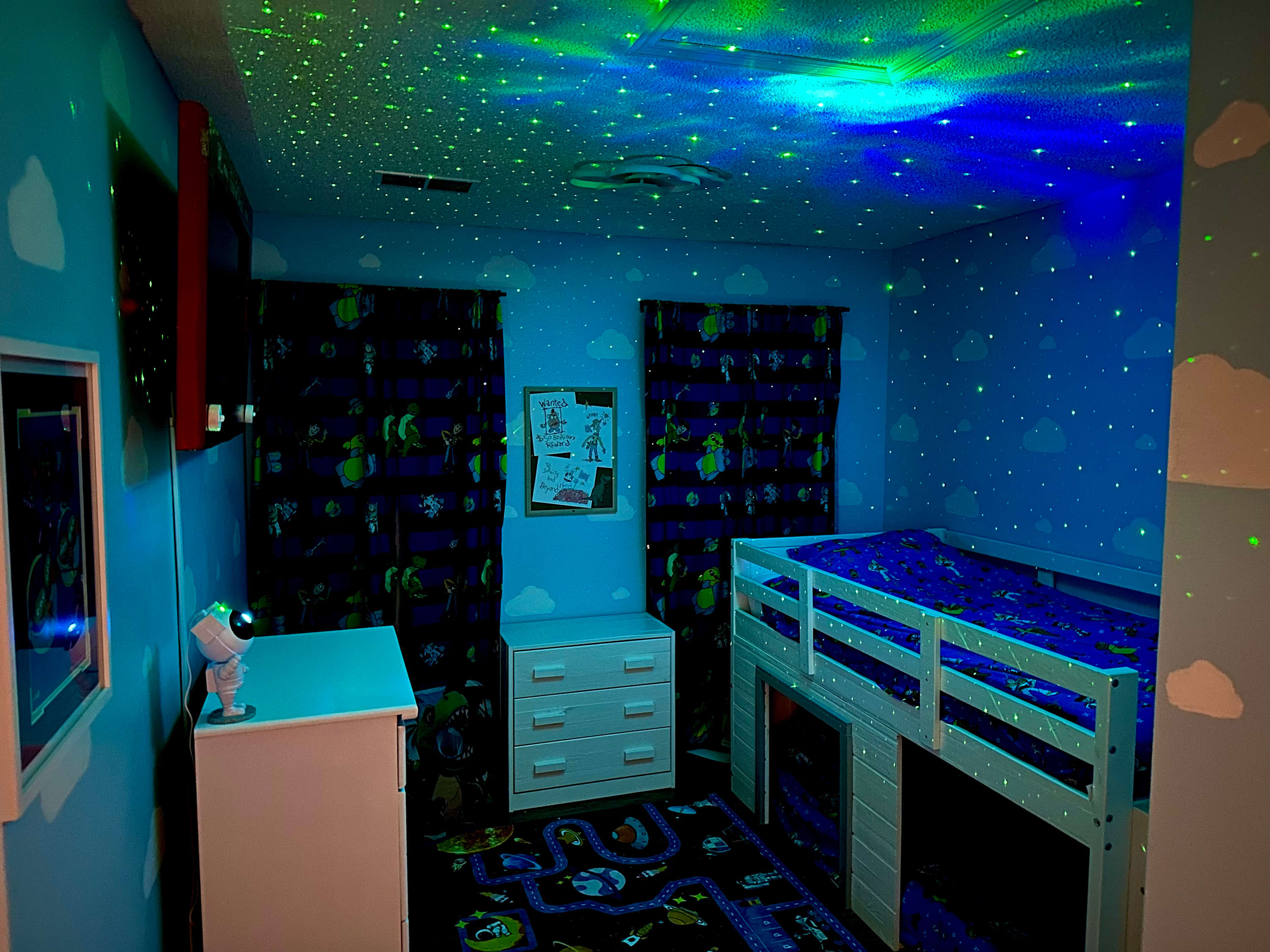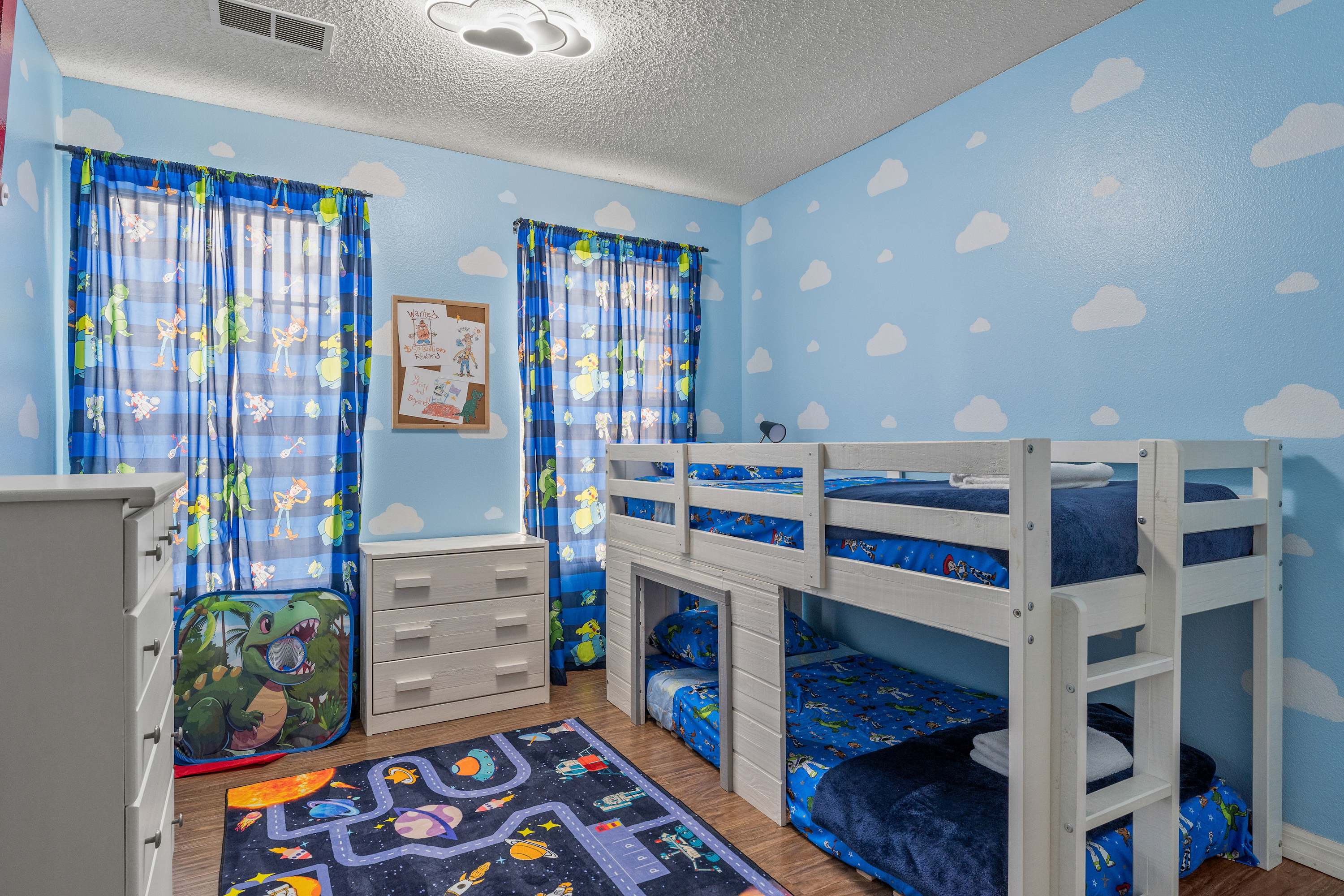 Bedroom #2 is Toy Story themed, similar to Andy’s bedroom, and includes twin-over-twin bunk beds and a smart TV.