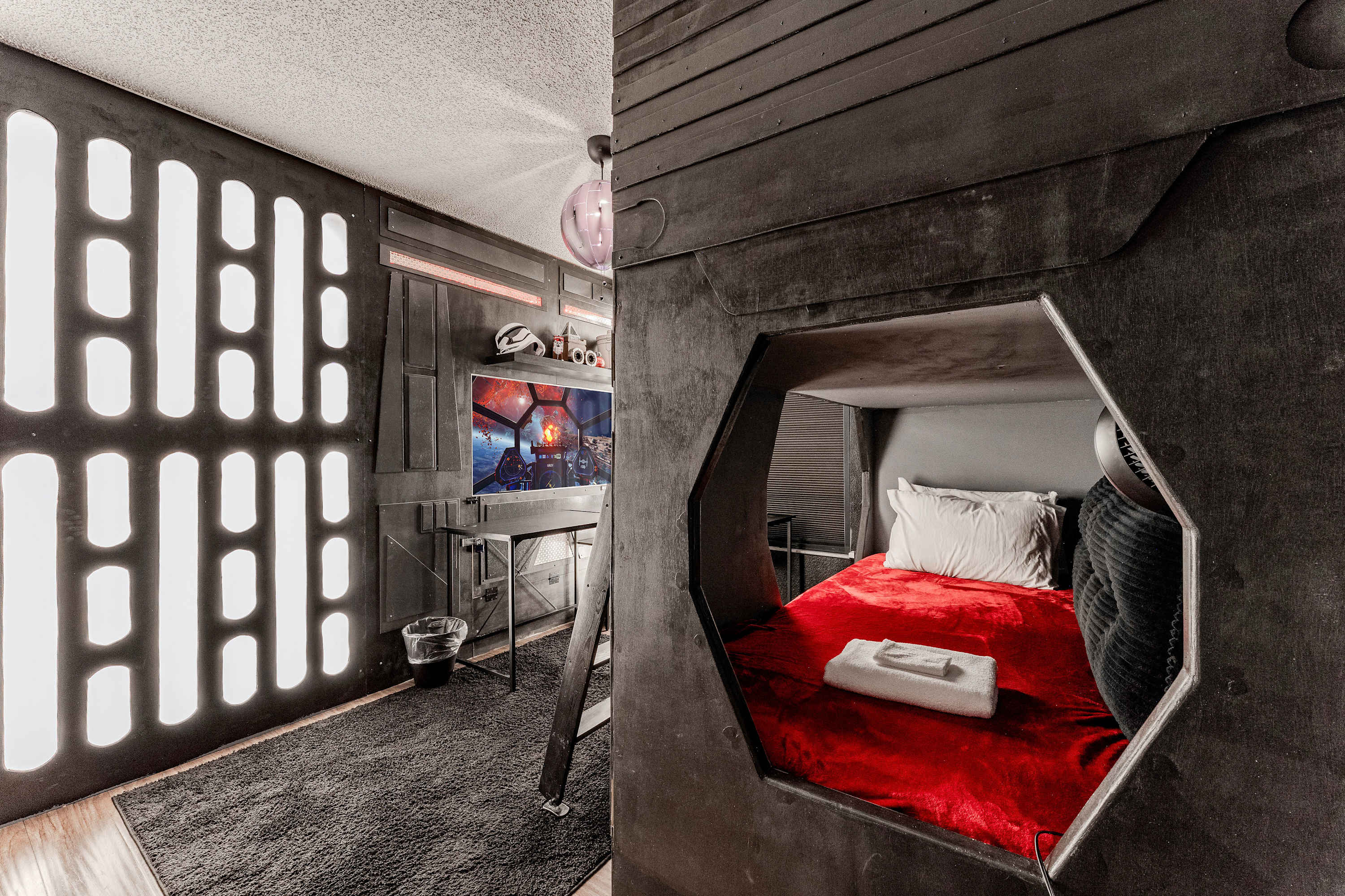 Bedroom #1 is Star Wars themed and includes custom built twin-over-twin XL bunk beds, a smart TV, and a built-in desk.